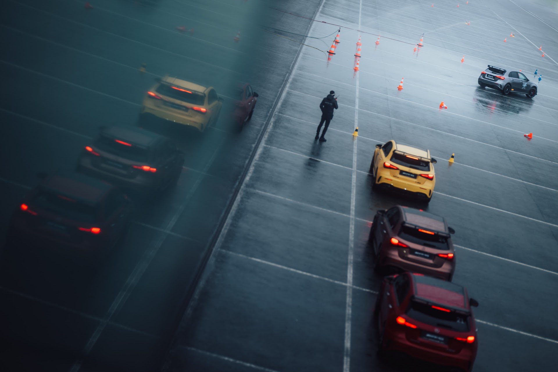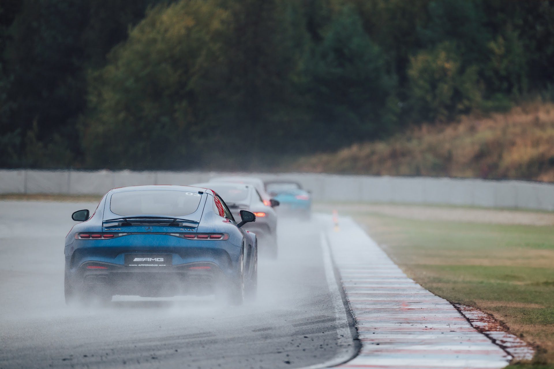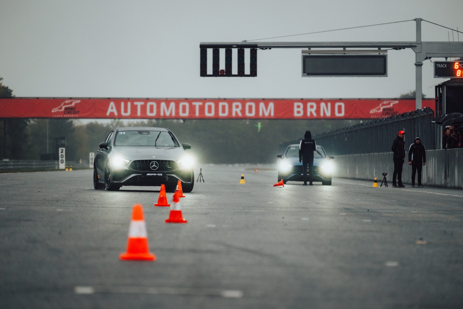 Doobedňajší program pozostáva s oboznamovaním sa s rôznymi jazdnými situáciami. V A 45 S, ktorá žiaľ budúci rok končí, sme skúšali nedotáčavý aj pretáčavý šmyk. Po precíznej práci s plynom prišiel čas na surové tlačenie brzdy. Krízové brzdenie s vyhýbacím manévrom sme robili až do rýchlosti 100 km/h a bolo zaujímavé sledovať rozdiel medzi CLA 45 a C 63 AMG, ktoré je o 300 kíl ťažšie, čo na brzdách bolo cítiť.