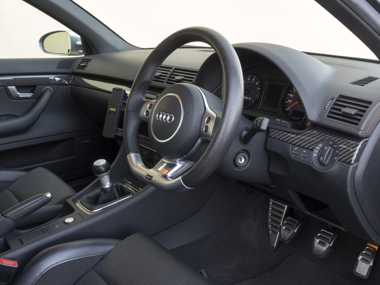 Karbónové dekory na palubnej doske, výplniach dverí a stredovej konzole zdôrazňovali dynamický charakter interiéru, pričom zákazníci si mohli vybrať aj hliníkové alebo drevené obloženie. Hliníkové pedále, RS logá na prahoch dverí a čierny stropný obklad dopĺňali exkluzívnu atmosféru. Audi ponúkalo interiér v čiernom prevedení s možnosťou kontrastného prešívania, čím ešte viac zvýraznilo športovú DNA modelu RS4.