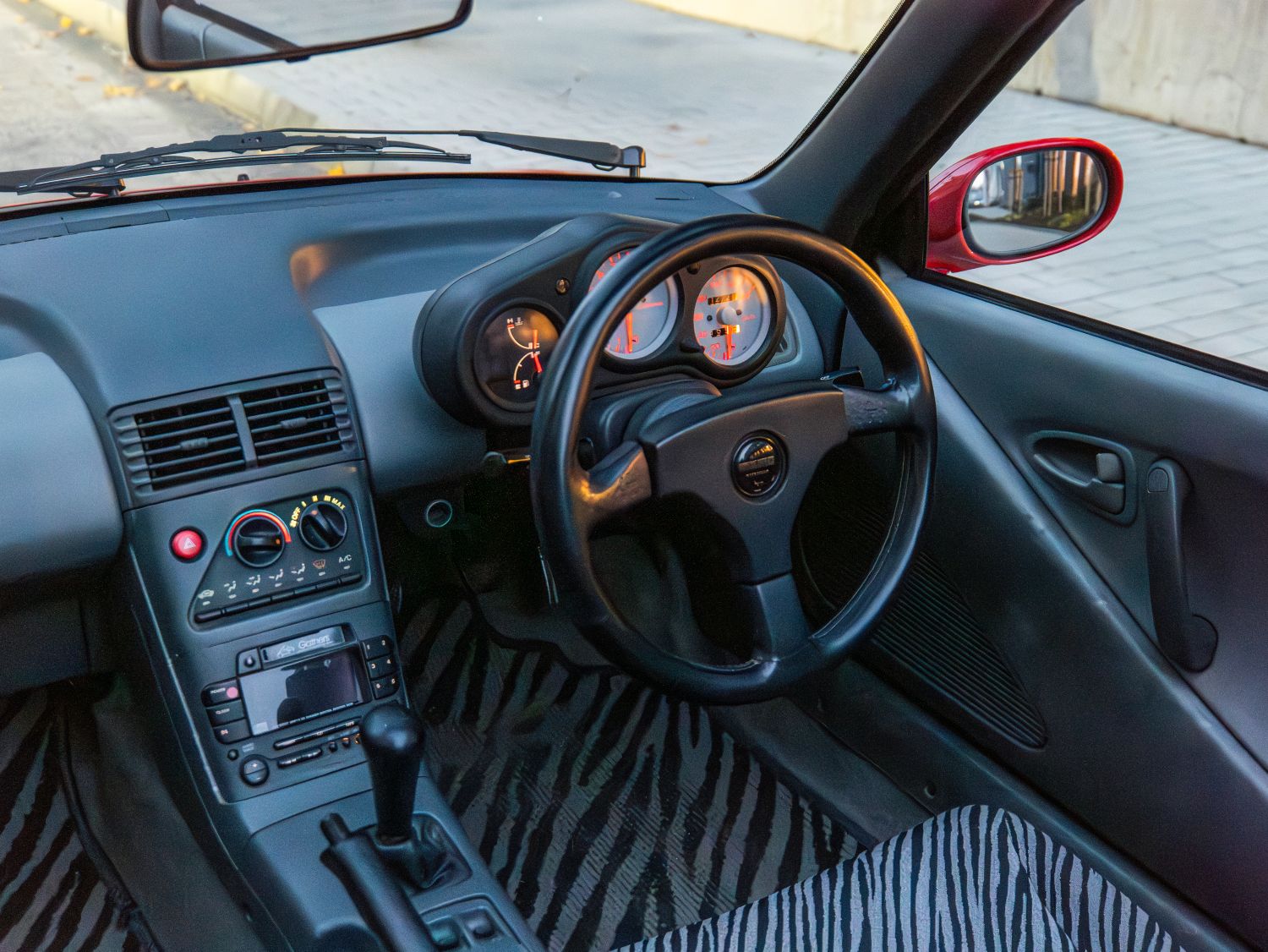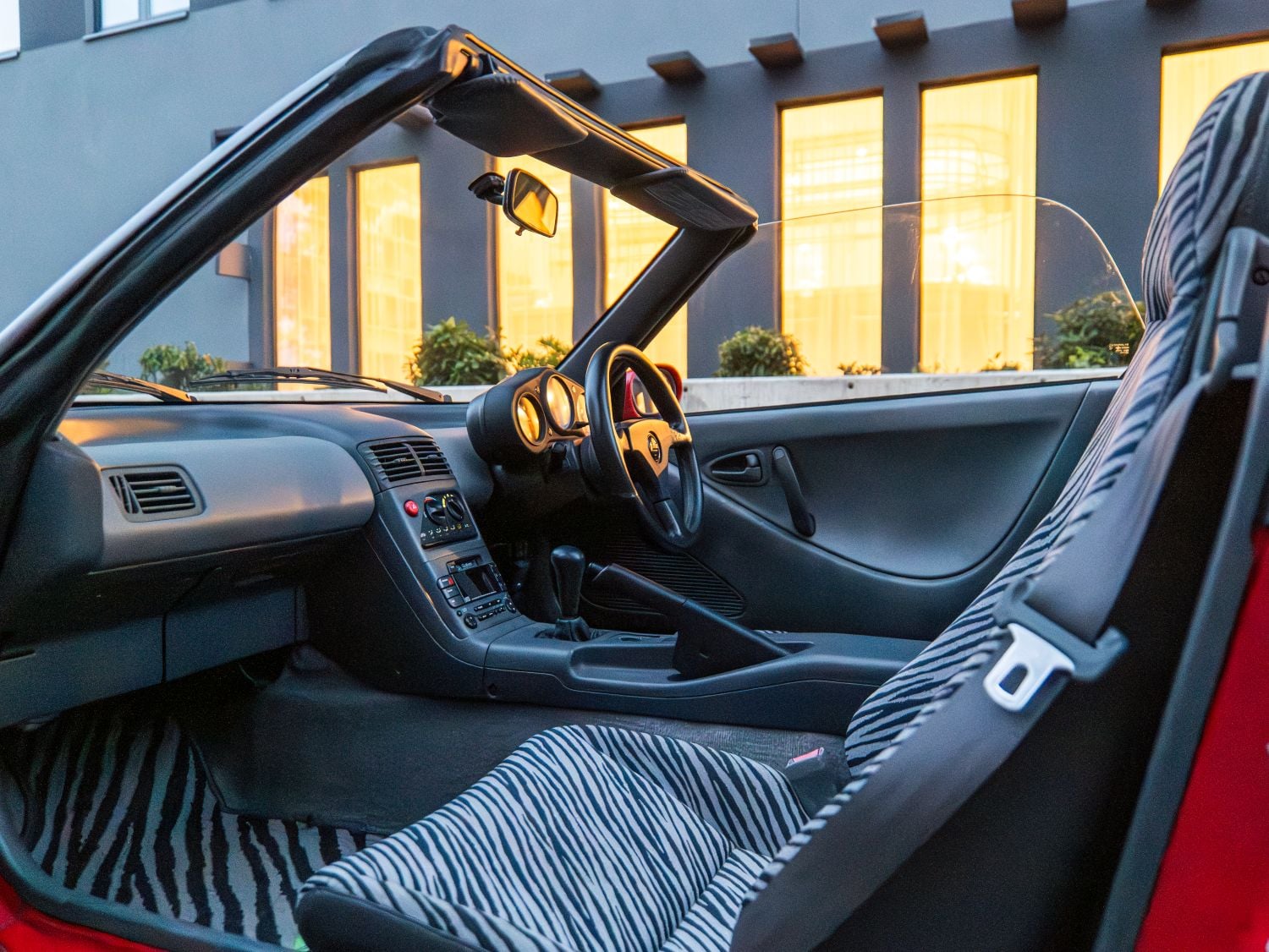 Stredová konzola je tvarovaná asymetricky – vodič má o niečo viac priestoru ako spolujazdec. Tento detail nie je náhodný, Beat bol navrhnutý ako auto pre vodiča, nie ako kompromis pre dvoch. Sedadlá sú úzke, ale tvarované tak, aby podporovali športový posed. Zebra poťahy, ktoré sa stali ikonickým prvkom modelu, dodávajú interiéru hravý charakter a odlišujú Beat od konzervatívnejších konkurentov.