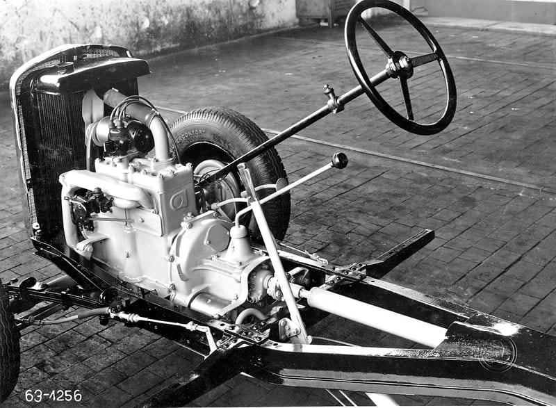 V strede bol uskladnený tunel s kardanom, na ktorom boli dva priečne nosníky pre uchytenie karosérie. Motor bol ukrytý vpredu a prevodovka spolu s kardanom vzadu. Tohto konceptu uloženia sa Škoda držala až do konca 50-tych rokov, kedy začali naši západní susedia pracovať na vývoji Škody 1000 MB, ktorá mala motor uložený vzadu a samonosnú karosériu.