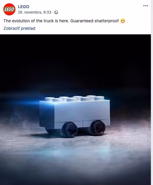 K Cybetrucku sa vyjadril dokonca aj najväčší svetový výrobca pneumatík, presnejšie jeho barzílska pobočka. Ak si myslíte, že je to GoodYear alebo Pirelli, mýlite sa. Najviac pneumatík na svete bezkonkurenčne vyrába Lego. Na jeho facebookovom profile sa objavila kocka legendárnej stavebnice so štyrmi kolesa a nápisom – Zaručene nerozbitné.