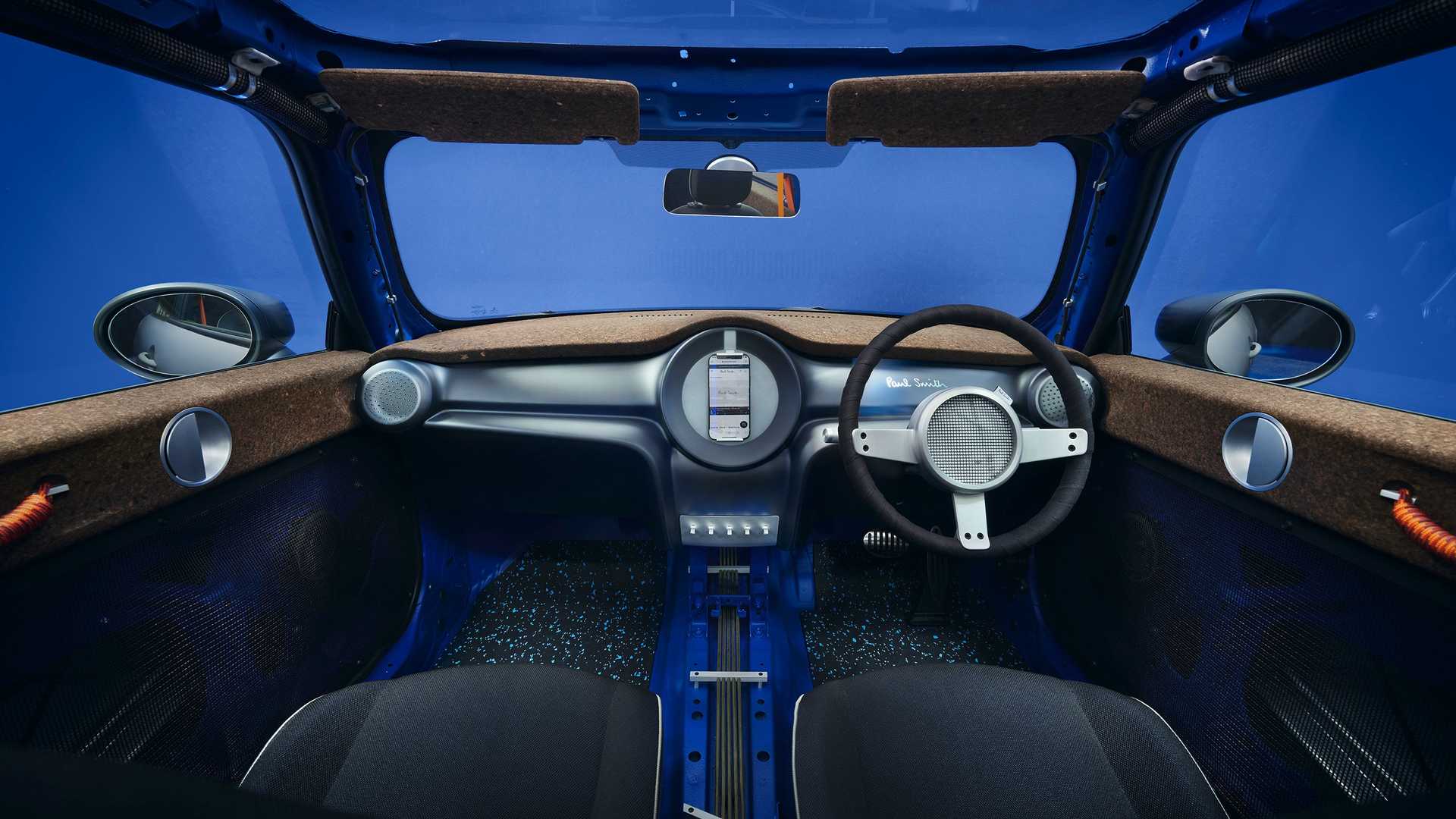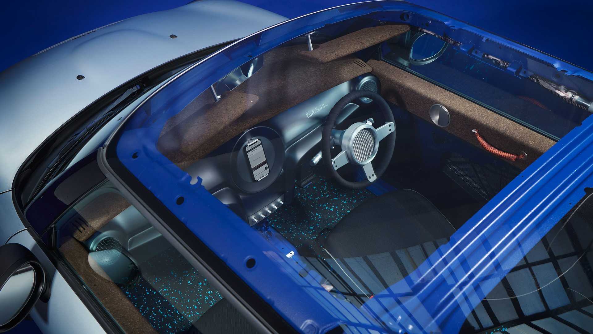 Vo vnútri sa nachádza aj presklená panoramatická strecha z recyklovaného Perspexu. Rovnaký materiál však bol použitý aj na kryty kolies. Interiérové časti naschvál chýbajú. Odhalené miesta sú nalakované kontrastnou modrou farbou. Nad hlavou je ukrytý aj airbag, na ďalších miestach vidno poprepletané káble.