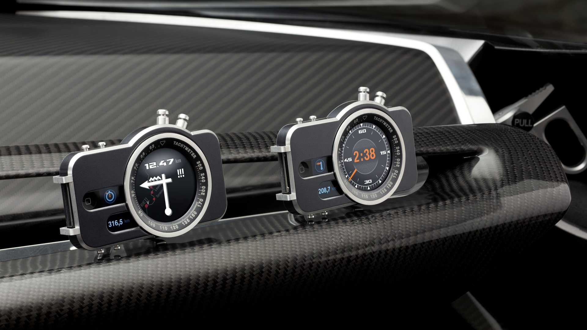 Prístrojový panel vychádzajúci z kokpitu zobrazuje okrem otáčok motora aj teplotu oleja, tlak oleja a teplotu vody. Tak ako je to typické pre športové auto. Prístrojový panel napravo od otáčkomera dopĺňajú kontrolky a ukazovateľ bodu radenia. Dva iPhony v špeciálnych držiakoch na prístrojovej doske preberajú ďalšie zobrazovacie funkcie pre vodiča a spolujazdca. Okrem toho sú uložené v hliníkovom kryte rovnako ako prístrojová doska.