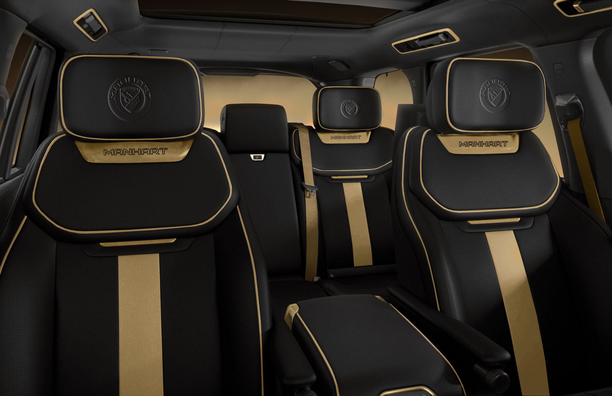 V tomto odtieni sa taktiež nachádzajú masívne kolesá a zlaté ozdobné prvky budeme môcť nájsť na maske chladiča spolu s okolím difúzora. Zmenou prešlo taktiež aj výfukové potrubie zakončené štvoricou hranatých koncoviek. Logo úpravcu Manhart nahradzuje znaky Range Rover a Land Rover naprieč celým autom. Čierno-zlatá kombinácia nedominuje iba exteriéru ale aj priamo interiéru. Ten Manhart prečalúnil aby doplnil zvyšok auta.