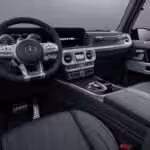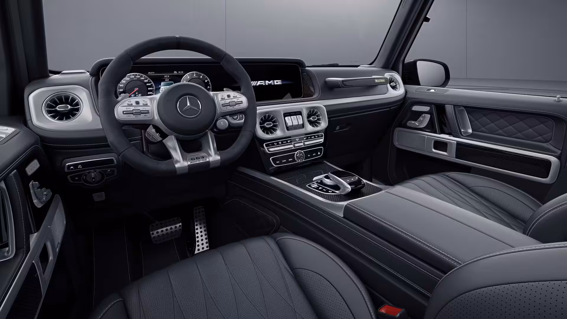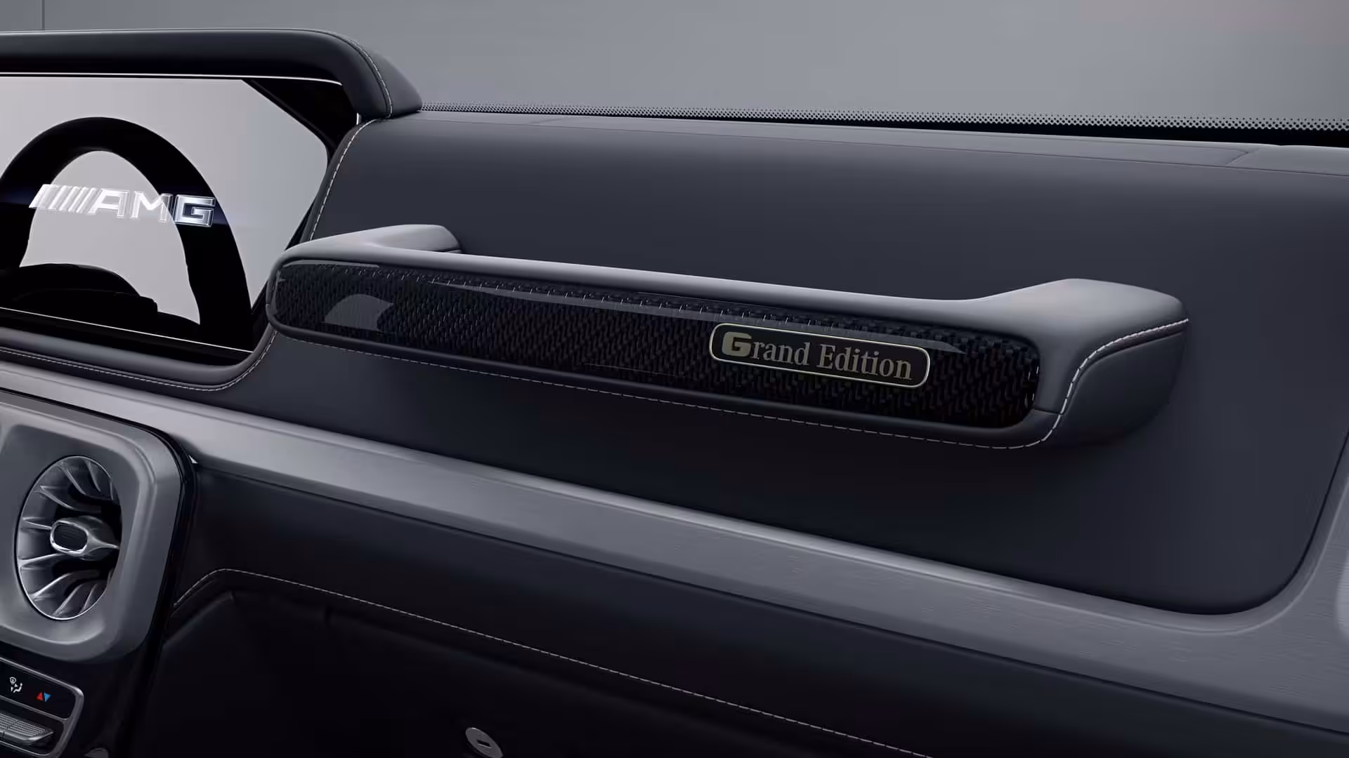 Interiér, tak ako aj jeho zovňajšok, je odetý do tmavých odtieňov so striebornými doplnkami. Práve vďaka použitiu takýchto typov vyniknú zlaté akcenty. Primárne ide o prešívanie na kožených sedadlách zo vzorkovníka G Manufaktur doplnených farebným logom Mercedesu na operadlách. Kontrast je taktiež badateľný na karbónovom lemovaní dekoru pred spolujazdcom s plaketou edície. Vnútorné madlá sú na prekvapenie celokožené. Pocit výnimočnosti taktiež pripomenie pri nastupovaní svetelný nápis „Grand Edition“.