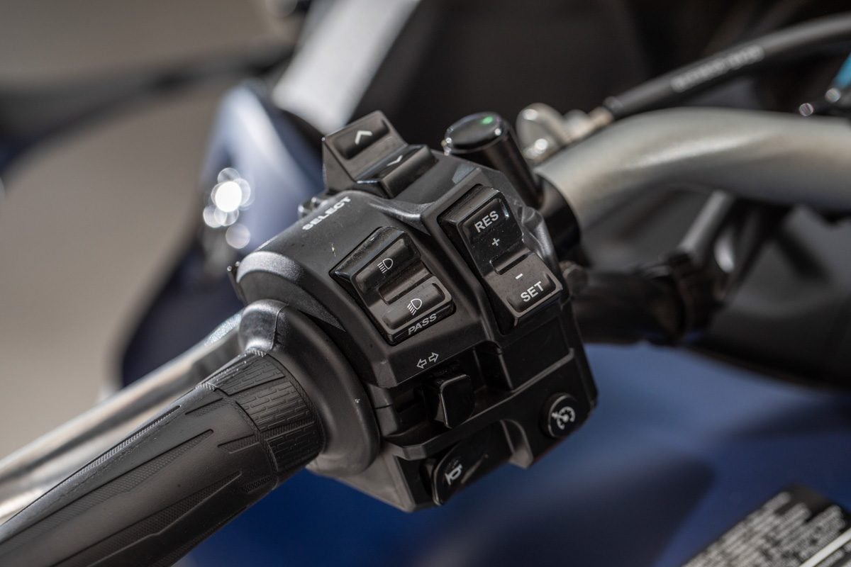 Vo výbave je dvojica bočných 25-litrových kufrov z polomäkkého plastu. A ako už pri vyšších triedach býva zvukom, máte k dispozícii aj tempomat, vyhrievané rukoväte, niekoľko režimov palivových máp a nastaviteľnú trakčnú kontrolu v dvoch stupňoch s možnosťou ju úplne vypnúť.