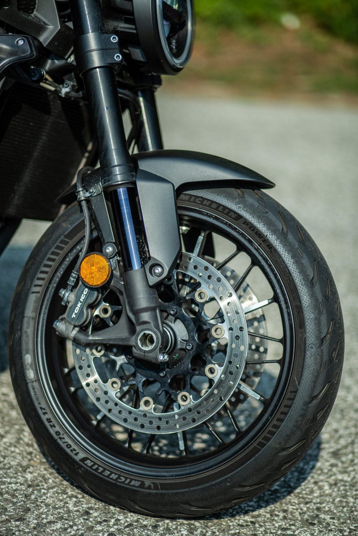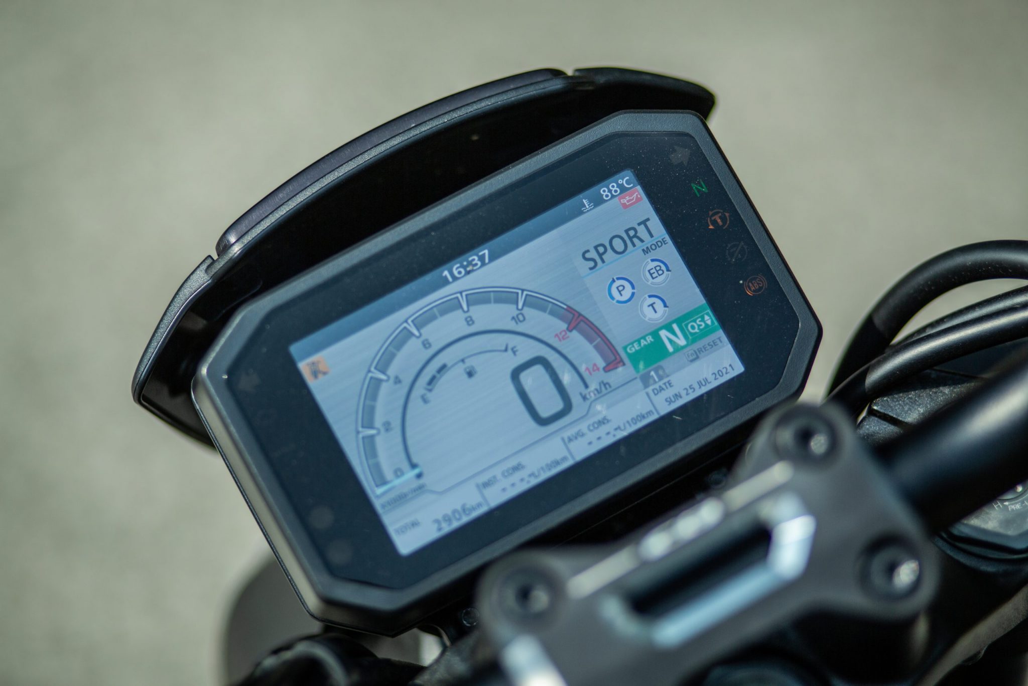Váha CB-čka je 214 kilogramov a objem palivovej nádrže je 16,2 litra. Osvetlenie je samozrejme Full LED a predné smerové svetla vám slúžia aj ako pozičné, čo pri nových Hondách je už štandardom. O prenos všetkých potrebných informácii sa vám postará zase 5 palcový TFT displej. Ten je prehľadný a podľa mňa lepšie čitateľný ako ten pôvodný ktorý môžete nájsť aj na CB650R či CBR650R. Všetky informácie sú prehľadne usporiadane presne na tom mieste na ktorom by ste ich čakali. Viete si vybrať zo štyroch jazdných režimov. Sport, Roude, Rain a User, kde si ešte viete doupraviť napríklad trakčnú kontrolu či motorovú brzdu.