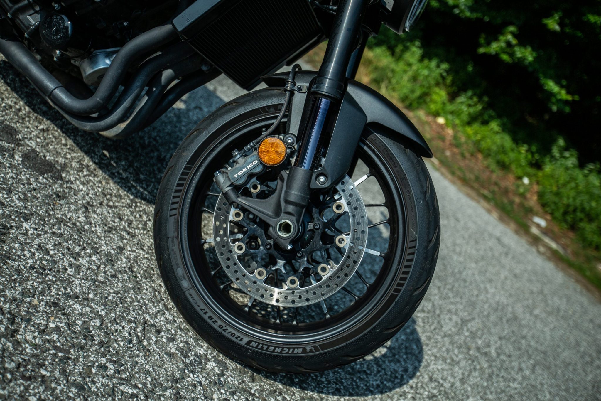 Pri Honde musím spomenúť aj to, že prevodovka je manuálna. O zastavenie sa vám vpredu postarajú dva 310 milimetrové kotúče do ktorých sa zahryzávajú štvorpiestikové radiálne upevnené monobloky od Tokico. Musím povedať, že fungujú na výbornú a poradia si s každou situáciou. Dávkovateľnosť je dobrá a nástup je veľmi príjemný a nie je zbytočne “kúsavý”. Vzadu je to zase 256 milimetrový kotúč s jednopiestikovým strmeňom.
