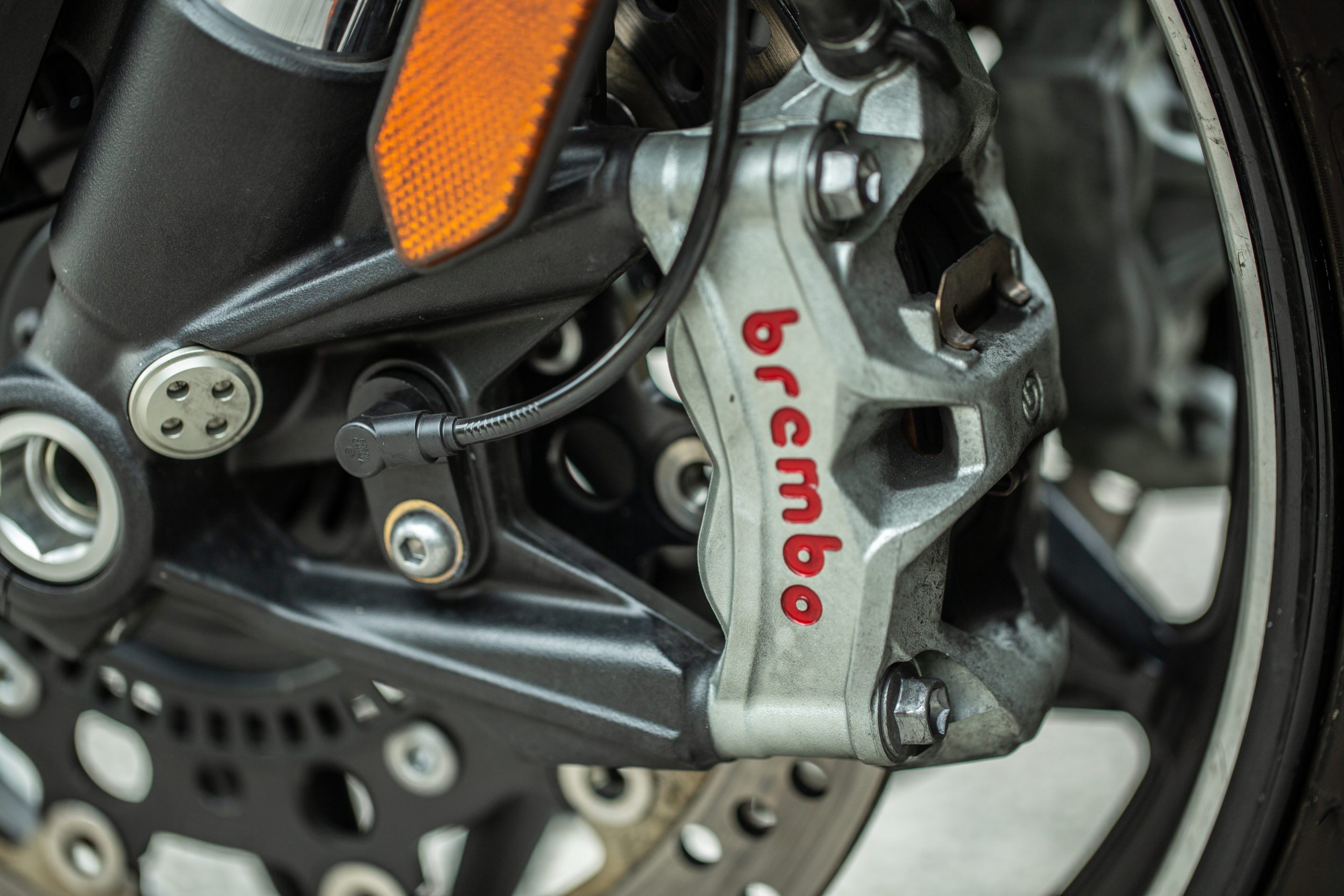Nesmiem zabudnúť ani na brzdy. Aj keď sa hovorí, kto brzdí nevyhráva, skôr či neskôr zastaviť budete musieť hoc aj len na nevyhnutne dlhú dobu, ktorú budete potrebovať na rýchle doplnenie paliva. Presne o to sa vám postará bravúrne zvládnutý brzdový systém od Bremba. Začína radiálnou pumpou Brembo a končí dvoma 320 milimetrovými kotúčmi, do ktorých sa zakusujú radiálne uchytené štvorpiestikové monobloky Brembo Stylema.