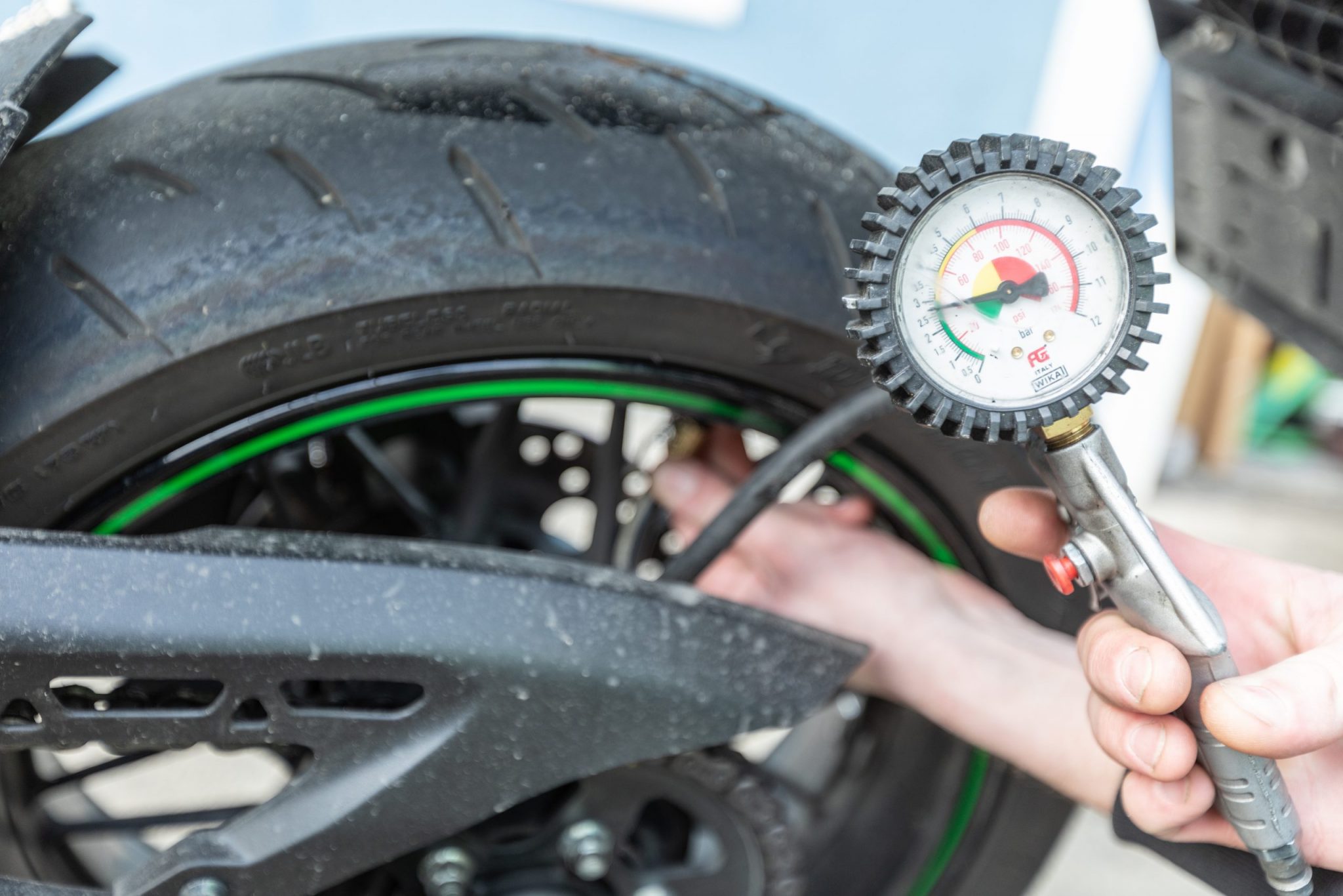 Ďalšie na zozname sú pneumatiky. Tie si najprv nahustíme na predpísaný tlak pokiaľ by sa stalo, že nám cez zimu trochu vzduchu prepustilo. Nesmieme opomenúť ani bočnice gúm. Tie si skontrolujeme na praskliny či iné vady. Gumy by sa mali meniť každé štyri roky aj keď je na nich ešte dostatočné množstvo dezénu. Nakoľko motocyklové gumy svojím vekom a nie vždy správnym skladovaním strácajú svoje vlastnosti.