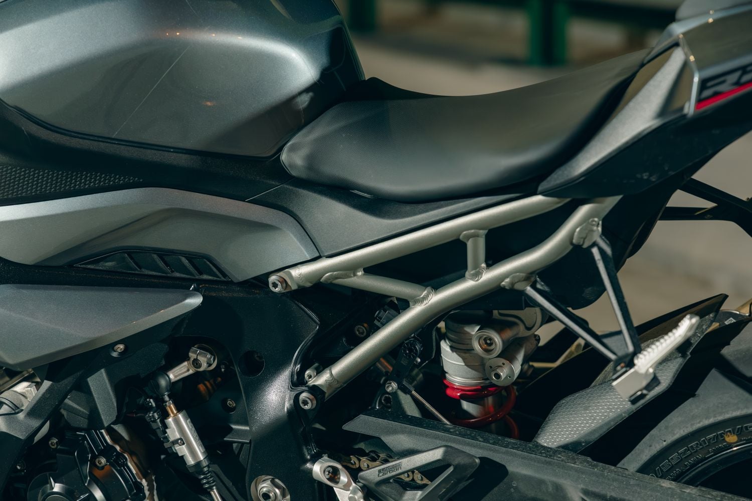 Hliníkový rám s tuhou prednou časťou a masívnou kyvkou dáva presnú odozvu. Podvozok je plne nastaviteľný: vpredu 45 mm USD (predpätie/kompresia/odskok), v opcii DDC (Dynamic Damping Control), ak chcete poloadaptívne tlmenie. Nastavenie drží stopu aj na zlom povrchu a aj pri neskorých brzdách zostáva predok pod kontrolou. Vpredu sa nachádzajú dvojité 320 mm kotúče s radiálne uchytenými štvorpiestikovými monoblokmi od Bremba, vzadu 220 mm kotúč s jedným piestikom. V BMW nezabudli ani na ABS Pro so sklonomerom a Brake Slide Assist pre kontrolované „šmyky“ do zákrut. Páčka má tvrdý, čitateľný nástup, dávkovanie je ostré, ale predvídateľné, s ľahkosťou je dávkovateľný aj jedným prstom. Pri dlhom stinte brzdy nevädnú, ak je v poriadku kvapalina a prúdenie vzduchu cez kanály.