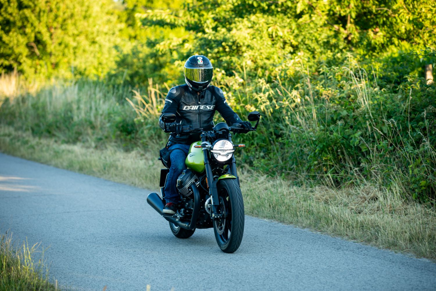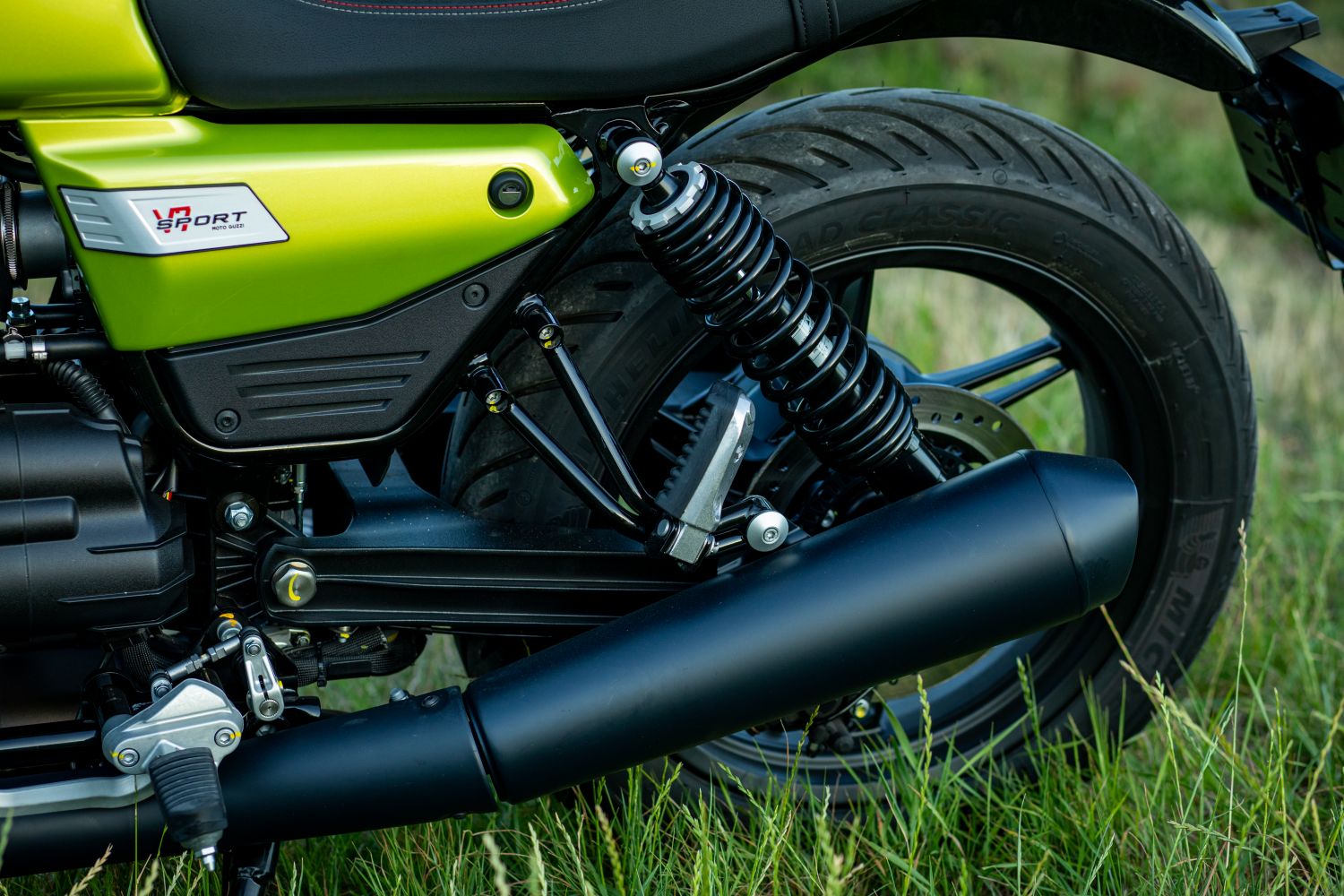 Vpredu klasická teleskopická vidlica s naladením na komfort, vzadu dvojité pruženie so staviteľným predpätím. Nie, nie je to superbike, aj keď má v názve Sport, a práve preto je V7 Sport tak príjemná. Na rozbitých okreskách tlmí s rezervou, v zákrutách drží stopu prirodzene a neprekvapuje neželanými odskokmi. Predná brzda je 320 mm kotúč s radiálne uchyteným 4‑piestikom, vzadu 260 mm kotúč s jednopiestikom. ABS a trakčná kontrola (MGCT) strážia situáciu, ale nepletú sa do jazdy viac, než je nutné. Brzdný účinok je plne adekvátny charakteru stroja – dávkovateľný, s dobrou odozvou v páčke.