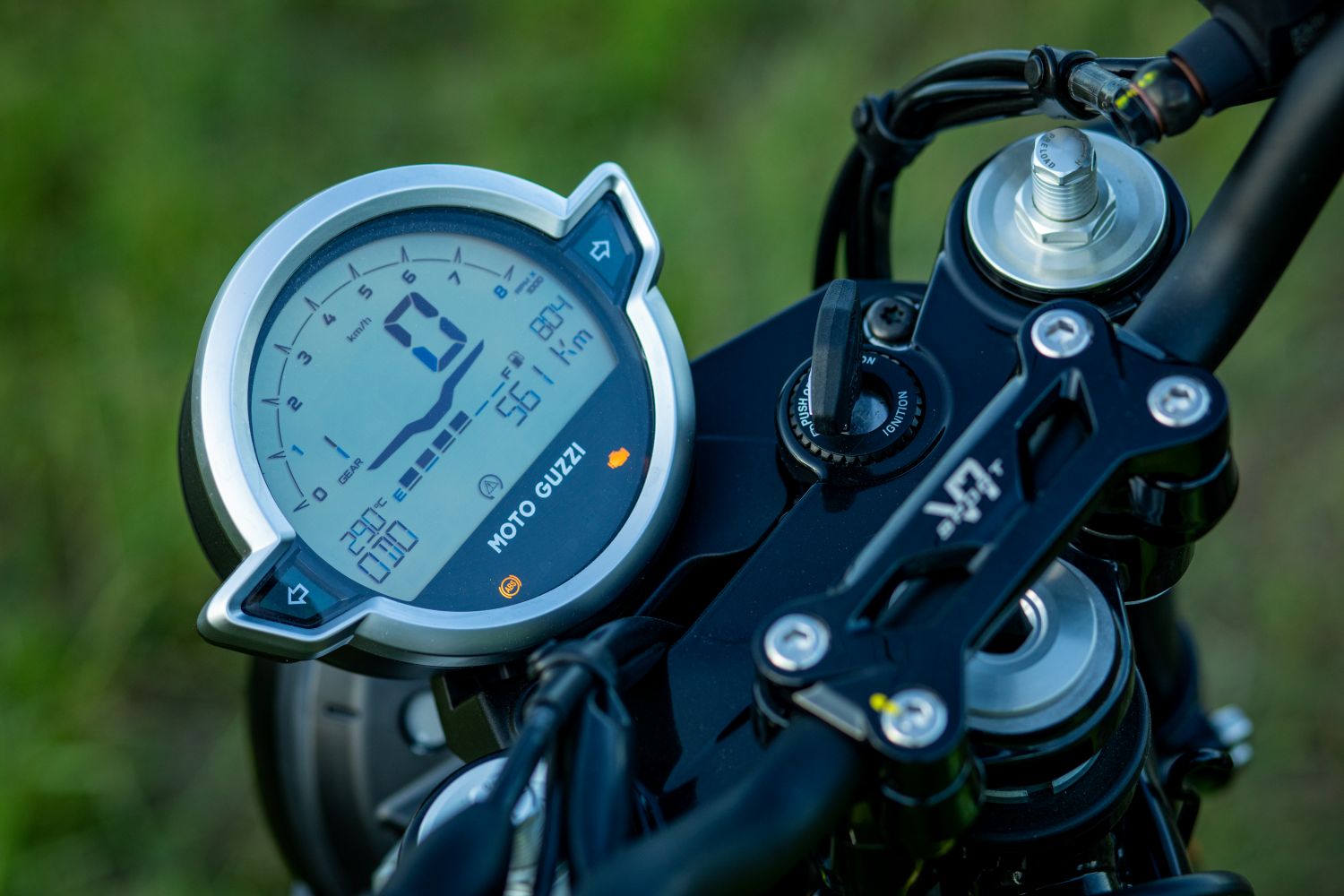 Vzduchom chladené V‑dvojča 90° uložené naprieč rámom je srdcom Moto Guzzi už dekády a tu nesklame. 853 cm³ má iný rytmus než dnešné „bezpohlavné“ agregáty: mierne vibrácie, hlboké dunenie okolo 3000 – 5000 ot./min. a ochota ísť dopredu bez nervozity. Výkon je 65 koní a 73 Nm, no dôležitejšie je, ako sa to podáva – lineárne, kultivovane, bez zbytočných špičiek.