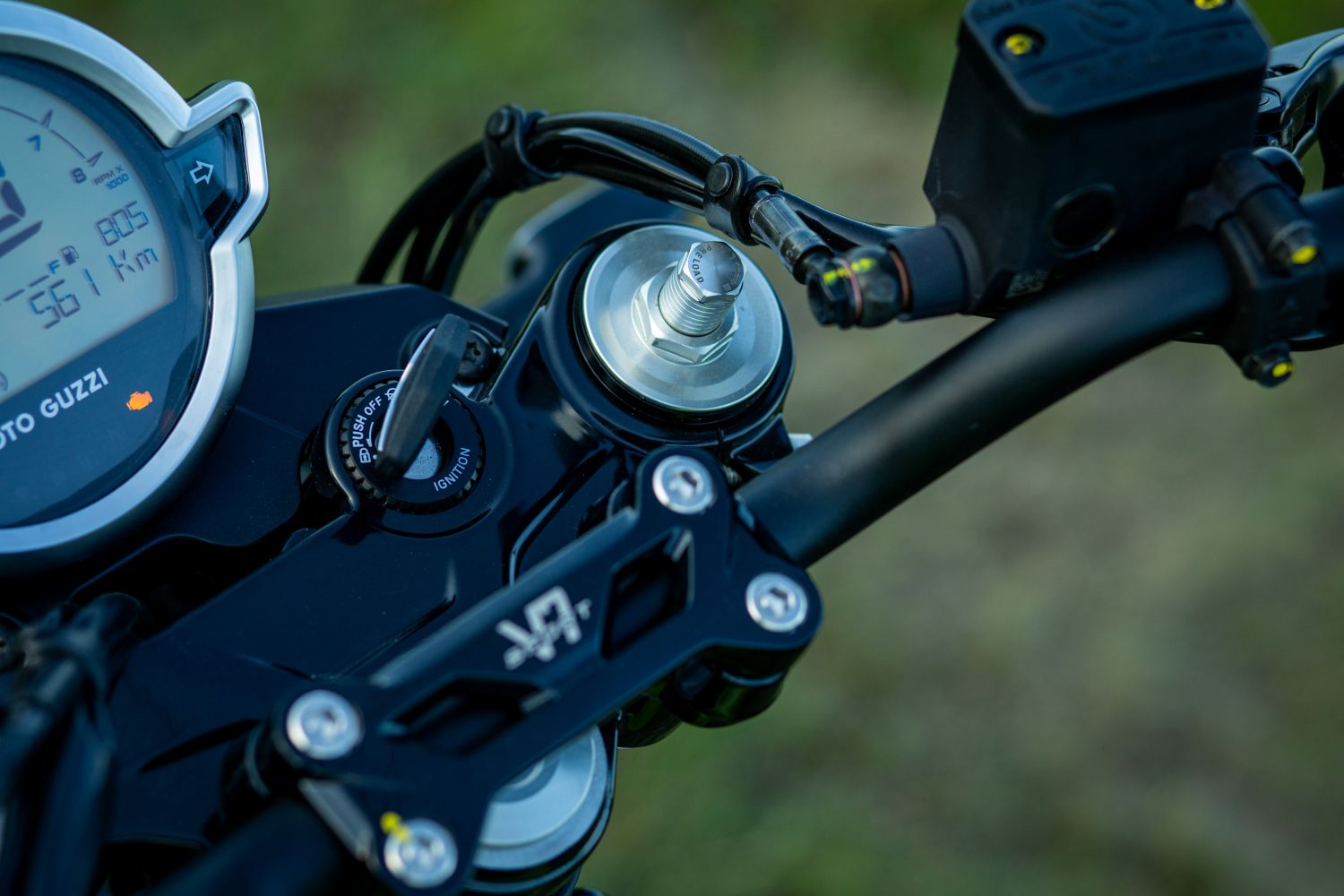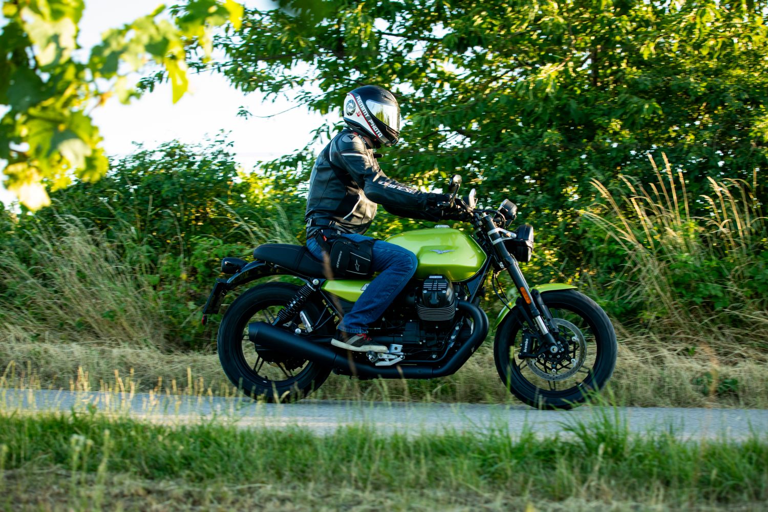Vpredu klasická teleskopická vidlica s naladením na komfort, vzadu dvojité pruženie so staviteľným predpätím. Nie, nie je to superbike, aj keď má v názve Sport, a práve preto je V7 Sport tak príjemná. Na rozbitých okreskách tlmí s rezervou, v zákrutách drží stopu prirodzene a neprekvapuje neželanými odskokmi. Predná brzda je 320 mm kotúč s radiálne uchyteným 4‑piestikom, vzadu 260 mm kotúč s jednopiestikom. ABS a trakčná kontrola (MGCT) strážia situáciu, ale nepletú sa do jazdy viac, než je nutné. Brzdný účinok je plne adekvátny charakteru stroja – dávkovateľný, s dobrou odozvou v páčke.