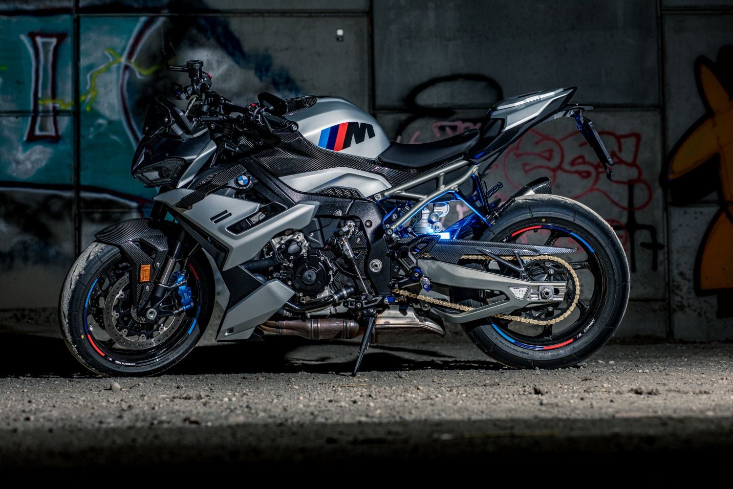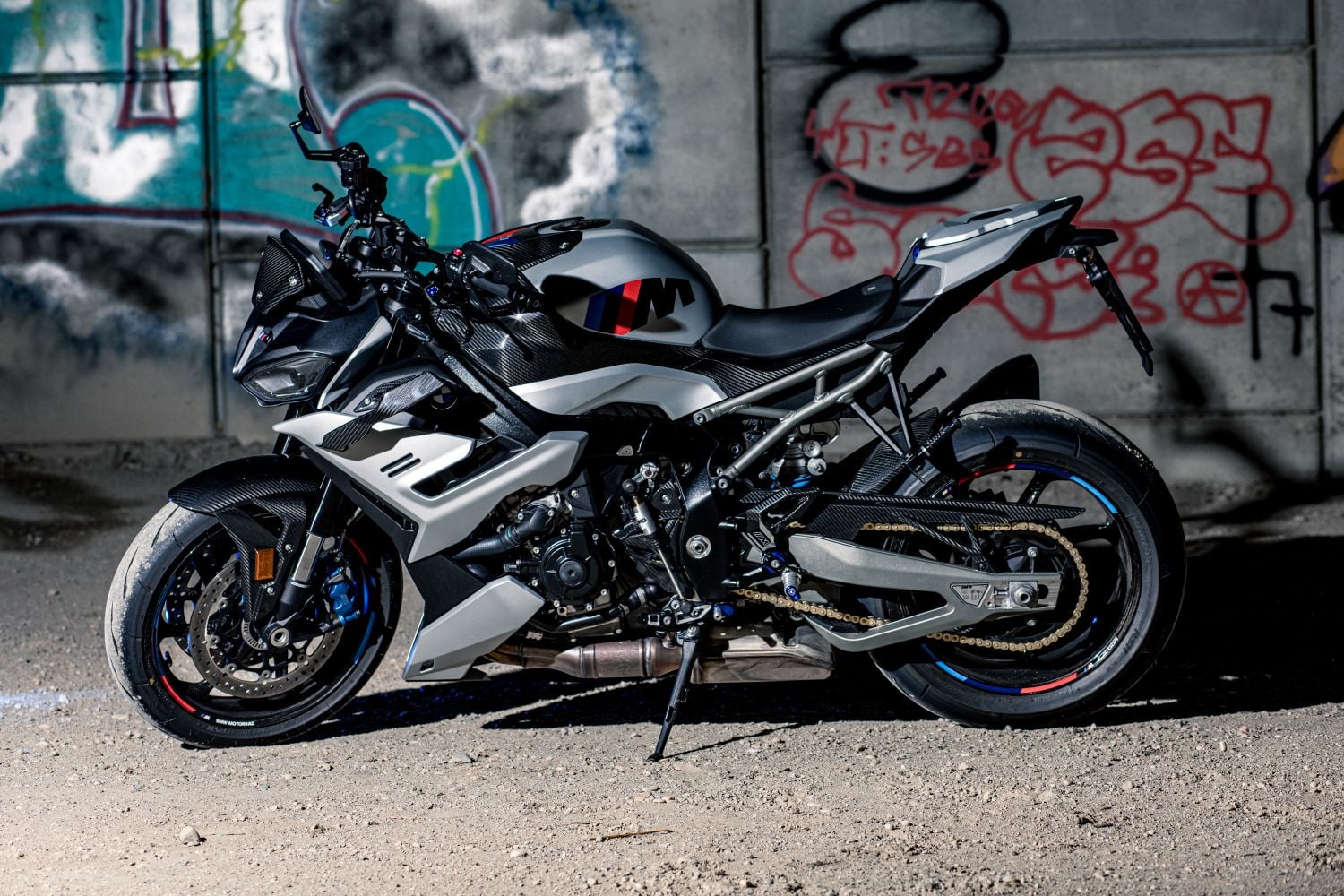 Hliníkový rám s tuhým krkom, dlhá kyvka a ostrá geometria prinášajú chirurgickú presnosť. 45 mm USD vpredu a zadný monoshock sú plne nastaviteľné; s voľbou DDC (Dynamic Damping Control) dostane jazdec aj poloadaptívne tlmenie, ktoré drží motorku v ideálnej výške pri brzdení aj akcelerácii. V rýchlych esíčkach padá ľahko, ale nie nervózne. Wingletmi podopretý predok ostáva pokojný aj pri jazde cez horizont. Široké riadidlá dávajú jasnú páku, takže jazdec koriguje stopu milimetrami. Pneumatiky 120/70 ZR17 a 200/55 ZR17 dávajú M-ku plochu, z ktorej vie ťažiť.