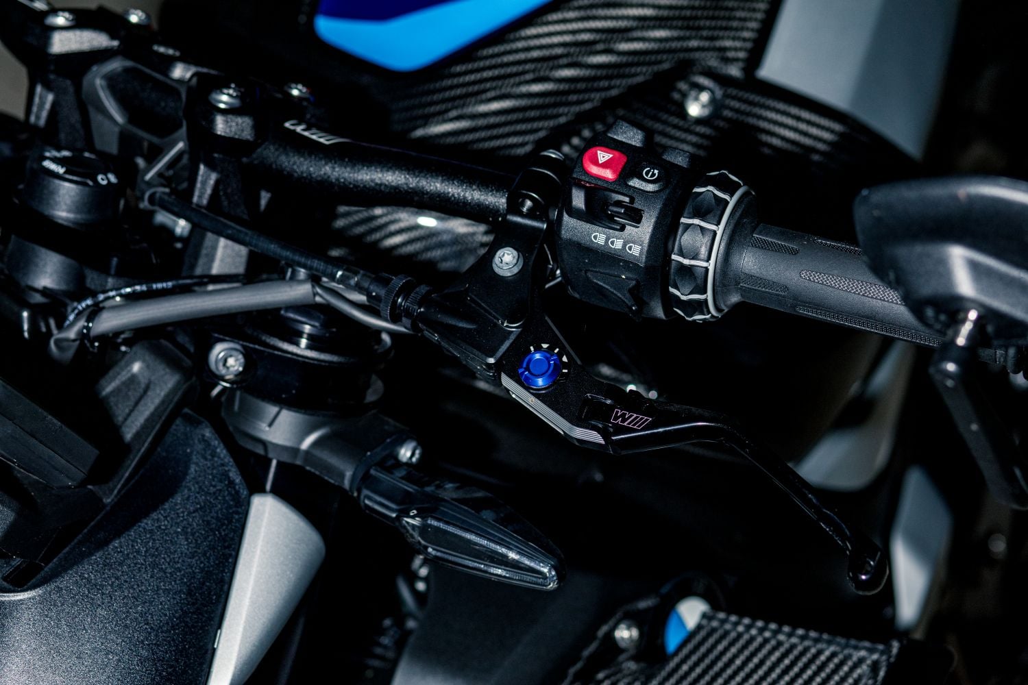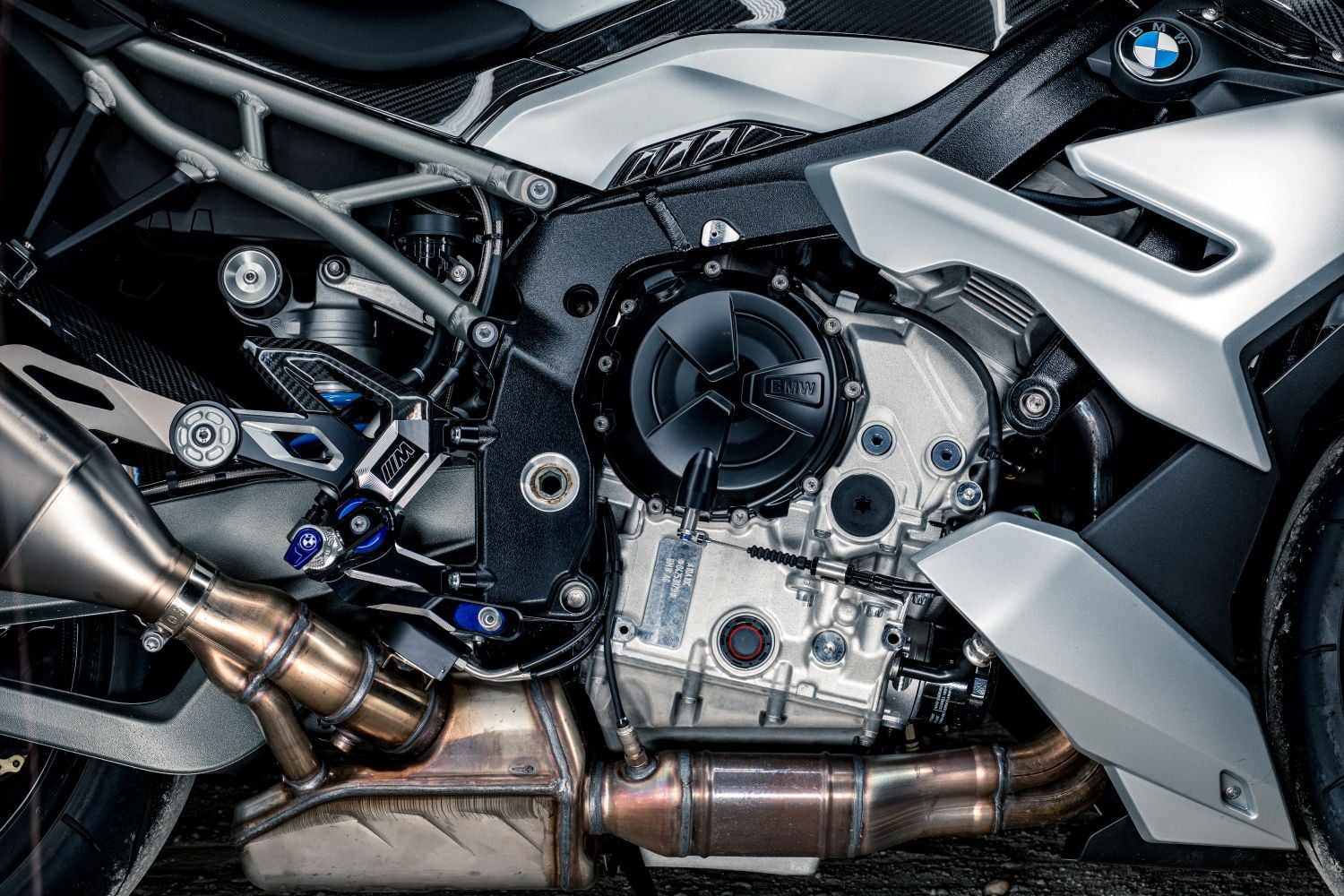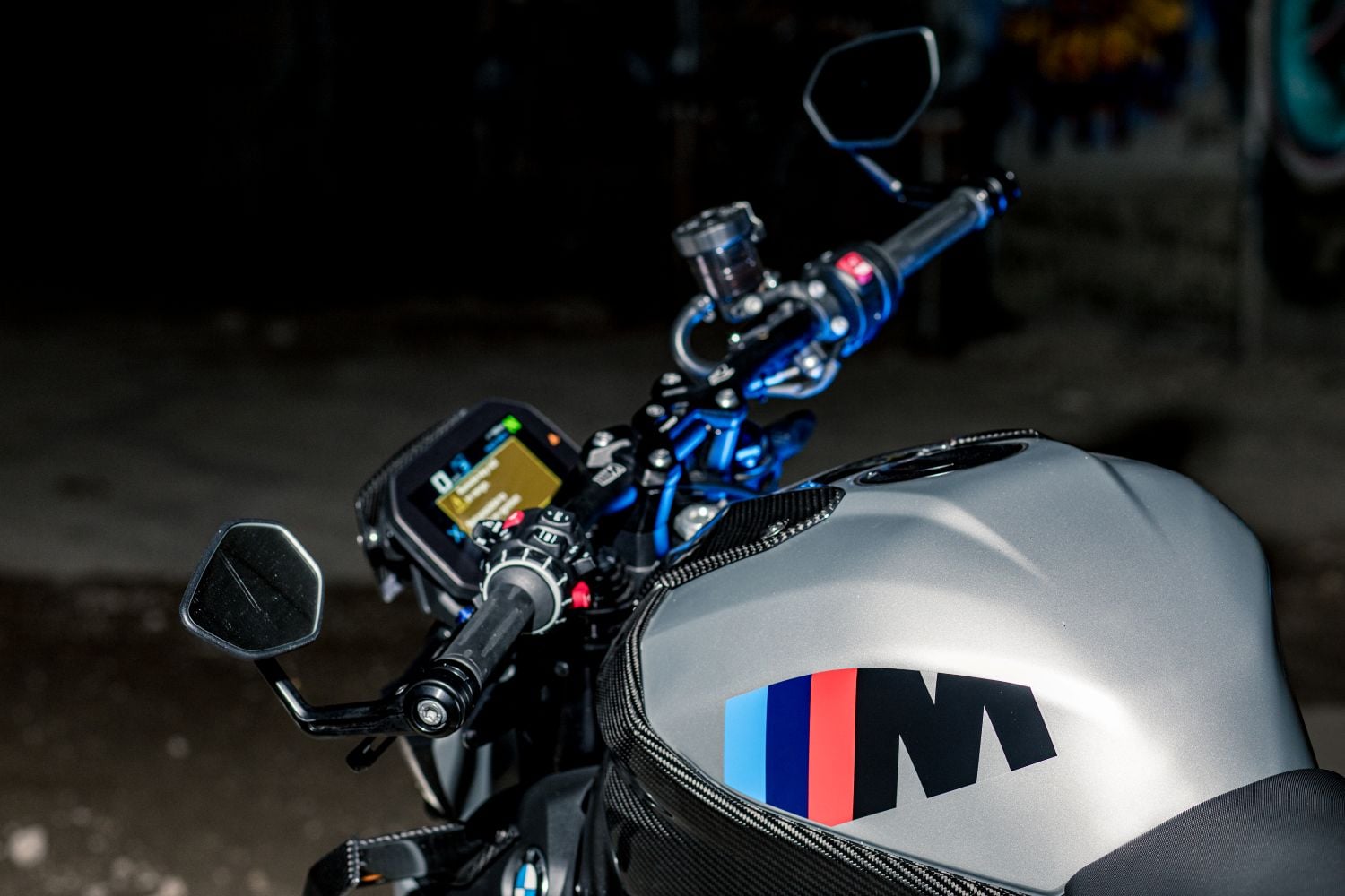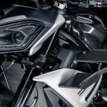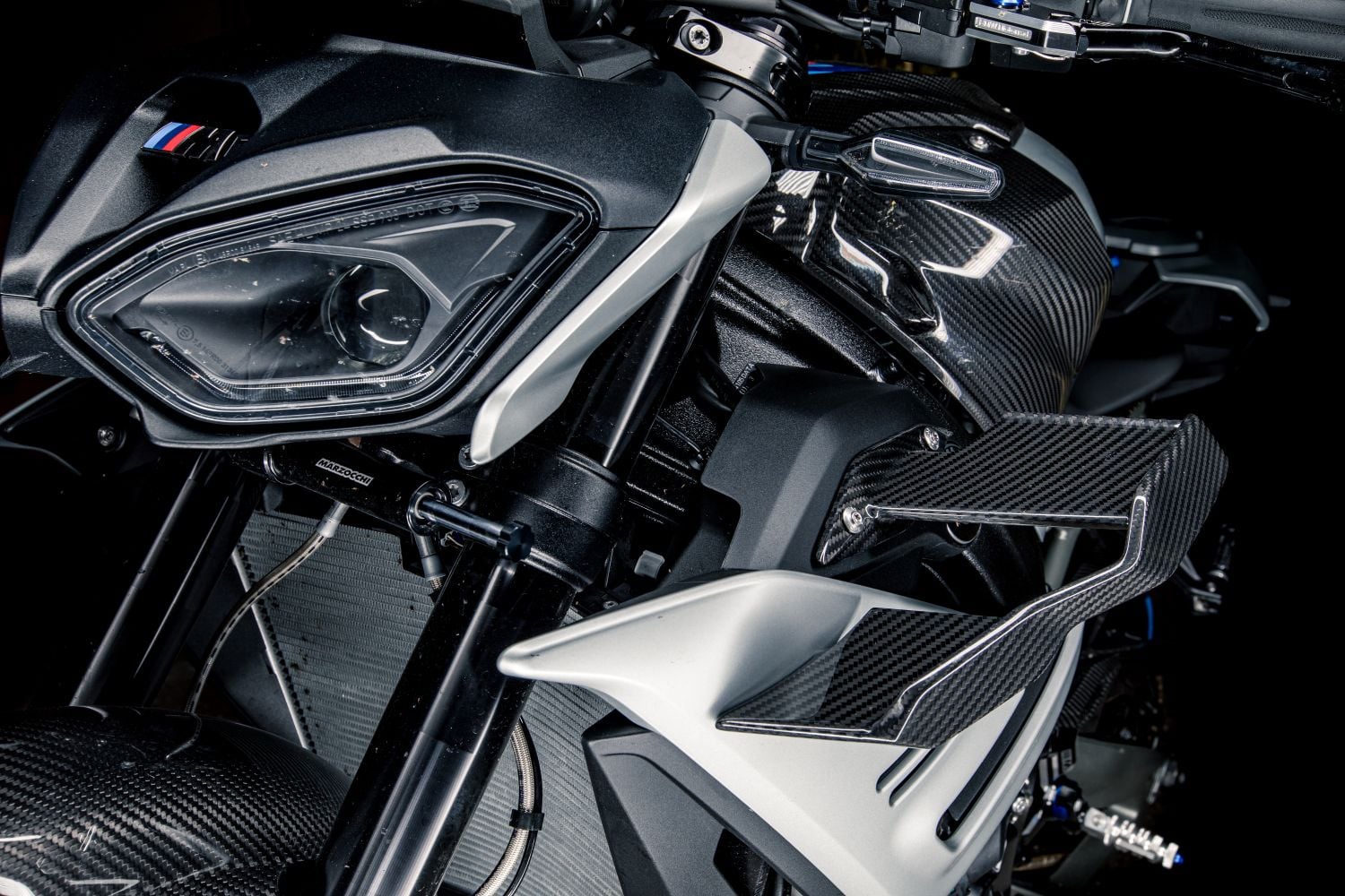 Agresívny predok, kompaktné kapoty a M-winglety, čiže malé krídelká, ktoré pri vyšších rýchlostiach tlačia predok do asfaltu a stabilizujú výjazdy. Hliníkový „mostový“ rám priznáva svaly, široké riadidlá dodávajú páku a jemne spustené zrkadlá zvýrazňujú úzku siluetu. Modré M brzdy a (voliteľné) M Carbon kolesá nie sú póza, ale funkčný podpis. Všetko je v prípade motocykla BMW M 1000 R podriadené času na kolo na uzavretom okruhu.