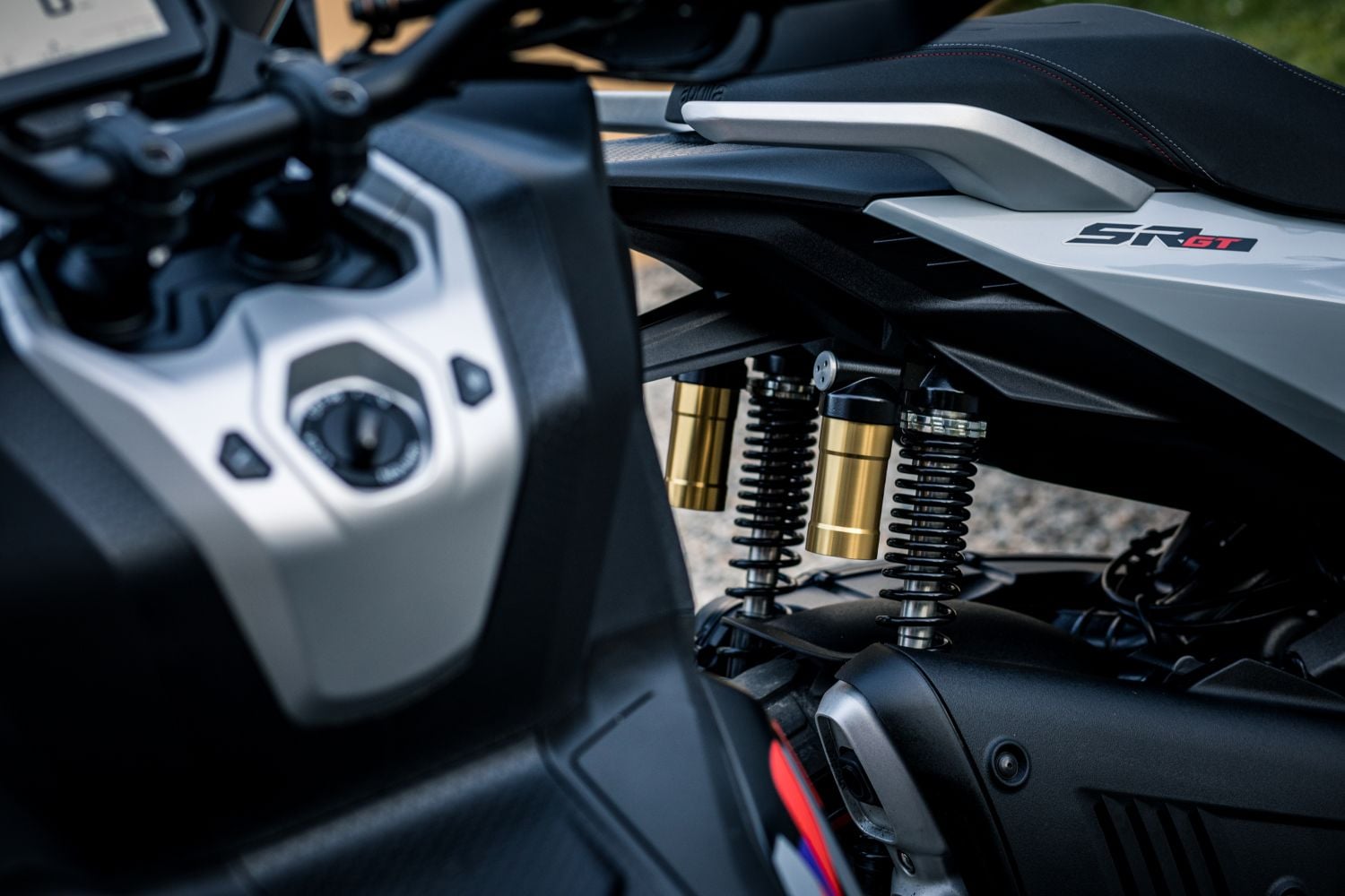 Podvozok využíva USD prednú vidlicu s priemerom 41 mm, ktorá dodáva skútru športovejší charakter a presnejší pocit od predného kolesa. Vzadu pracujú dva tlmiče s externou plynovou nádržkou a nastaviteľným predpätím pružiny, čo umožňuje prispôsobiť správanie podvozku podľa zaťaženia alebo štýlu jazdy.