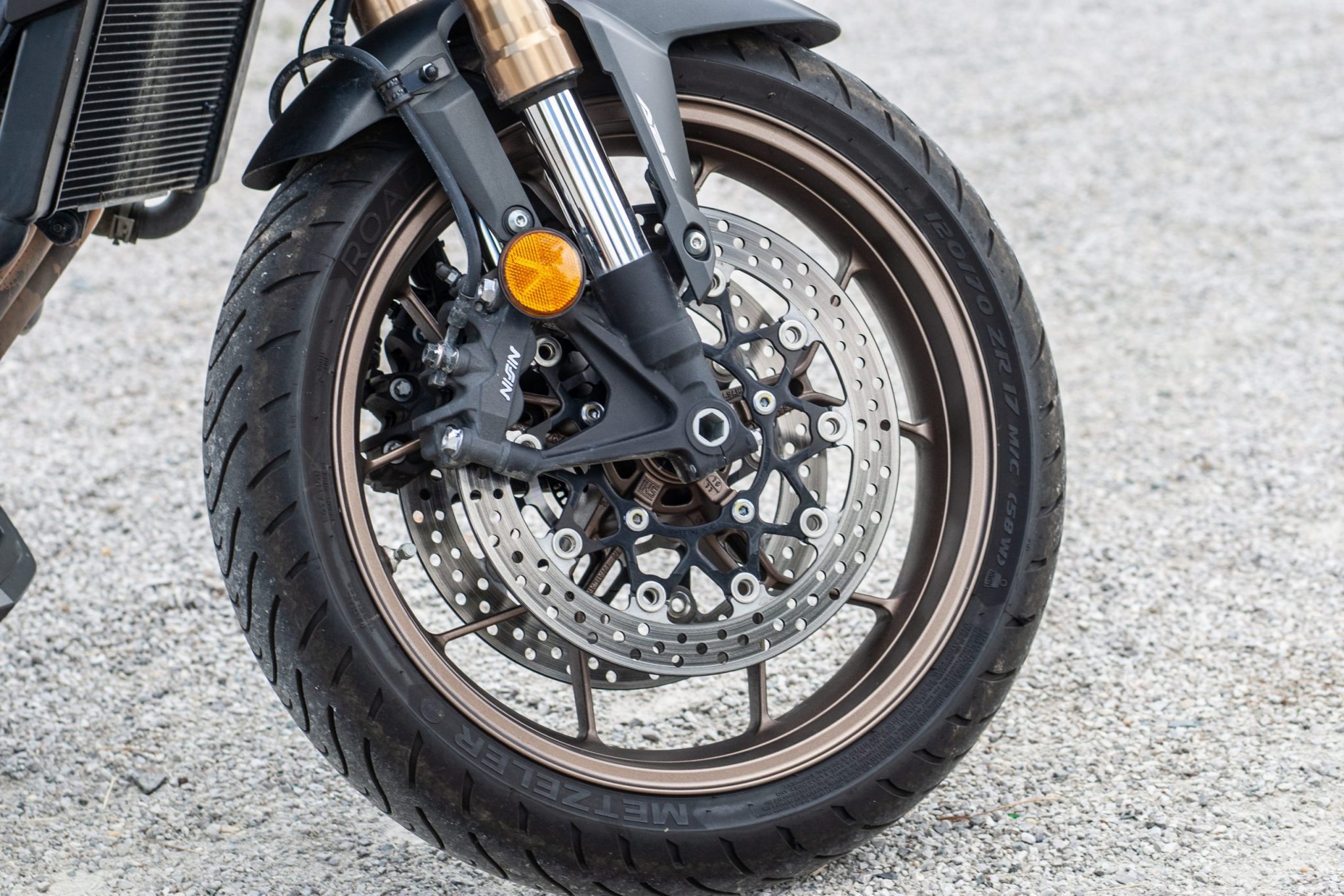 O stabilitu na ceste sa zase stará predná obrátená 41mm vidlica Showa. Nie je ani mäkká ani príliš tvrdá. Odozva od nej je príjemná a rýchla. Cítiť z nej aj tú najmenšiu nerovnosť bez toho aby vás zbytočne kopala.