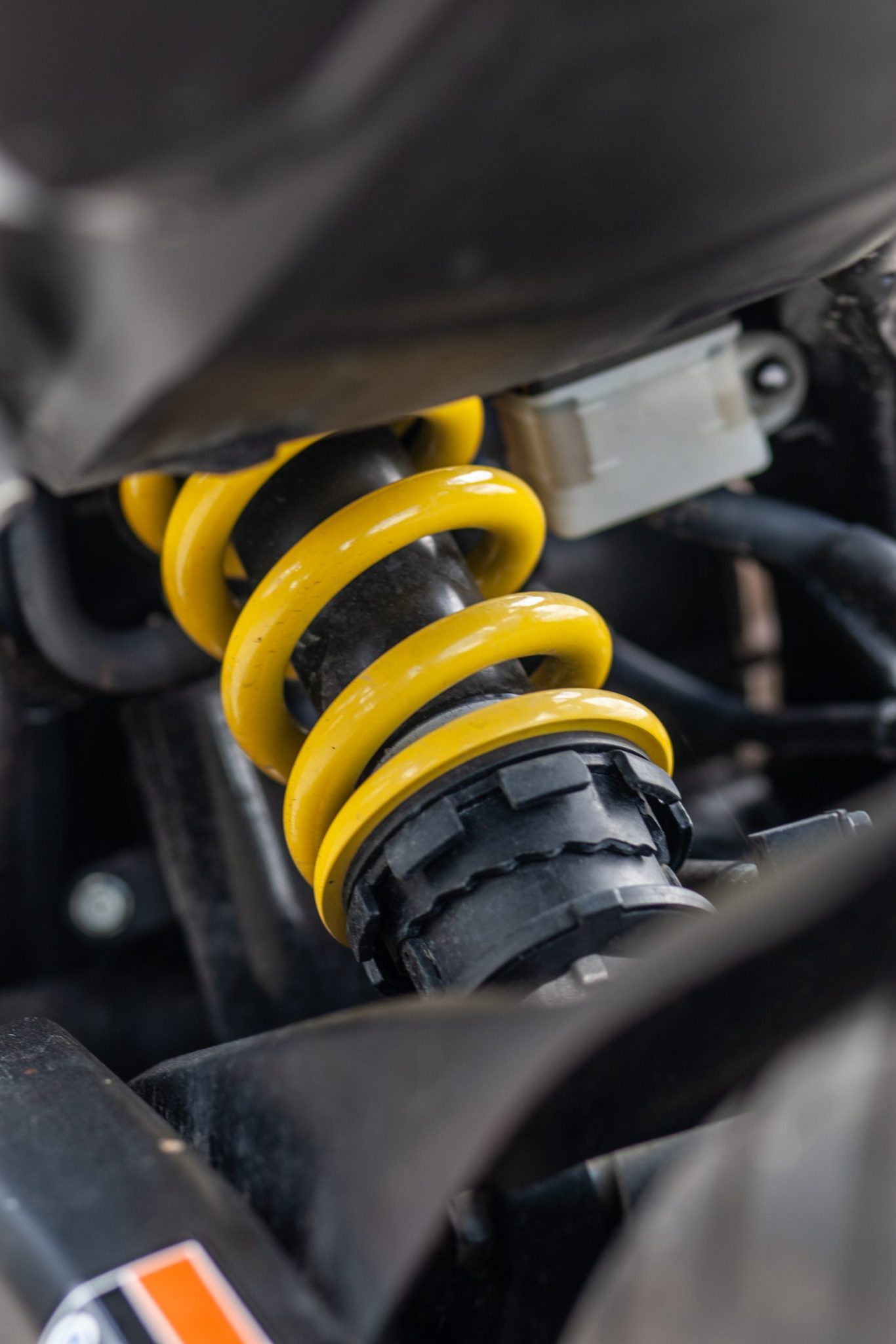 Vzadu sa nachádza monoshockový tlmič s nastaviteľnou tuhosťou pružiny v 10 krokoch.