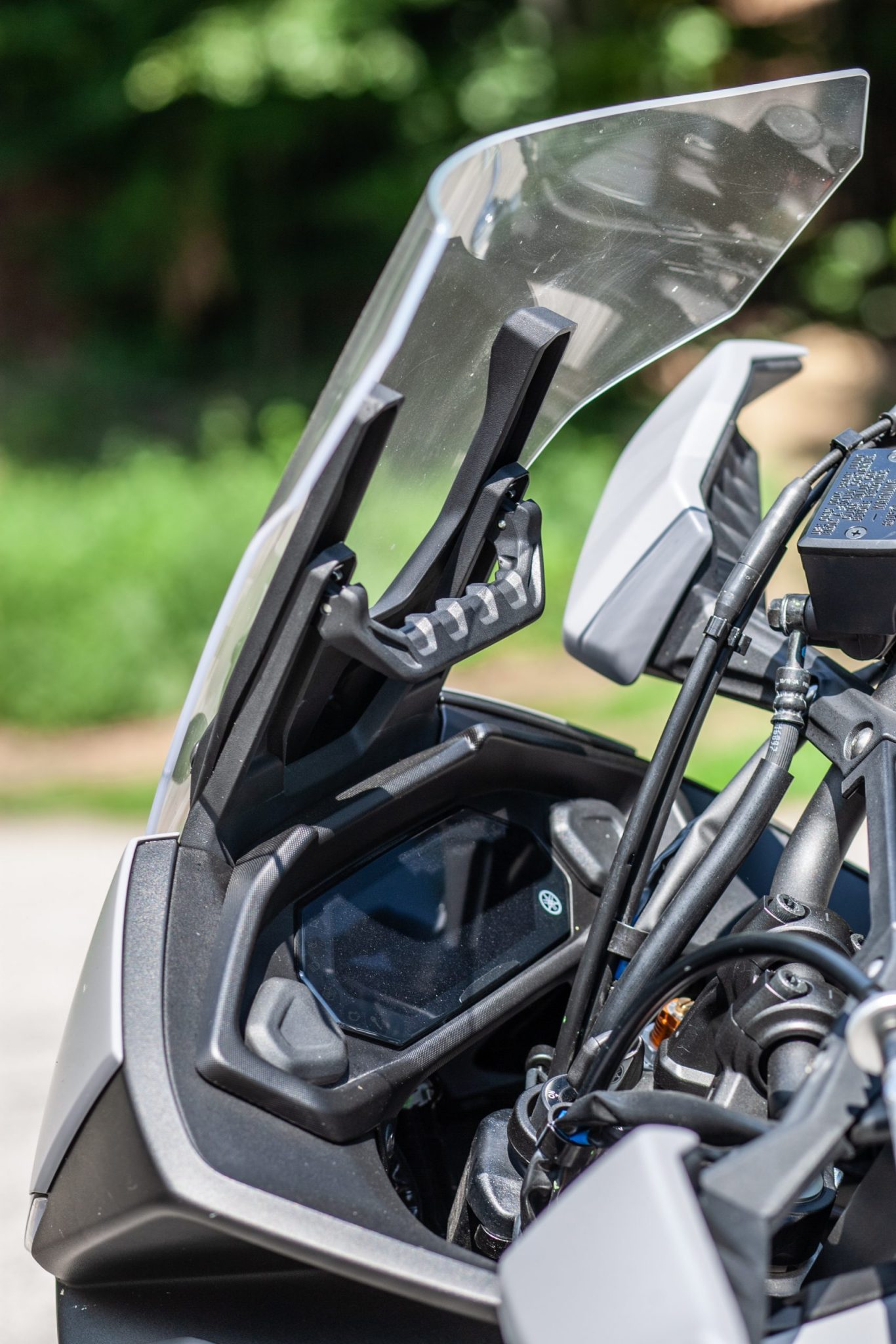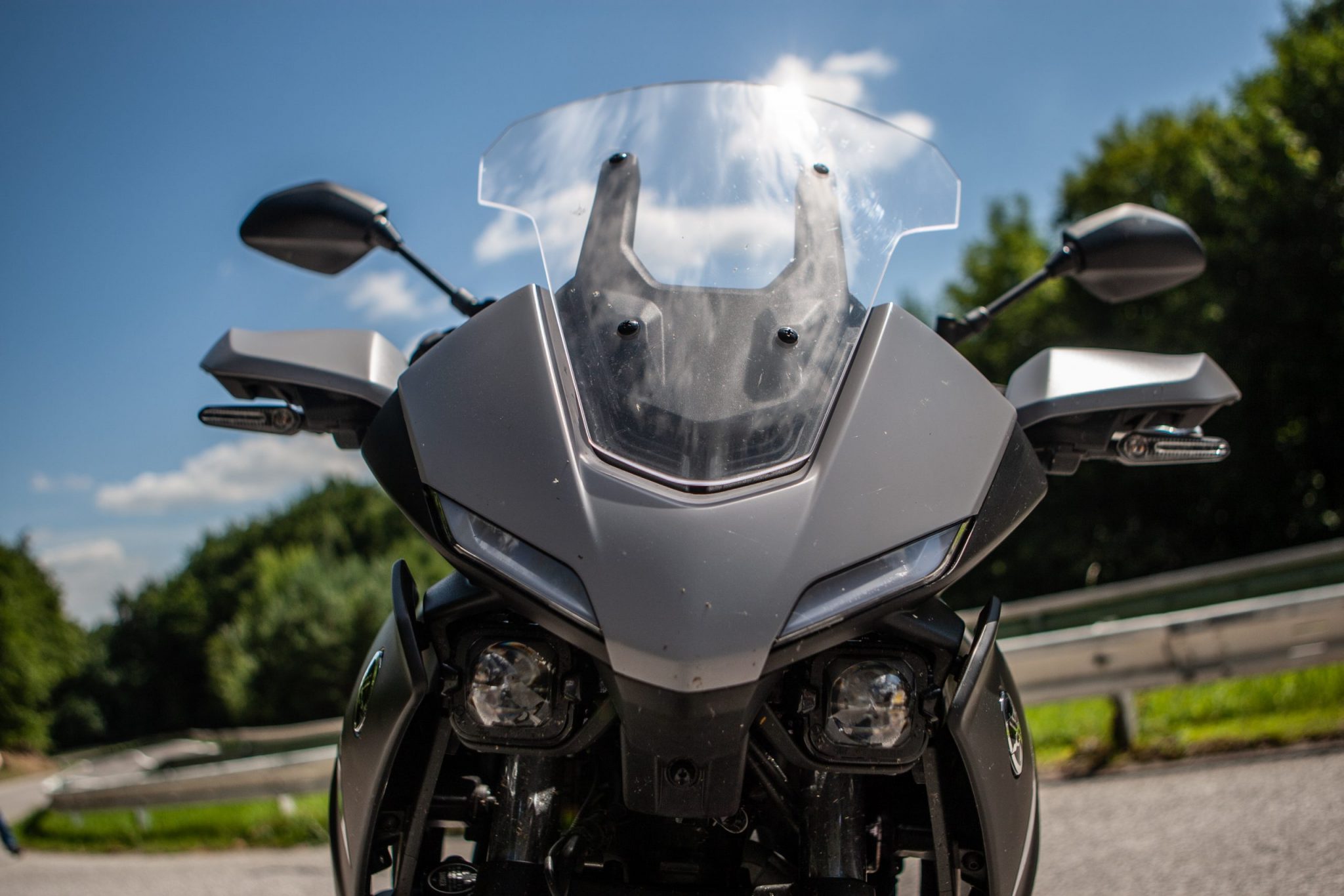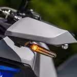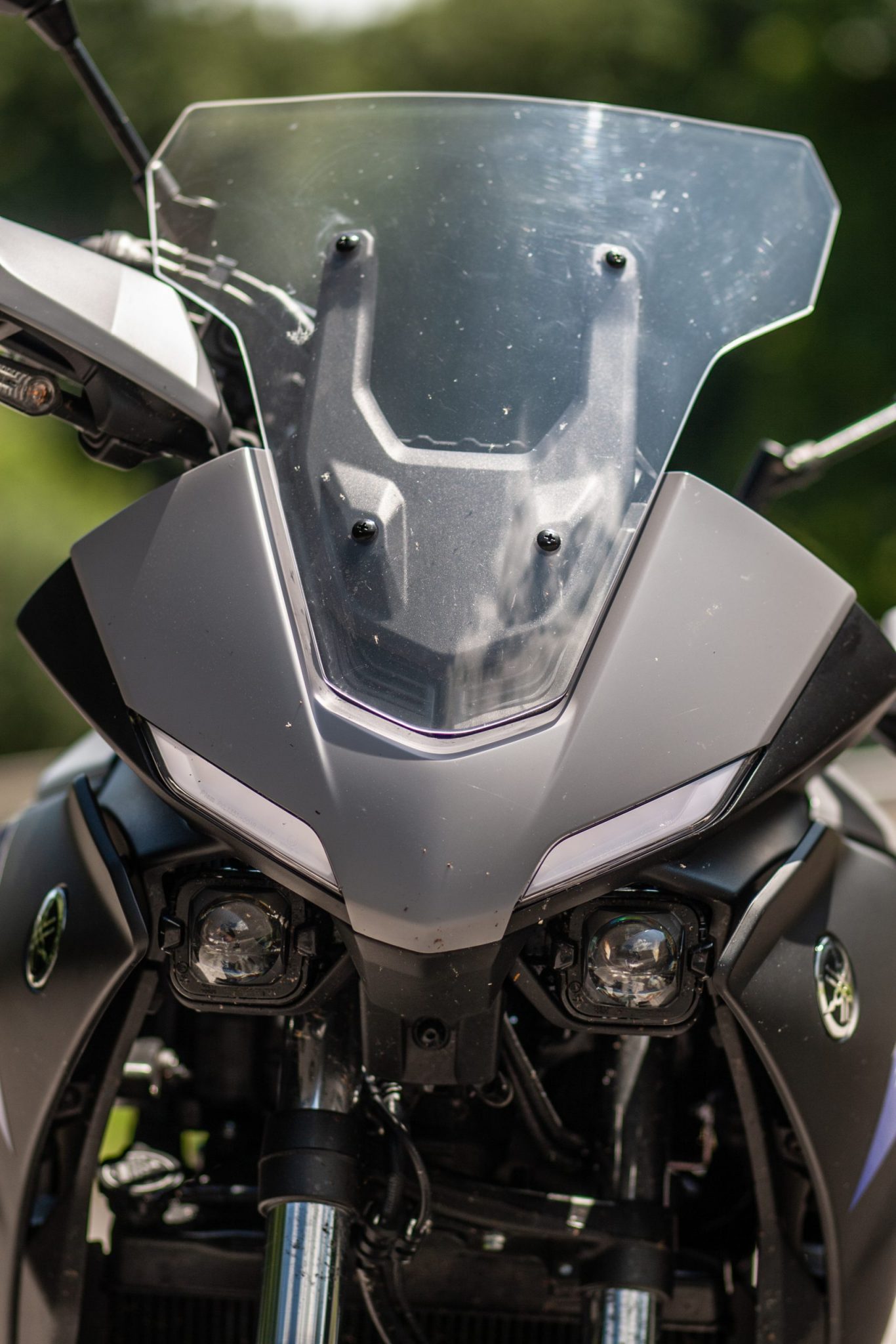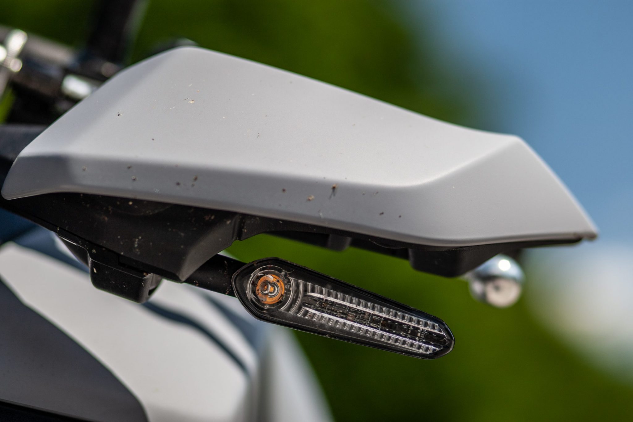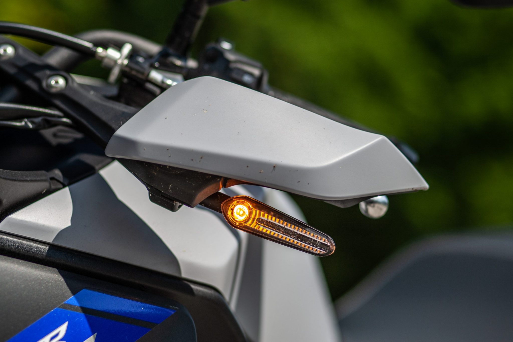 Poďme sa teraz pozrieť na najkontroverznejšiu časť Tracera, ktorou je samotná predná časť motocykla. O osvetlenie sa nám tu starajú dva LED pásiky zapustené do prednej masky slúžiace ako denné svetlá spolu s dvomi LED čočky pod nimi. V noci vám však ponúknu dostatočné množstvo svetla a svietia presne tam kam potrebujete. Predné smerové svetla sú situované pod predné chrániče rúk ktoré sa po dizajnovej stránky veľmi podarili.