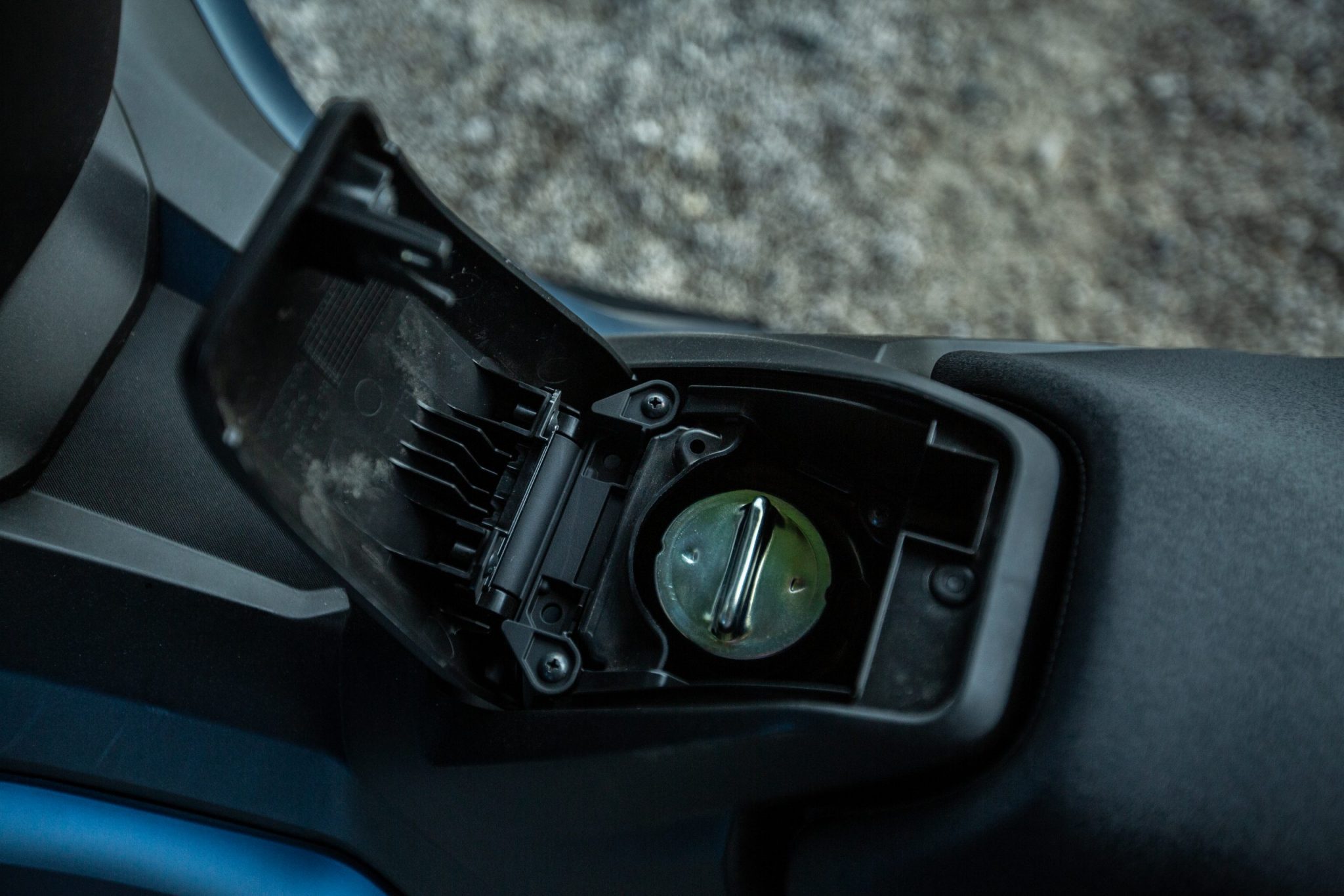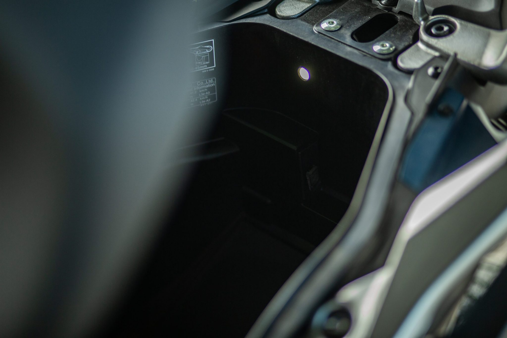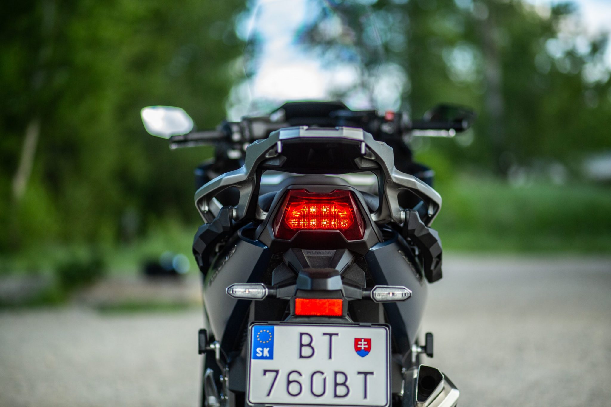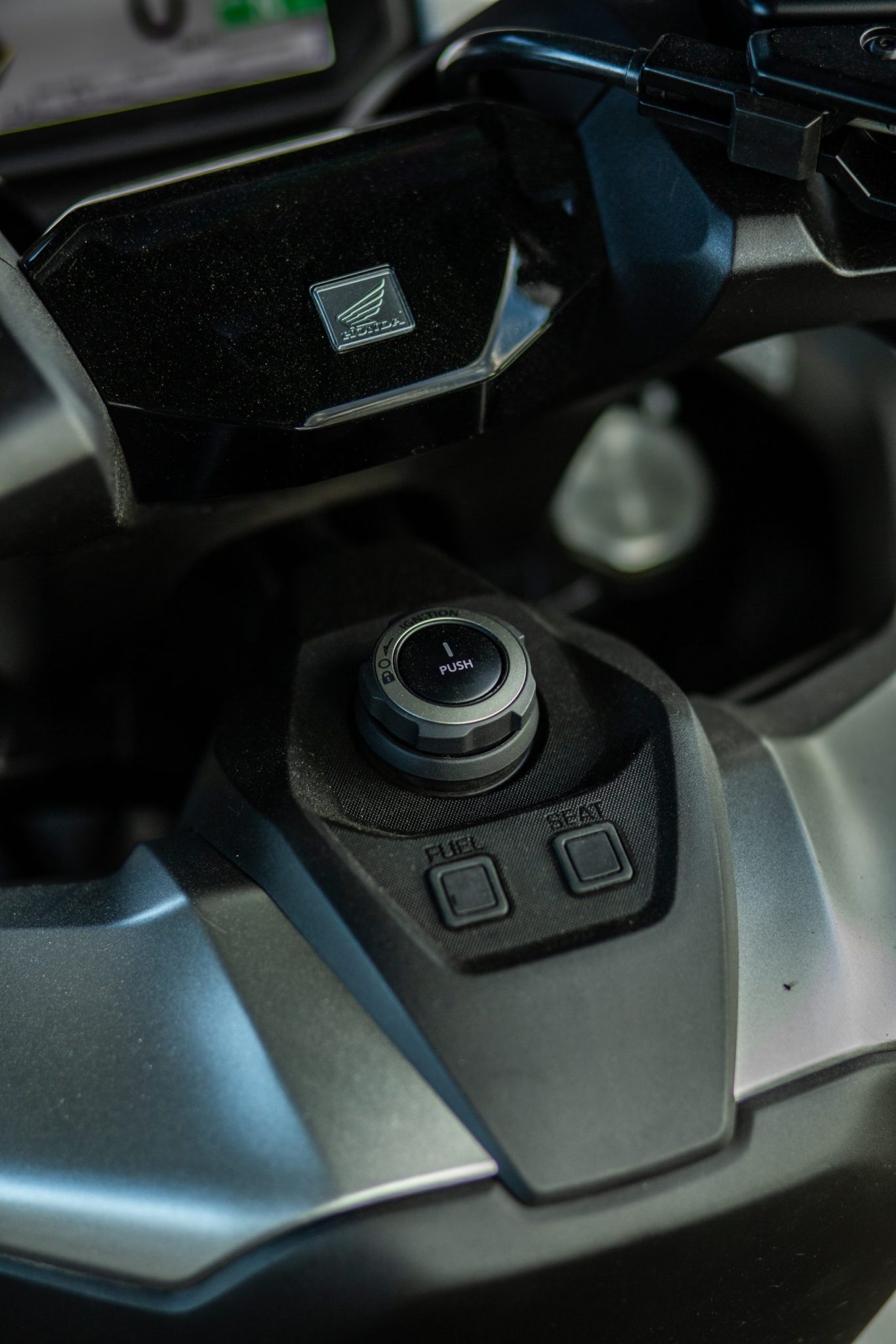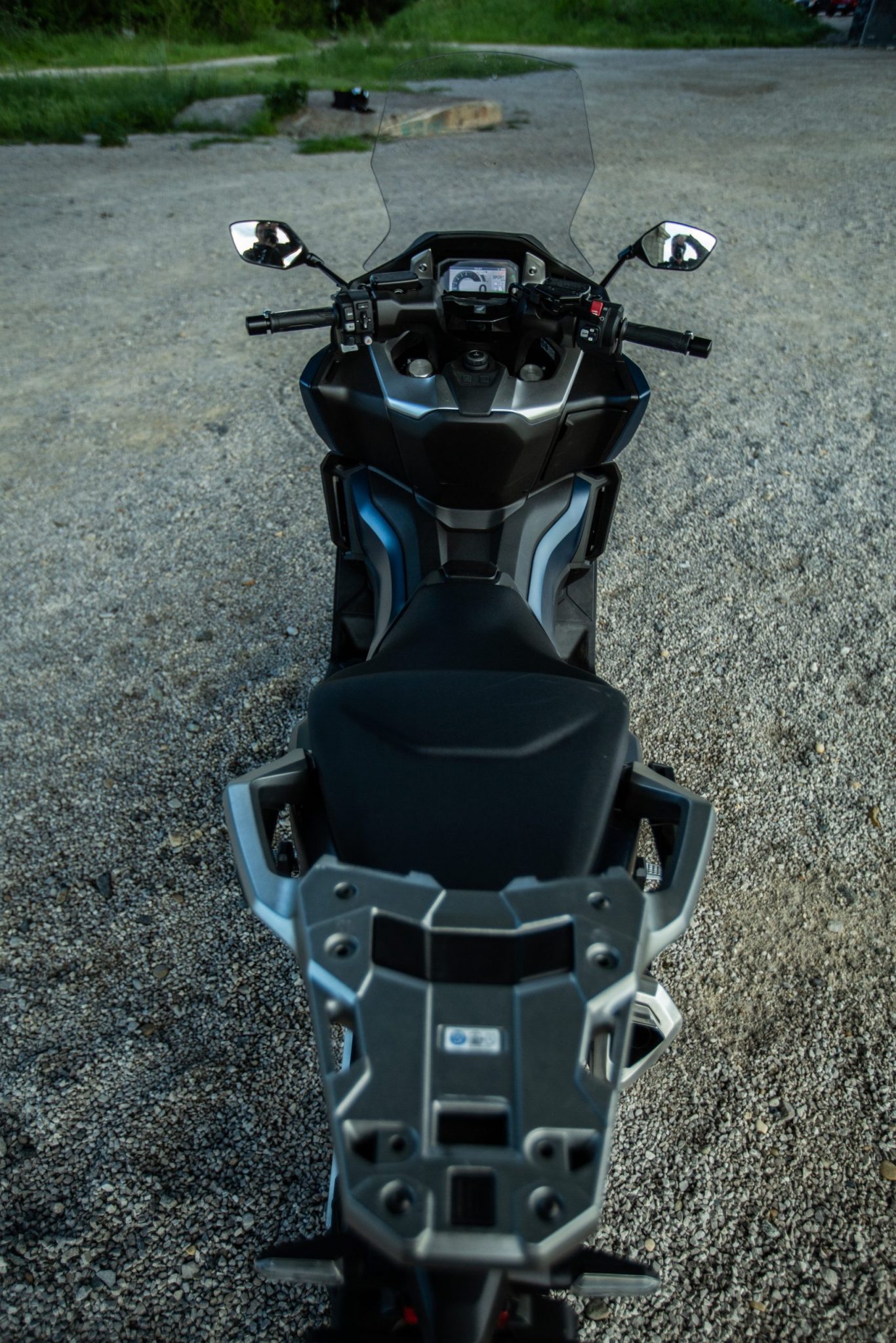 Tak ako aj u X-ADV-čka sa nám ručná brzda presunula na pravú stranu riadidiel kde si ju určite všimnete, nezabudnite ju však pred vyrazením povoliť. Aj vďaka tomu sa nám uvoľnilo miesto na pravej strane kde bola pôvodne umiestnená a vznikol nám tam odkladací priestor. Otváranie sedačky ako aj nádrže je elektronické a na tlačidlo. Sedlo nám v otvorenej podobe udrží plynová vzpera. Pod sedačku sa pohodlne zmestí aj integrálna prilba a stále tam je dosť miesta na ďalšie veci. Pod sedadlom taktiež nájdeme aj USB C konektor. Výška sedla je taká zlata stredná cesta s hodnotou 790 milimetrov, ale kvôli trochu väčšej šírke musíte mať dlhšie nohy aby ste pohodlne dosiahli až na zem.