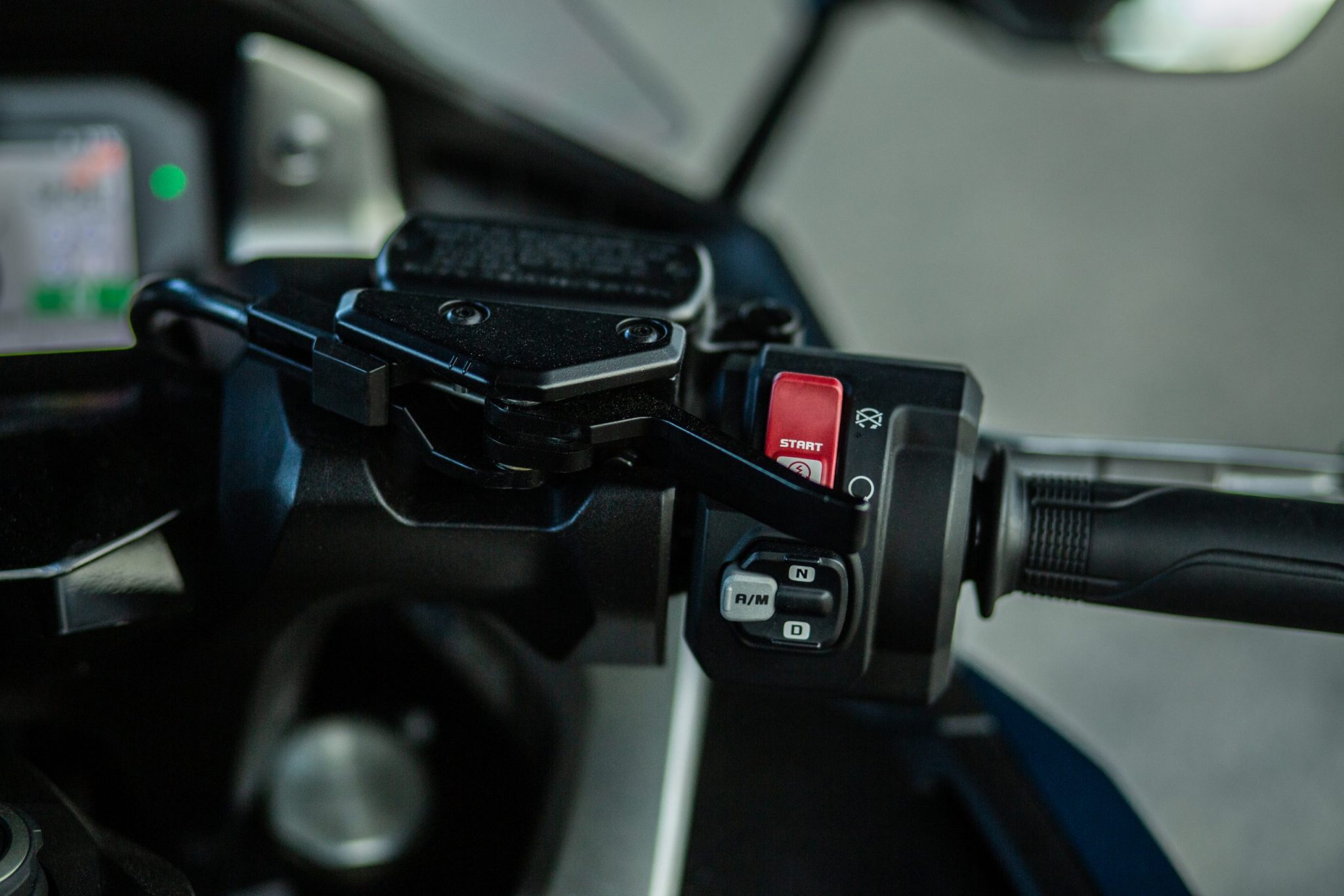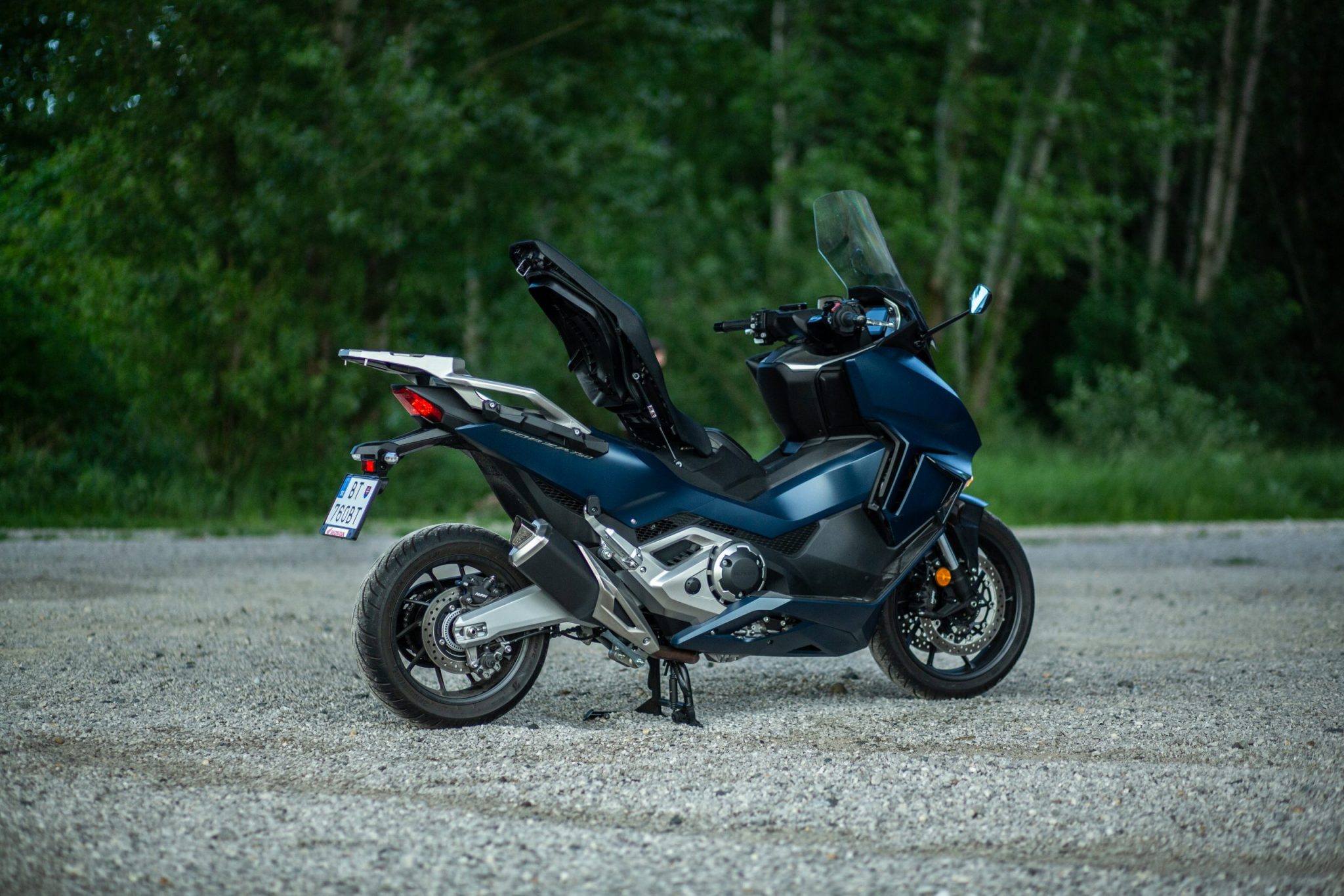 Tak ako aj u X-ADV-čka sa nám ručná brzda presunula na pravú stranu riadidiel kde si ju určite všimnete, nezabudnite ju však pred vyrazením povoliť. Aj vďaka tomu sa nám uvoľnilo miesto na pravej strane kde bola pôvodne umiestnená a vznikol nám tam odkladací priestor. Otváranie sedačky ako aj nádrže je elektronické a na tlačidlo. Sedlo nám v otvorenej podobe udrží plynová vzpera. Pod sedačku sa pohodlne zmestí aj integrálna prilba a stále tam je dosť miesta na ďalšie veci. Pod sedadlom taktiež nájdeme aj USB C konektor. Výška sedla je taká zlata stredná cesta s hodnotou 790 milimetrov, ale kvôli trochu väčšej šírke musíte mať dlhšie nohy aby ste pohodlne dosiahli až na zem.