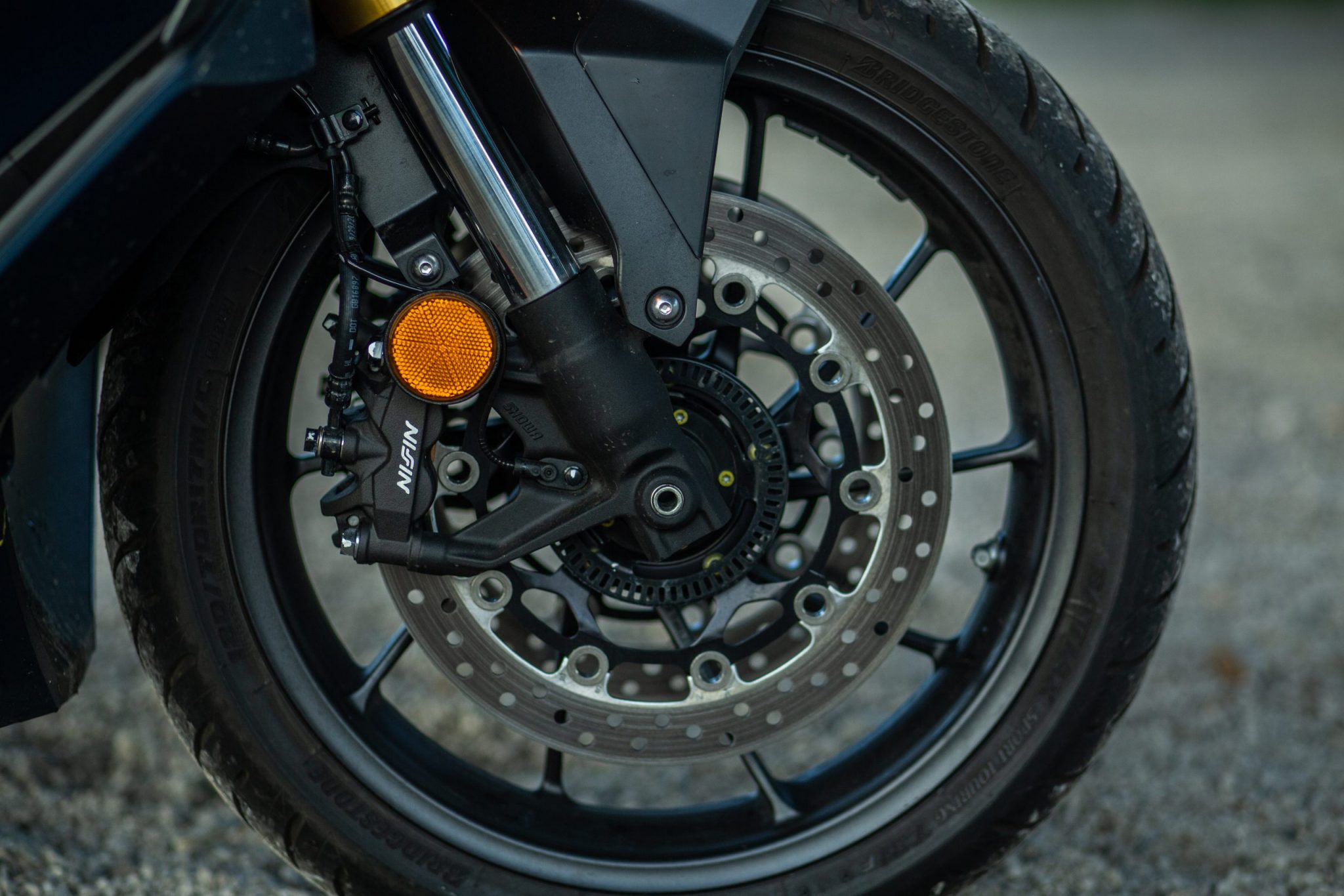 O zastavenie sa nám vpredu starajú dva 310 milimetrové kotúče so štvorpiestikovými radiálne uchytenými strmeňmi značky Nisin. Reakcia na brzdovú páčku je veľmi príjemná a nie je zbytočne agresívna ale ani príliš tupá. Keď potrebujete tak vás zastaví aj vo vyššej rýchlosti za pomerne krátky čas a hlavne bezpečne. Vzadu sa nachádza 240 milimetrový kotúč s dvojpiestikovým strmeňom. Tu tiež platí, že je dobre dávkovateľný ale veľmi rýchlo vám do toho zasiahne ABS. Pri krízovom brzdení dobre sekunduje predným brzdám.