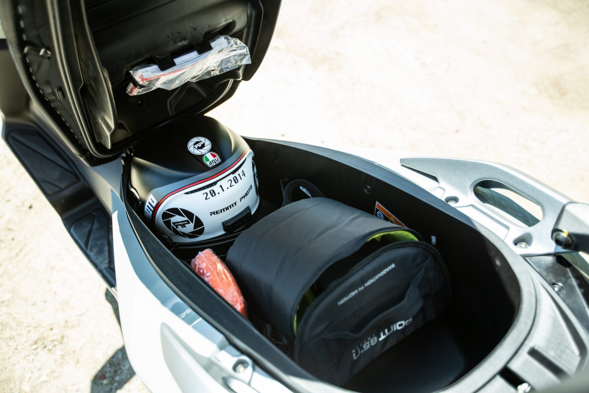 Pokiaľ by vám nestačilo dostatok úložného priestoru pod sedačkou tak si Forzu viete dovybaviť aj inteligentným kufrom. V dvoch veľkostiach a to menším s veľkosťou 35 litrov alebo o desať litrov väčším 45 litrovým. Na kufri ktorý si viete zladiť farebne so skútrom máte pre spolujazdca aj opierku nech má trošku pohodlia aj on. Ďalší odkladací priestor nájdete aj na ľavej strane pod riadidlami, ktorý je uzamykateľný a tak sa o veci v ňom báť nemusíte.