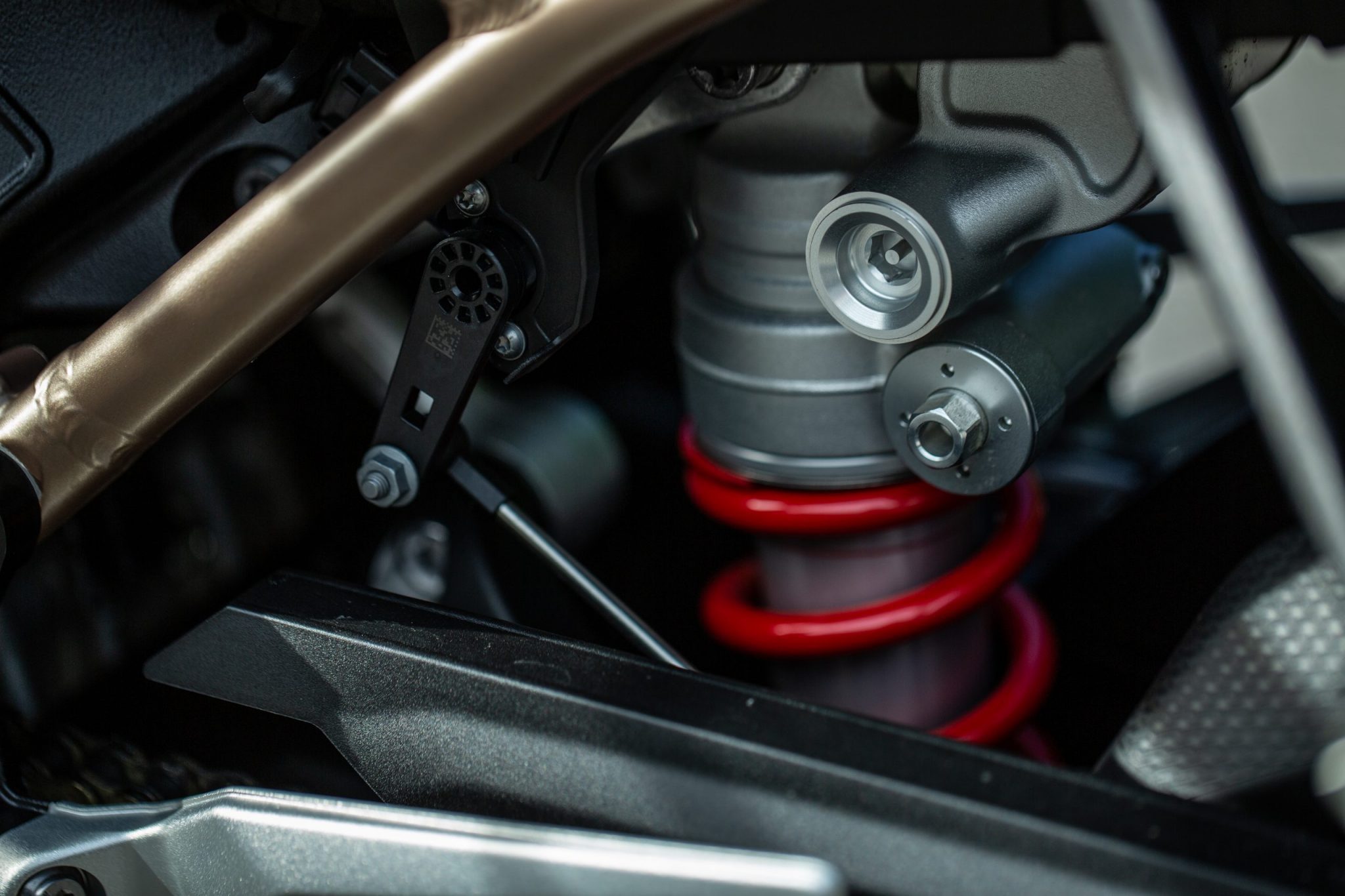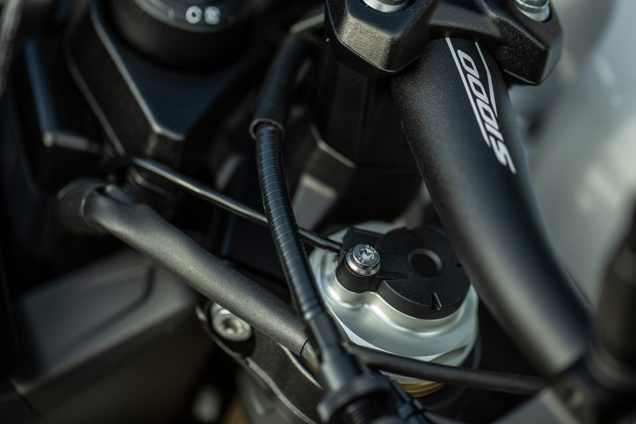 O zastavenie sa vám tu postarajú vpredu duálne kotúče s priemerom 320 milimetrov so štvorpiestikovými strmeňmi s ostrou a presnou reakciou na podnet z páčky. Vzadu je to zase 220 milimetrový kotúč s jednopiestikovým strmeňom. O stabilitu na ceste sa nám stará vpredu upside-down vidlica, ktorá je elektronicky nastaviteľná s priemerom 45 milimetrov. Vzadu je to zase hliníková kyvná vidlica s centrálnym pružením, ktorá je taktiež elektronicky nastaviteľná. Pruženie je ladené športovejšie a vďaka nastaviteľnosti celého aparátu pruženia si ho viete prispôsobiť presne na cestu, ktorou chcete ísť. Neprekvapí vás ani nerovnosť v zatáčke s ktorou si Sko s prehľadom poradí.