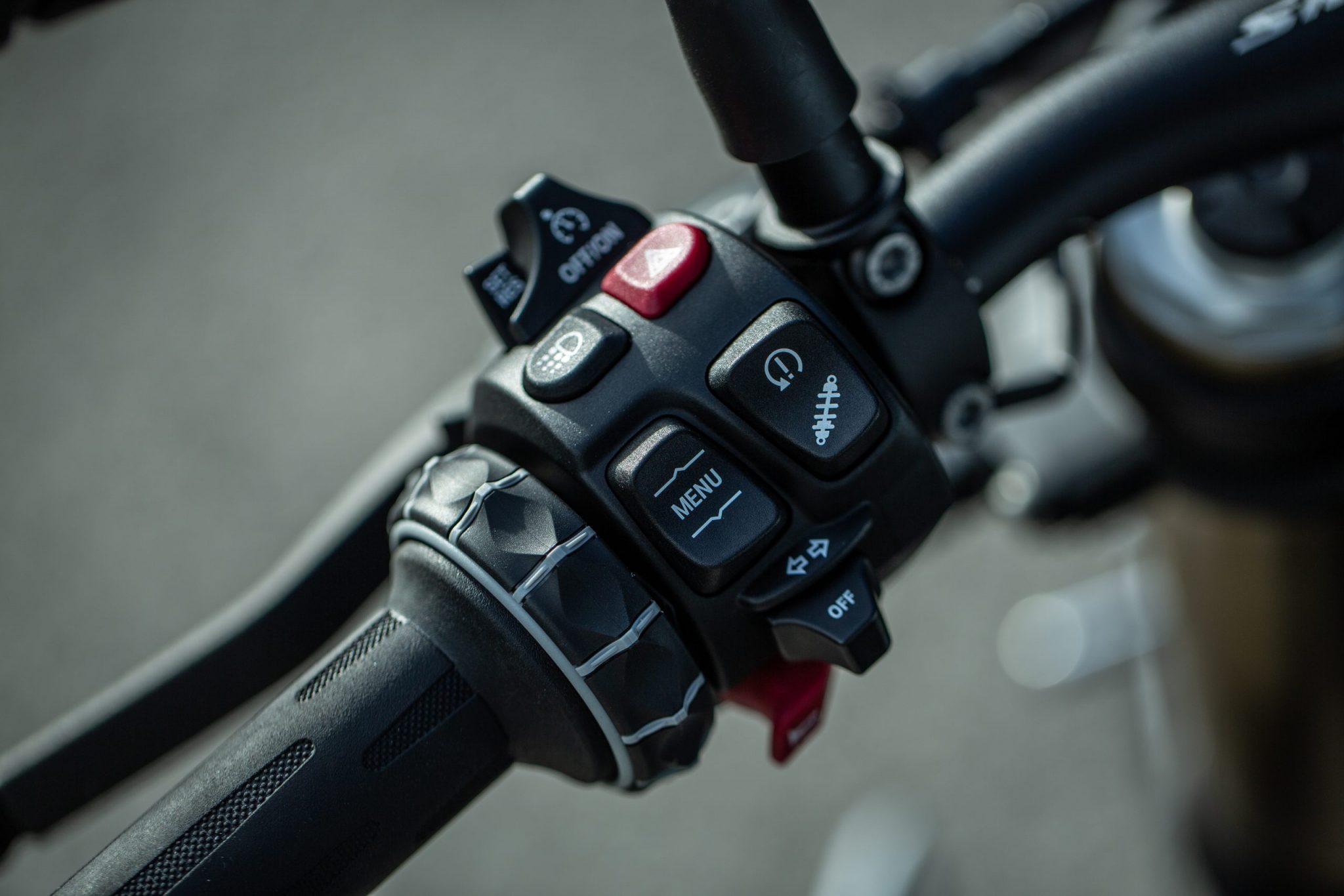 Na pravej rukoväti nájdete ovládanie vyhrievania rukovätí a prepínanie jednotlivých jazdných režimov. V našom testovanom Sku boli presne štyri. Rain, Roude, Dynamic a Dynamic Pro. Pro-čko je plne nastaviteľné a dovolí vám snáď najviac a zároveň sa s ním dá najlepšie zabaviť. Akurát škoda, že je len za príplatok. V ostatných režimoch je zápach elektroniky až príliš znateľný až miestami som mal dojem, že mi stačí oprieť sa a sledovať ako si s tým všetkým, čo pre ňu cesta pripraví, poradí.