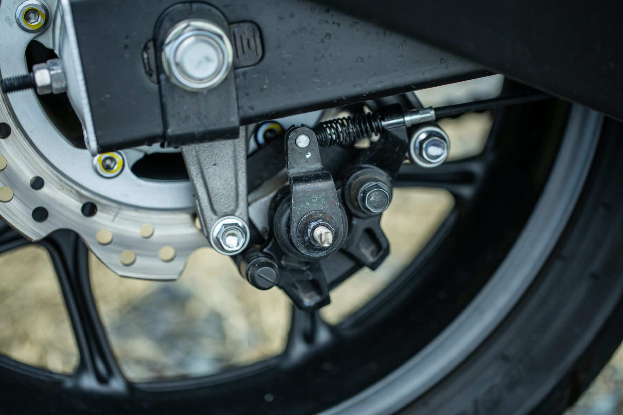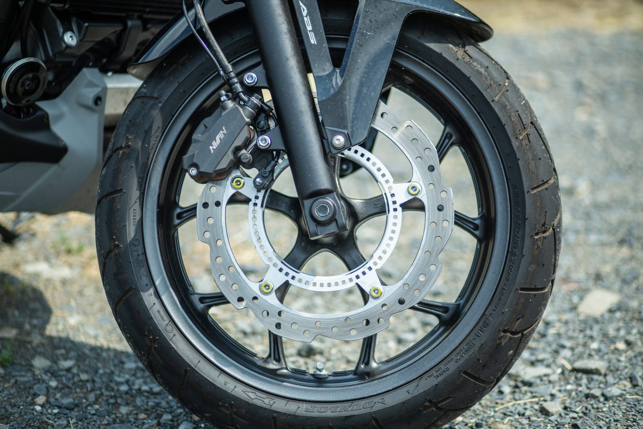 O zastavenie sa stará vpredu jeden 320 milimetrový kotúč s dvojpiestikovým strmeňom od Nisinu. Brzda je dobre dávkovateľná avšak ja by som prijal trochu lepšiu účinnosť a ostrejší nástup brzdného účinku. Ale s NC-čkom si poradí bez problémov a zastaví vás pomerne rýchlo. Vzadu je to zase 240 milimetrový strmeň s jednopiestikovým strmeňom. Tu však nájdeme ešte jeden strmeň navyše. Ten je lankový a je na spodnej strane kotúča. Tu sa jedná o ručnú brzdu ktorej ovládanie je rovnaké ako na Rebelovi kde je umiestnená na ľavej strane na riadidlách.