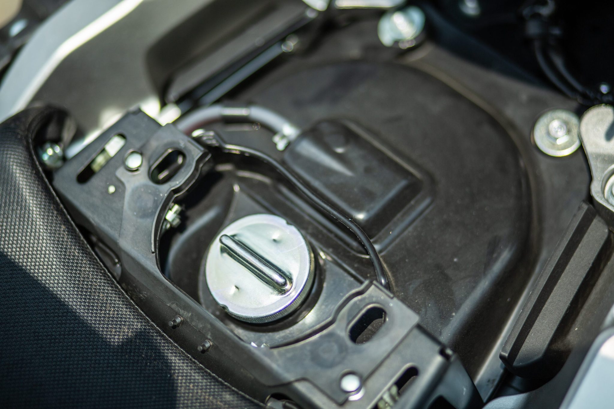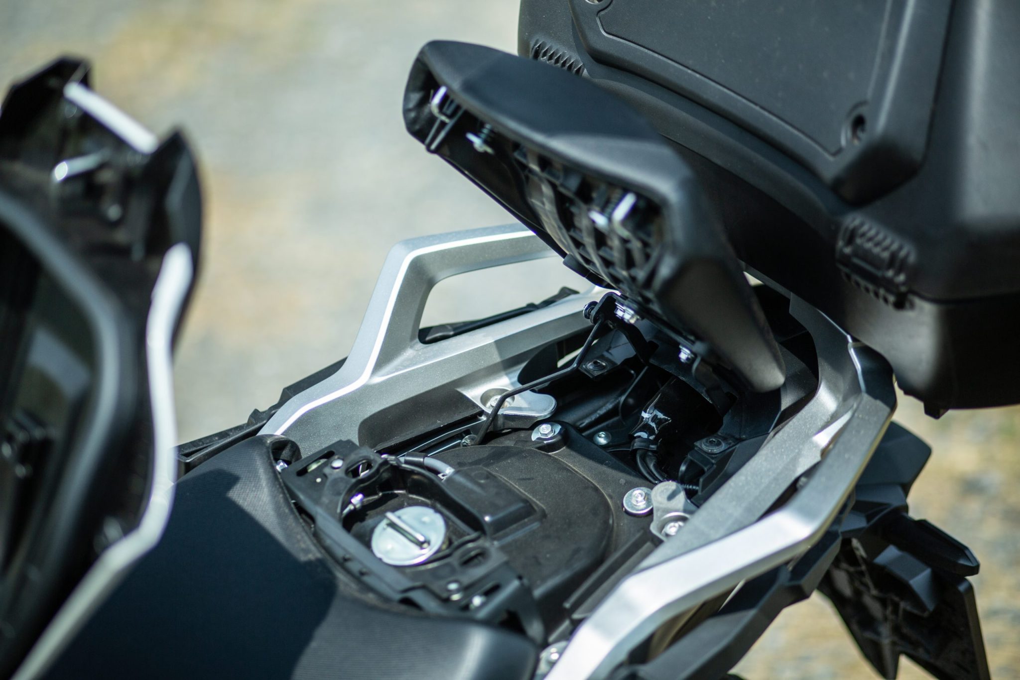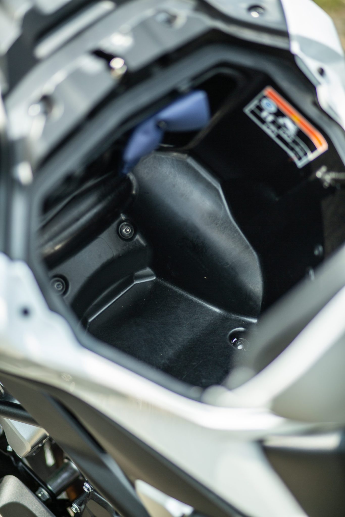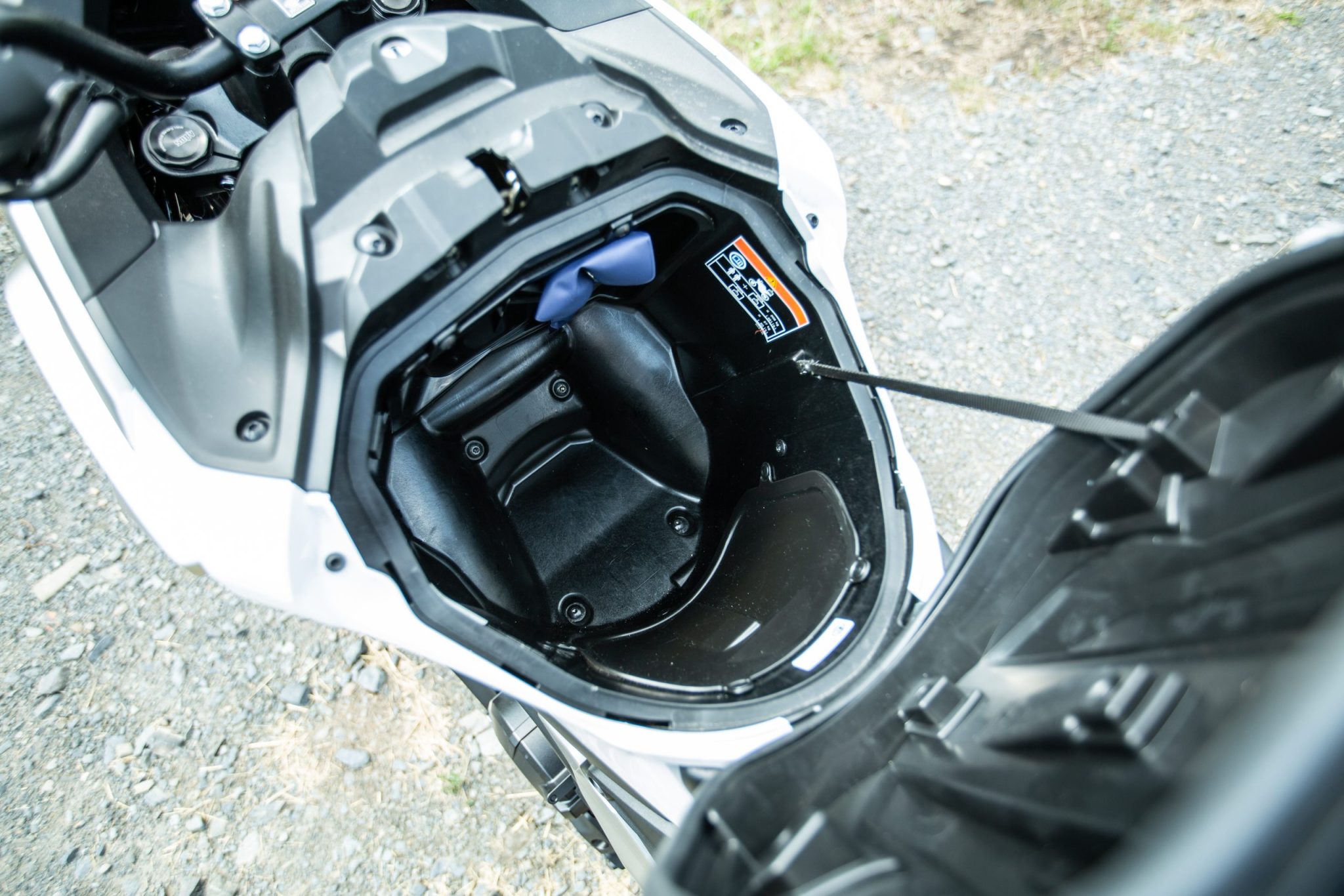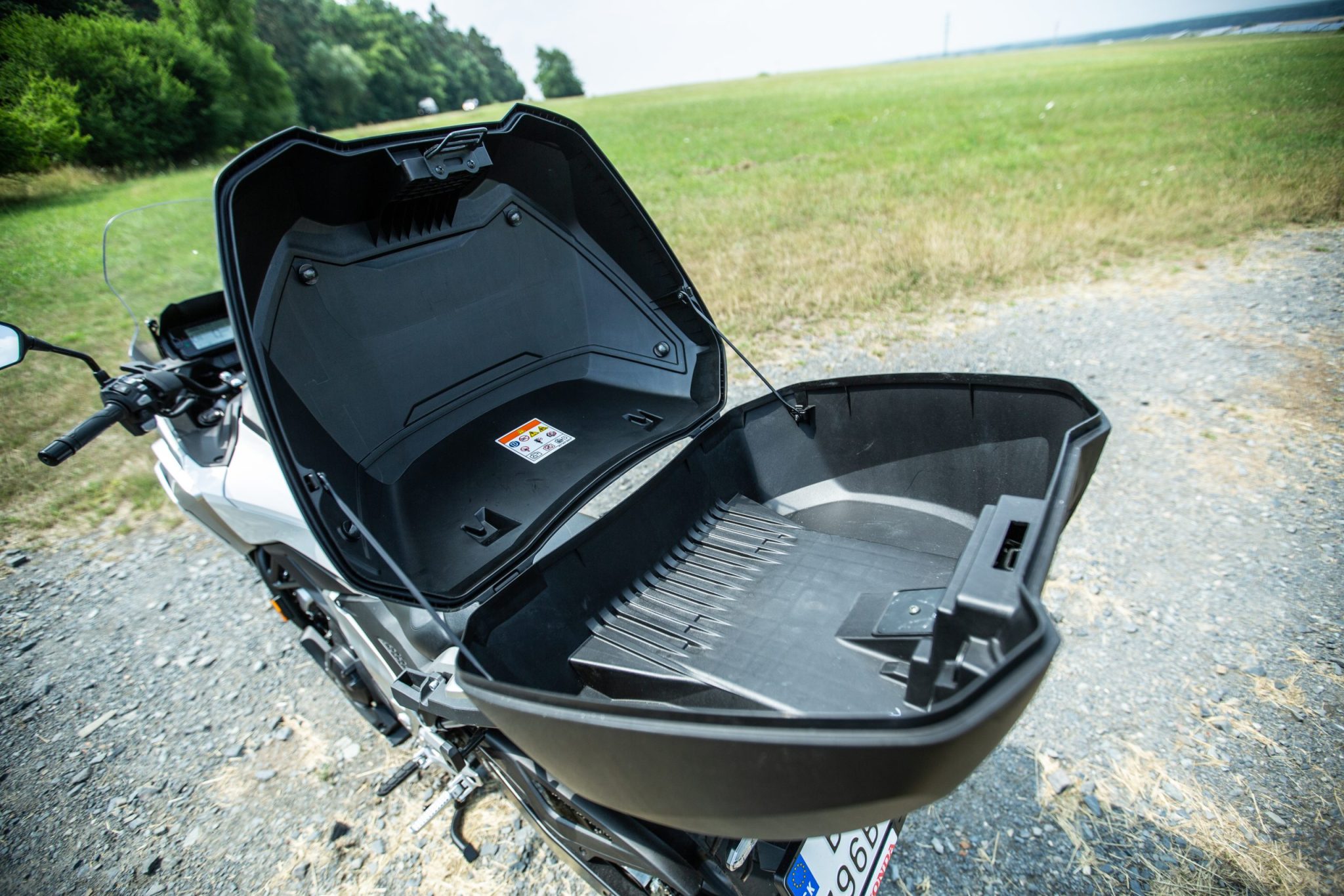 Ale čím je NC-čko naozaj zaujímavé je úložný priestor. Ten je väčší, za čo môžeme vďačiť najmä presunutiu palivovej nádrže pod sedadlo. Oproti prechádzajúcej generácií tak priestor narástol z maličkého 1 litra na neuveriteľných 23 litrov. Zmestí sa tam všetko potrebné, napríklad aj integrálna prilba a ešte vám zostane miesto aj na to nepotrebné. Aby sa prilba do modelu Honda NC 700X pohodlne zmestila nesmie mať namontovaný interkom! Moja AGV K6 sa tam zmestila len tak tak aj s namontovaným interkomom na boku.
