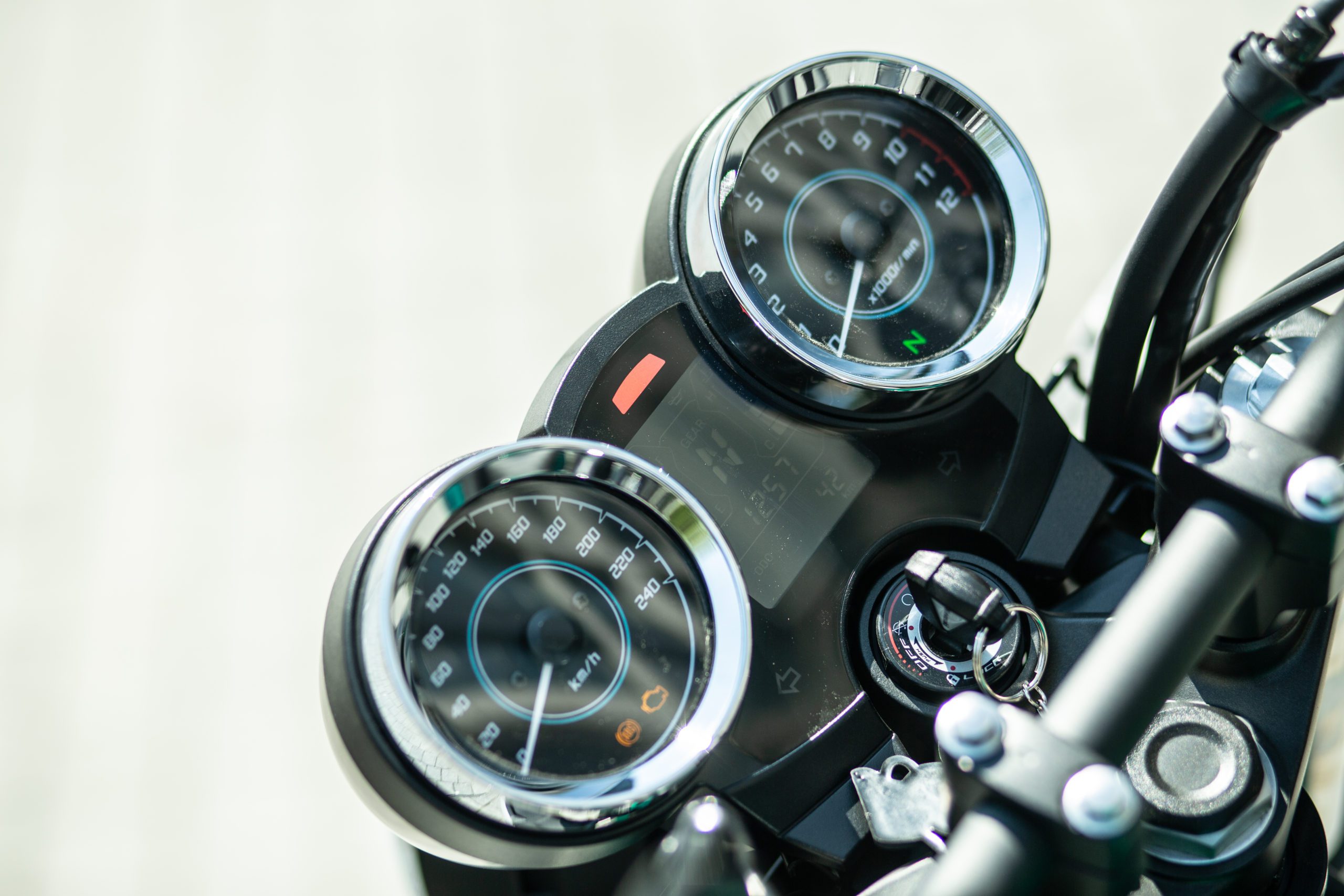 Ďalším retro prvkom na Kawasaki Z650 RS sú aj palubné prístroje v podobe dvoch guľatých ciferníkov v retro štýle olemovaných chrómom. Rýchlomer a otáčkomer sú spojené malým LCD displejom. Posed je naozaj uvoľnený a veľmi príjemný. Sedíte na ňom vzpriamene a ani po dlhej trase vás nebude bolieť chrbát či zadok, čomu vďačíme pohodlnému sedlu s výškou 820 milimetrov.