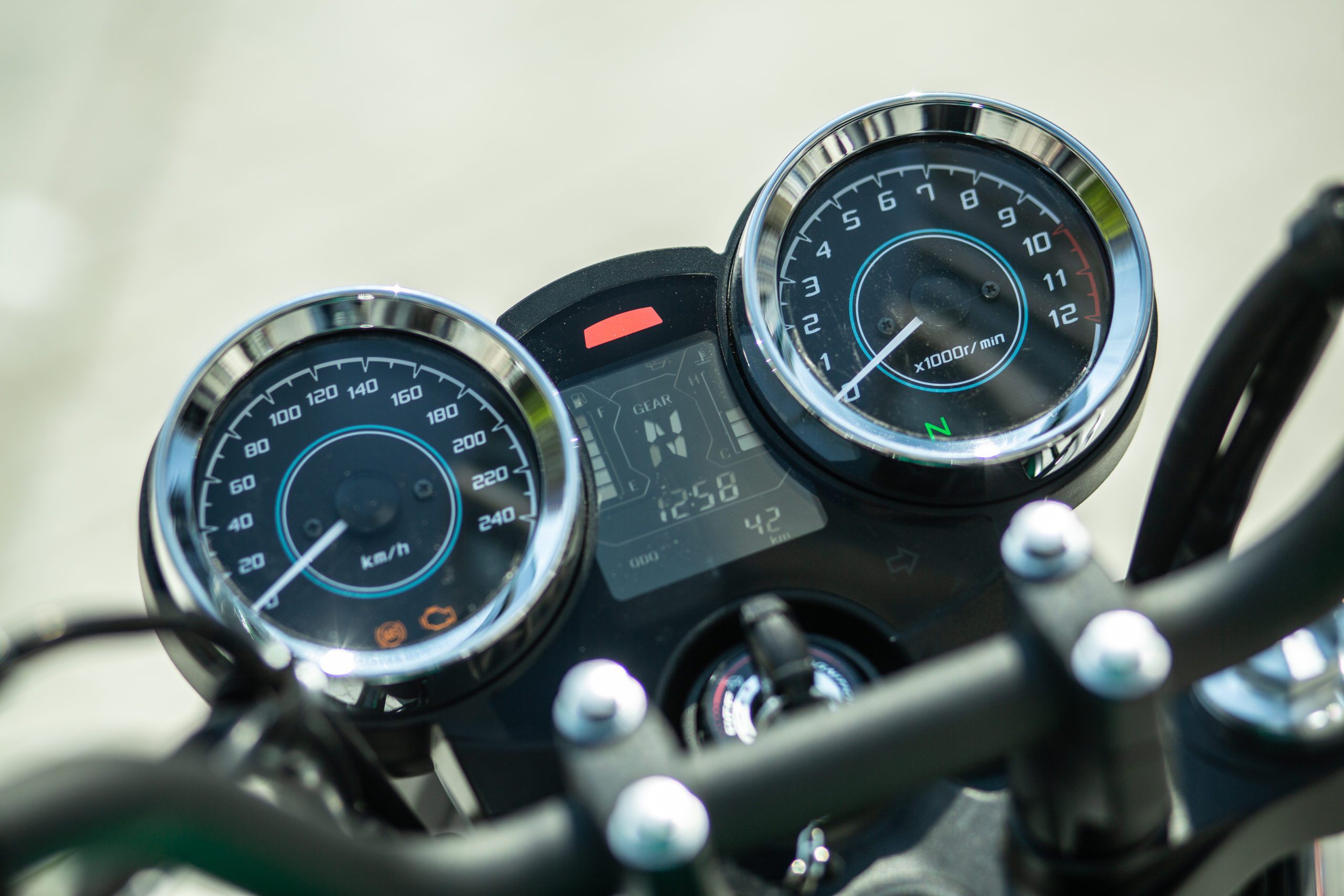 Ďalším retro prvkom na Kawasaki Z650 RS sú aj palubné prístroje v podobe dvoch guľatých ciferníkov v retro štýle olemovaných chrómom. Rýchlomer a otáčkomer sú spojené malým LCD displejom. Posed je naozaj uvoľnený a veľmi príjemný. Sedíte na ňom vzpriamene a ani po dlhej trase vás nebude bolieť chrbát či zadok, čomu vďačíme pohodlnému sedlu s výškou 820 milimetrov.