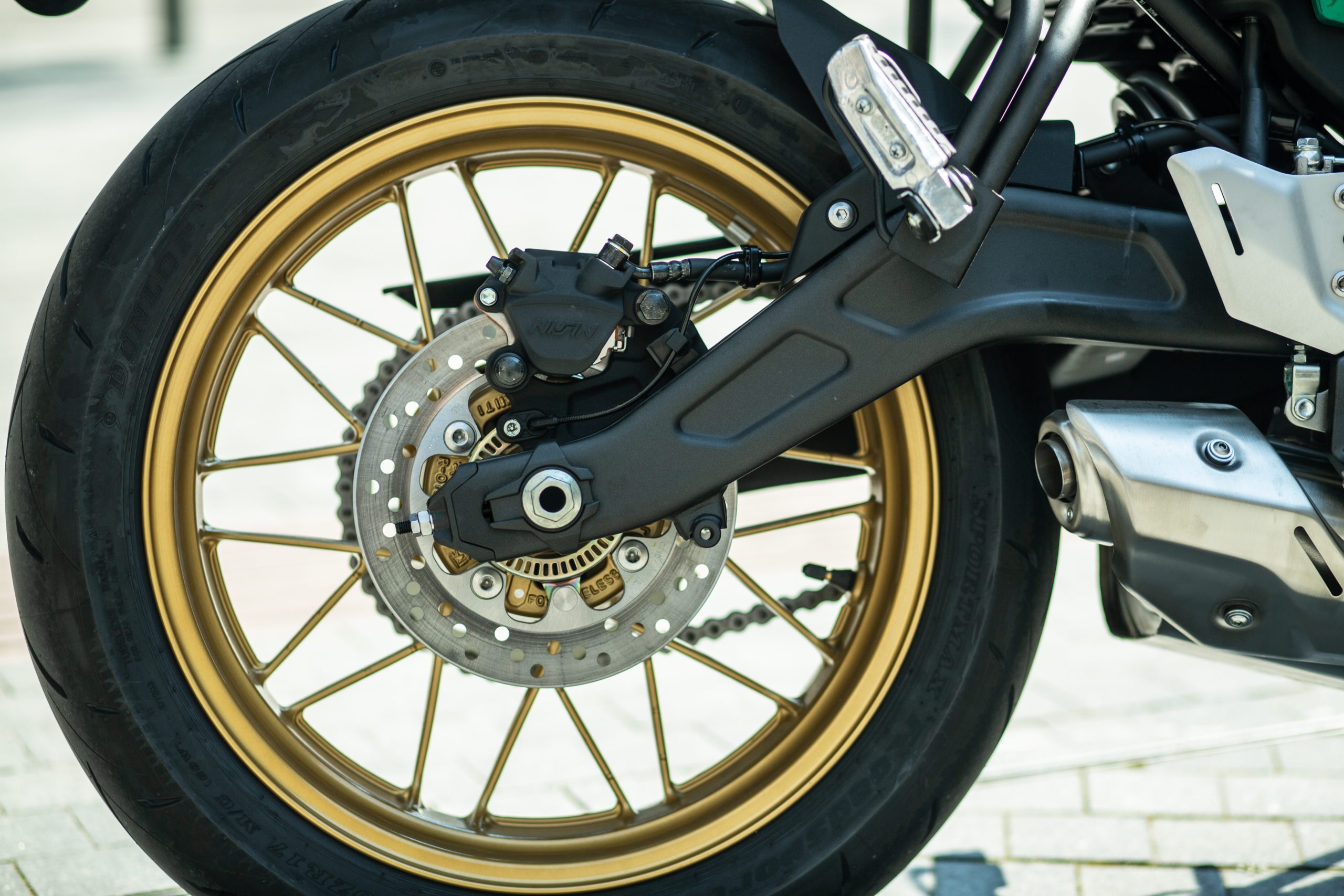 Aj keď technika je moderná tak celkový dojem z RSka 650 je presne retro, ktorý podčiarkuje aj dizajn kolies. Kolesá sú síce liatinové ale posnažili sa aby pripomínali klasické s drôteným výpletom. Musím uznať, že v zlatej farbe vyzerajú naozaj výborne.