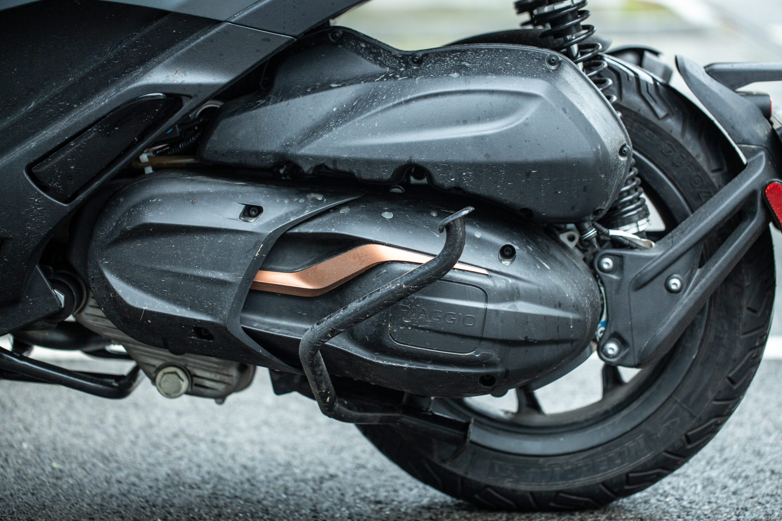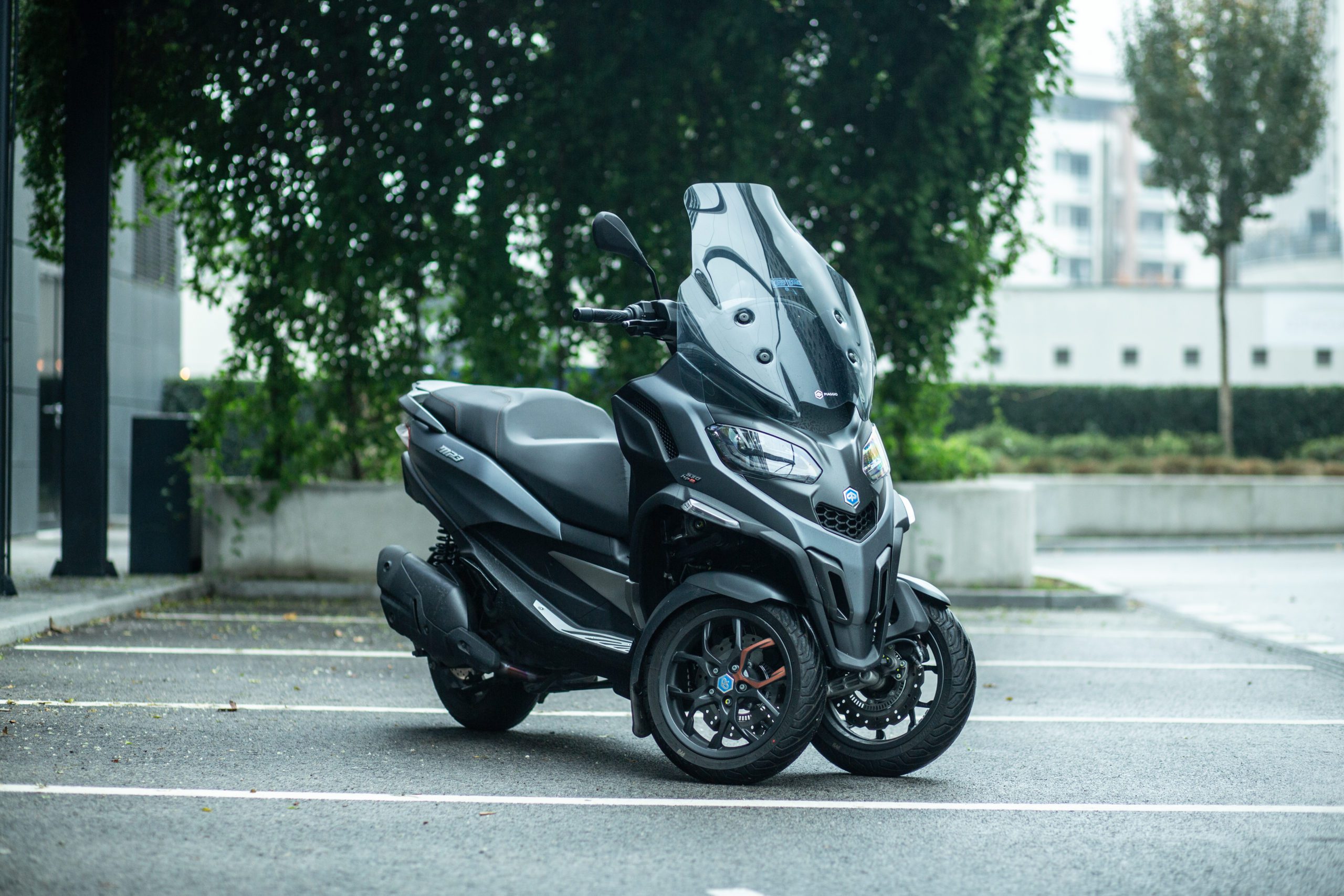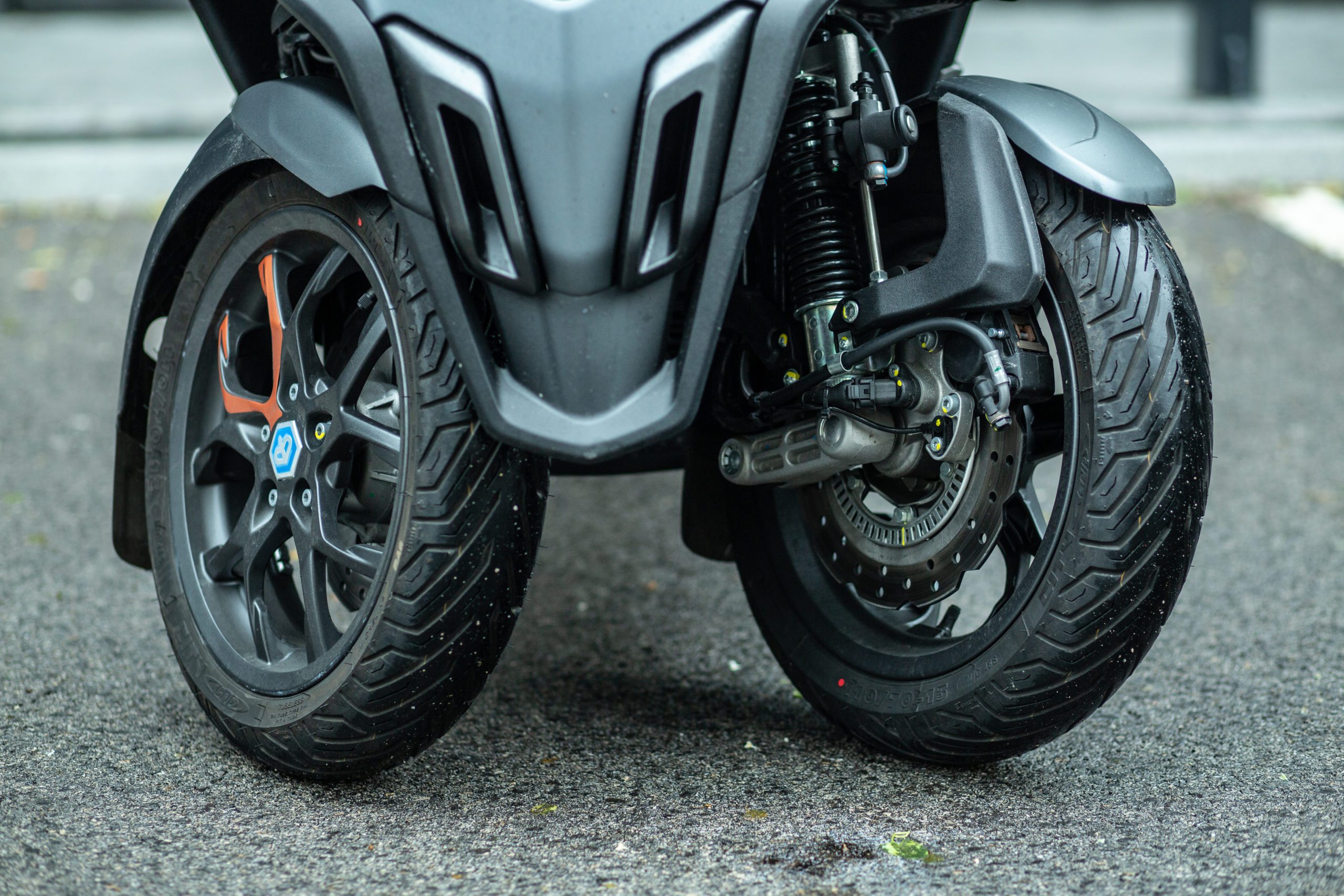 Brzdový systém je prepojený a brzdenie s pedálom je cítiť aj v oboch brzdových páčkach. Ďalšia veľmi zaujímavá vec je predné odpruženie. Predné kolesá sú zavesené nezávisle na sebe a keď s jedným prejdete po nerovnosti, ani to neucítite, pretože vám to druhé koleso úplne odfiltruje. Piaggo do predného zavesenia taktiež implementoval aj zámok systému naklápania, ktorý keď zamknete, tak vám skúter sám postojí bez potreby akéhokoľvek stojana. Aby vám neušiel, tak má aj ručnú brzdu.