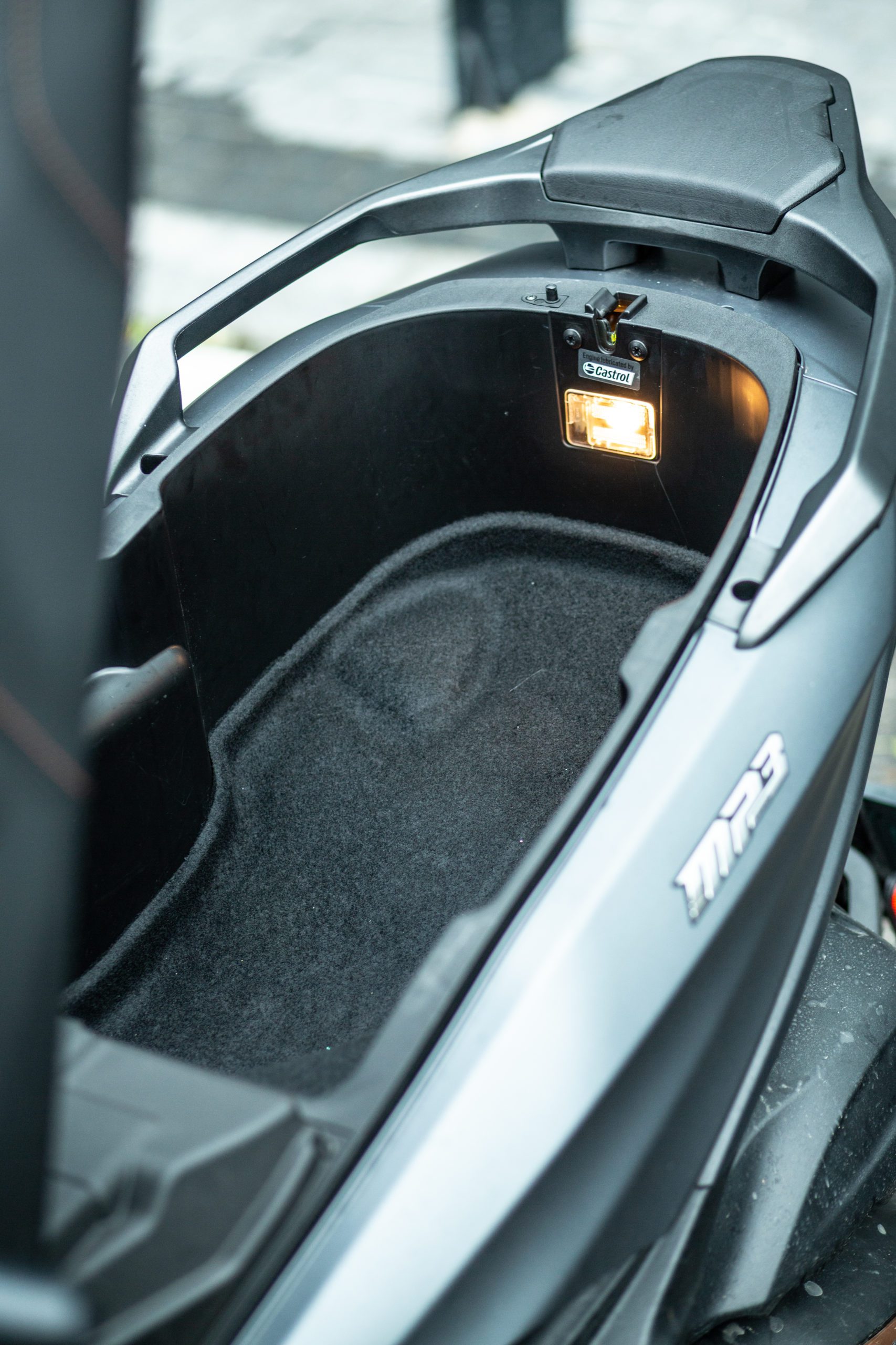 Ako som spomínal hneď v úvode, Piaggio MP3 Exclusive je taktiež nabitý elektronikou. Základom je 7-palcový TFT displej, ktorý je prehľadný a dobre čitateľný. Okrem klasických vychytávok, ako je trakčná kontrola, má MP3 aj tempomat či spiatočku so zadnou kamerou. Po pripojení telefónu cez aplikáciu Piaggo mia môžete počúvať hudbu cez interkom či ovládať telefón s ovládacími prvkami na ľavej rukoväti. Taktiež si na displeji viete zobraziť navigáciu. Keď vám začne dochádzať batéria na telefóne, USB zásuvka v odkladacom priestore nad displejom vám ho zase nabije. Je dostatočné veľká aj na ďalšie drobnosti, ktoré si tam viete odložiť. Odkladací priestor sa však nedá zamknúť, preto si vždy musíte skontrolovať, či ste si tam niečo nezabudli. Toto považujem za veľmi veľkú nevýhodu.