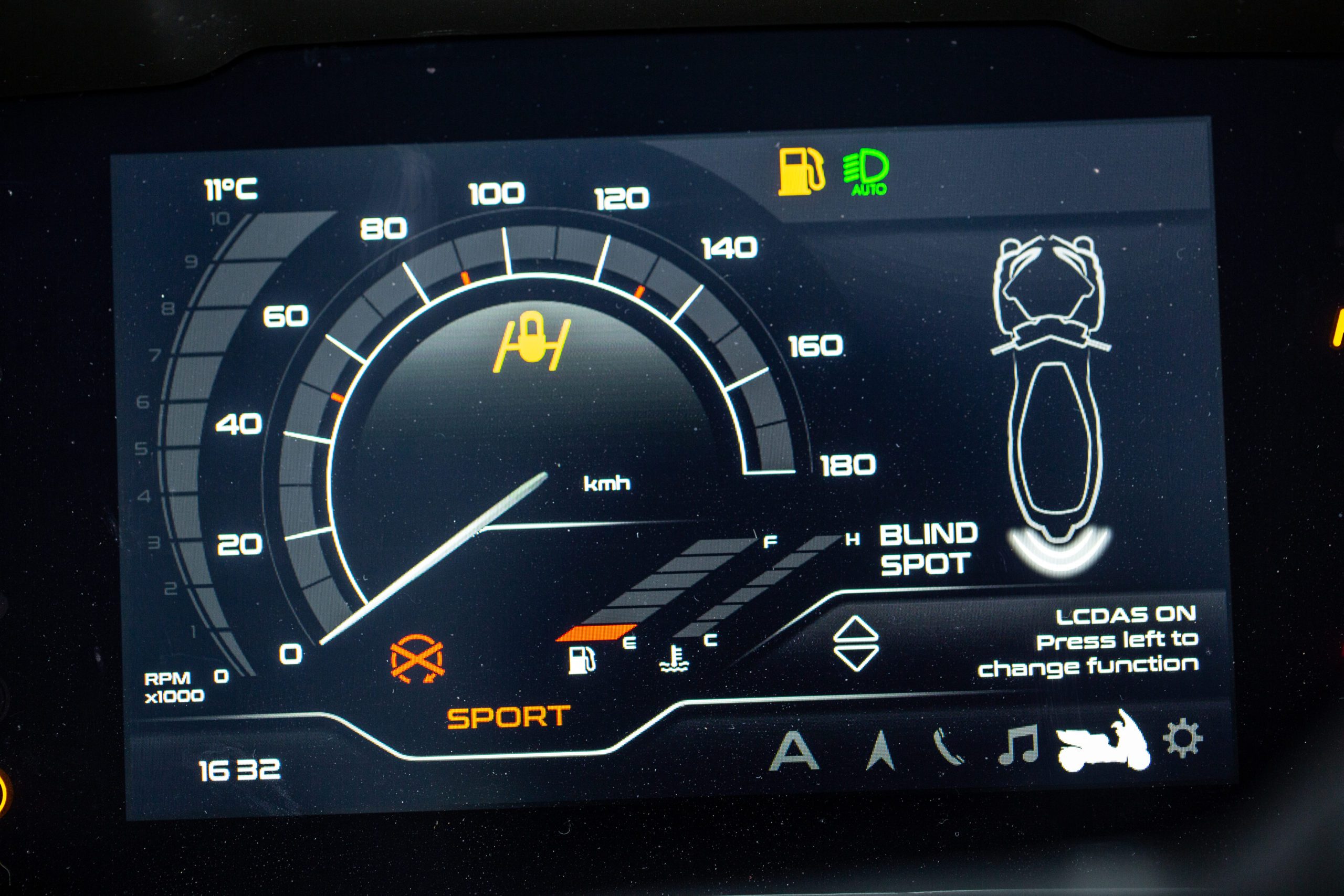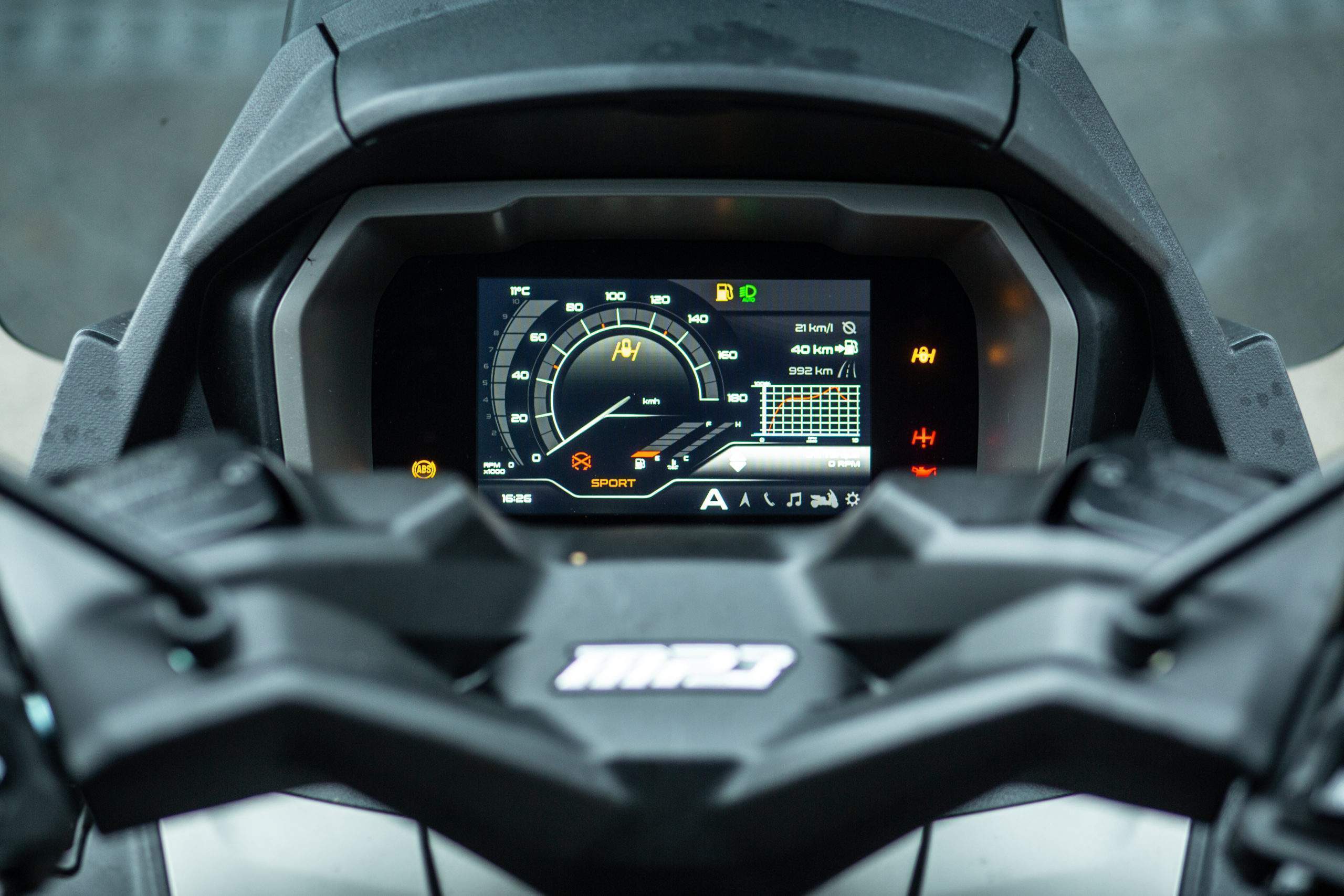 Čo ma na MP3 naopak príjemne prekvapilo, bol systém sledovania mŕtveho uhla, čo som zatiaľ videl len na jednej motorke. Tu síce upozornenie na prekážku v mŕtvom uhle neuvidíte v spätnom zrkadle ako sme zvyknutí z áut, ale rozbliká sa vám na displeji oranžová šípka na príslušnej strane. A áno, nemusíte sa báť, je dobre viditeľná aj počas jazdy s integrálnou prilbou, kde ju periférne zakaždým zaregistrujete.