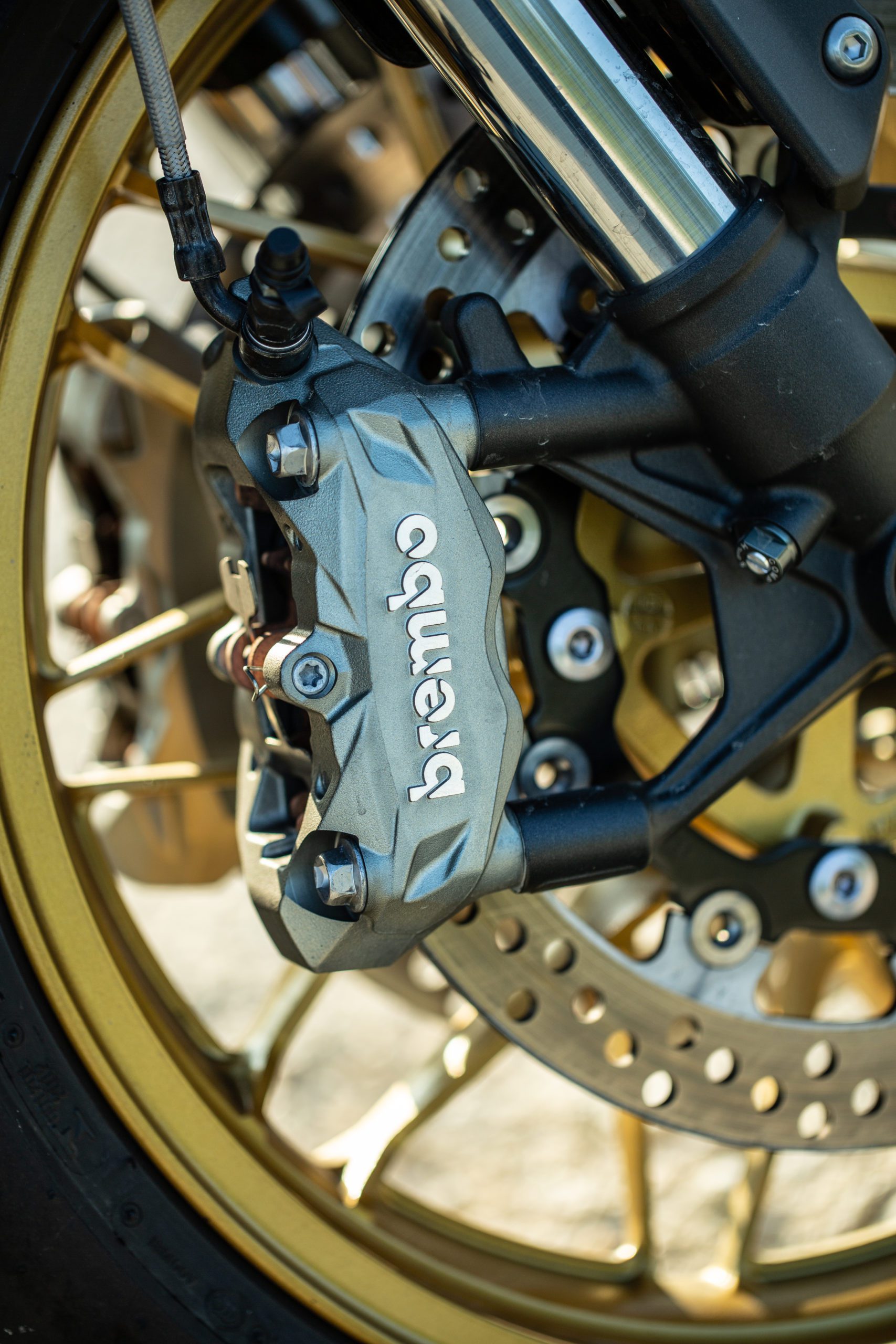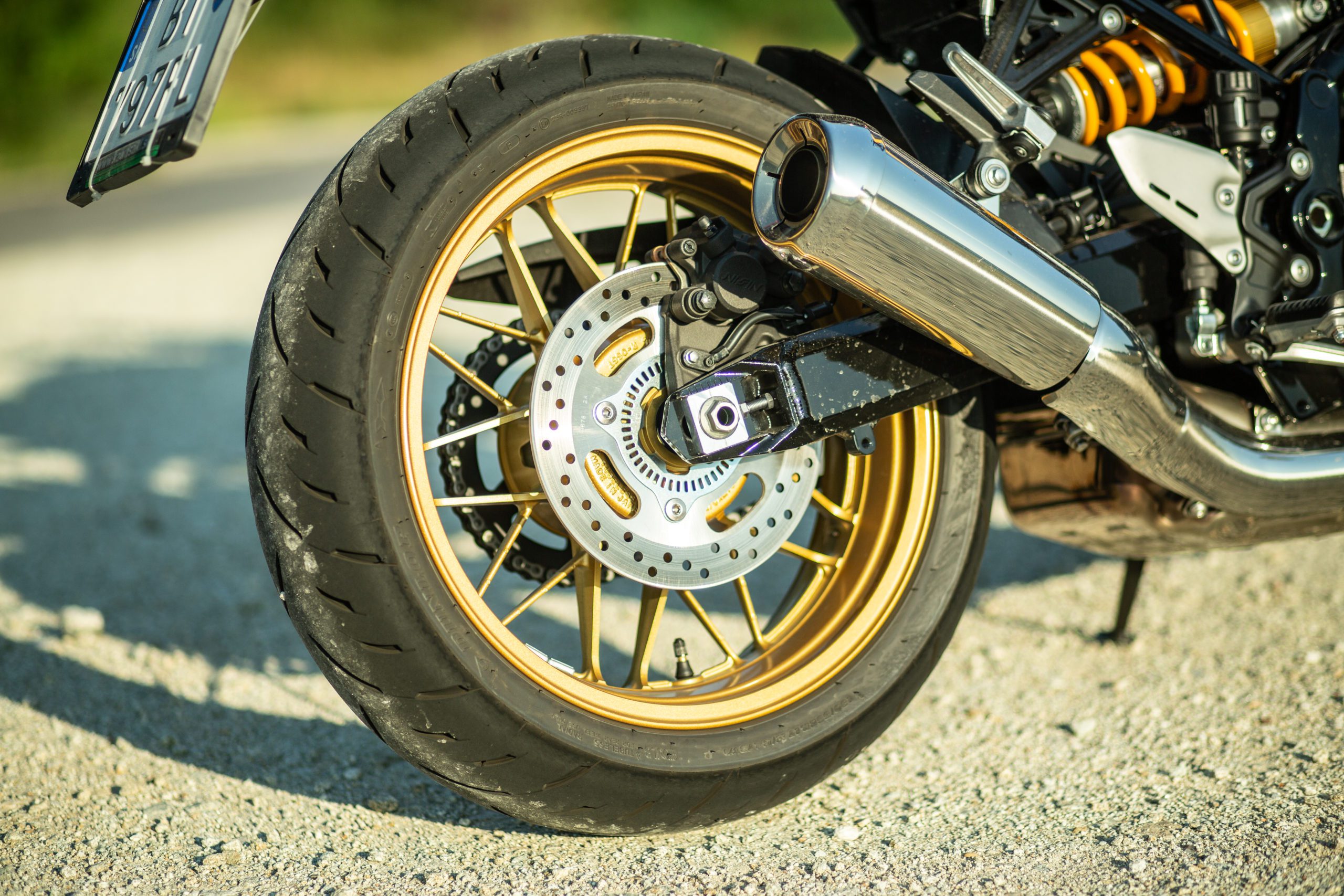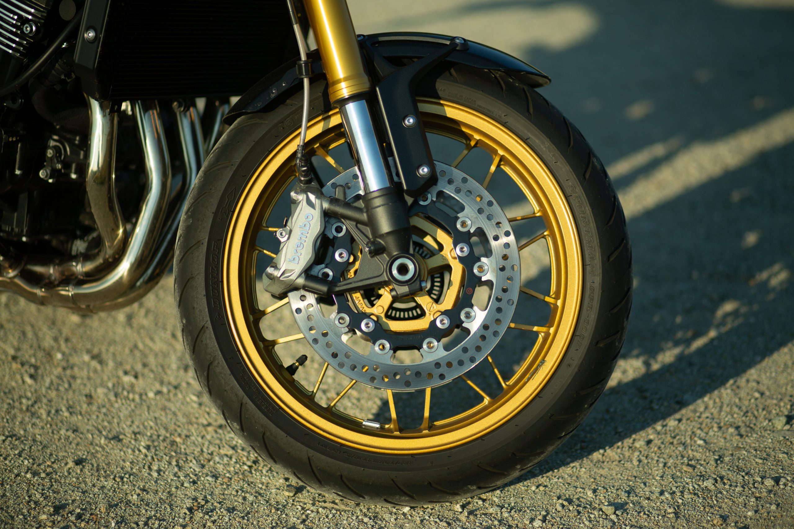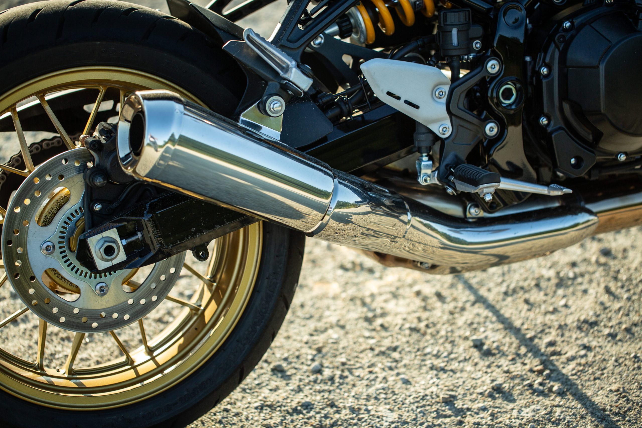 V modeli Kawasaki Z900RS SE je iný práve brzdový systém a podvozok. Vpredu sa nachádzajú dva 300 milimetrové kotúče Brembo, do ktorých sa zahryzávajú štvorpiestikové radiálne uchytené monobloky Brembo. Do tých tlačí kvapalinu cez opletené hadice radiálna pumpa od Nissinu. Brzdy sú tu odladené na výbornú, to sa musí nechať. Nie sú ani príliš “kúsavé” a agresívne, ale ani príliš mäkké. So SE-čkom si hravo poradia v akejkoľvek situácii. Vzadu sa nachádza 250-milimetrový kotúč s jednopiestikovým strmeňom. Tu je už ale strmeň od spoločnosti Nissin.