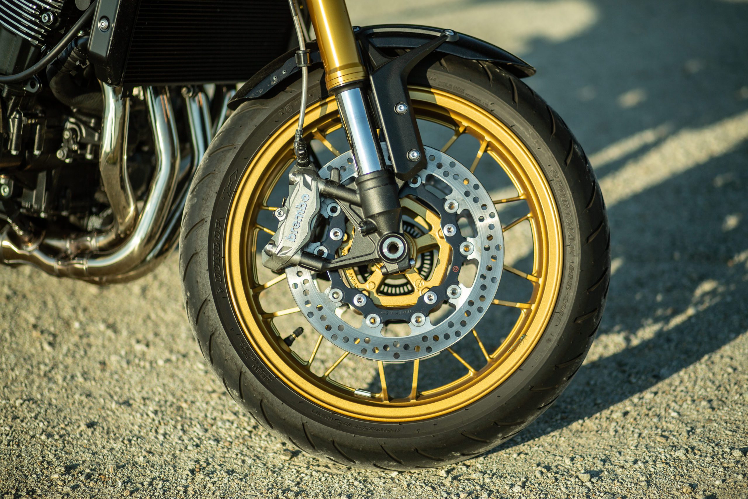 V modeli Kawasaki Z900RS SE je iný práve brzdový systém a podvozok. Vpredu sa nachádzajú dva 300 milimetrové kotúče Brembo, do ktorých sa zahryzávajú štvorpiestikové radiálne uchytené monobloky Brembo. Do tých tlačí kvapalinu cez opletené hadice radiálna pumpa od Nissinu. Brzdy sú tu odladené na výbornú, to sa musí nechať. Nie sú ani príliš “kúsavé” a agresívne, ale ani príliš mäkké. So SE-čkom si hravo poradia v akejkoľvek situácii. Vzadu sa nachádza 250-milimetrový kotúč s jednopiestikovým strmeňom. Tu je už ale strmeň od spoločnosti Nissin.