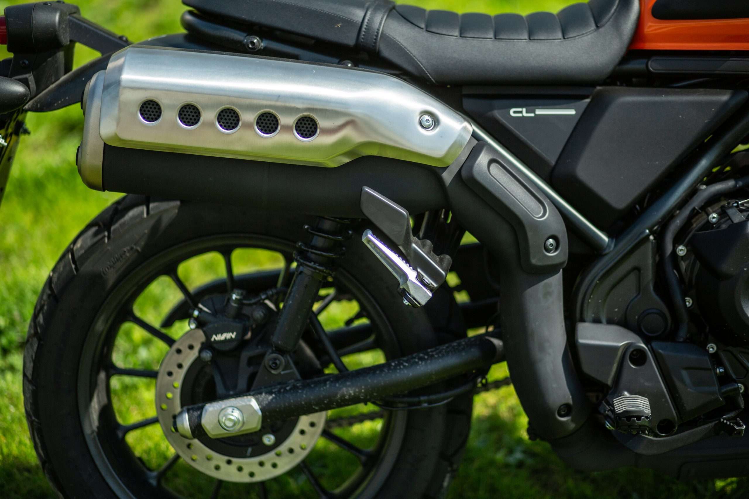 Aby Honda CL500 aj spoľahlivo zastavovala, dostala do vienka vpredu jeden plávajúci kotúč s rozmerom 310 milimetrov a dvojpiestikovým strmeňom Nissin. Reakcia je taká akurát a pre moderného Scramblera absolútne dostatočná. S pokojom Angličana sa CL-ko prebrzdí akoukoľvek situáciou. Dávkovanie a cit na brzdovej páčke je dobrý a dostatočne presný. Osobne by som však prijal väčšiu agresivitu na páčke, zvládne aj ovládanie dvoma prstami bez akýchkoľvek výhovoriek. Vzadu nájdeme 240-milimetrový kotúč s jednopiestikovým strmeňom.