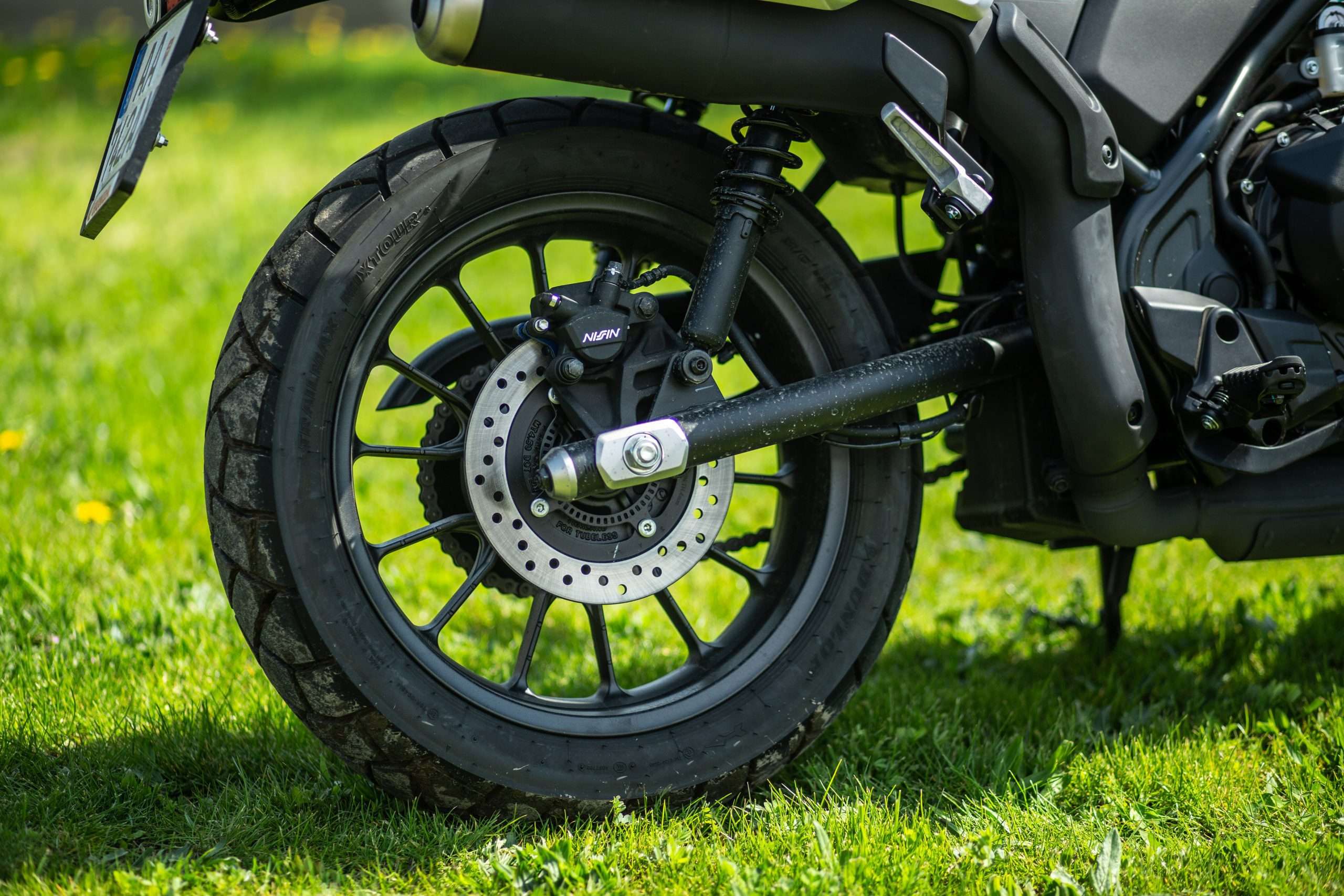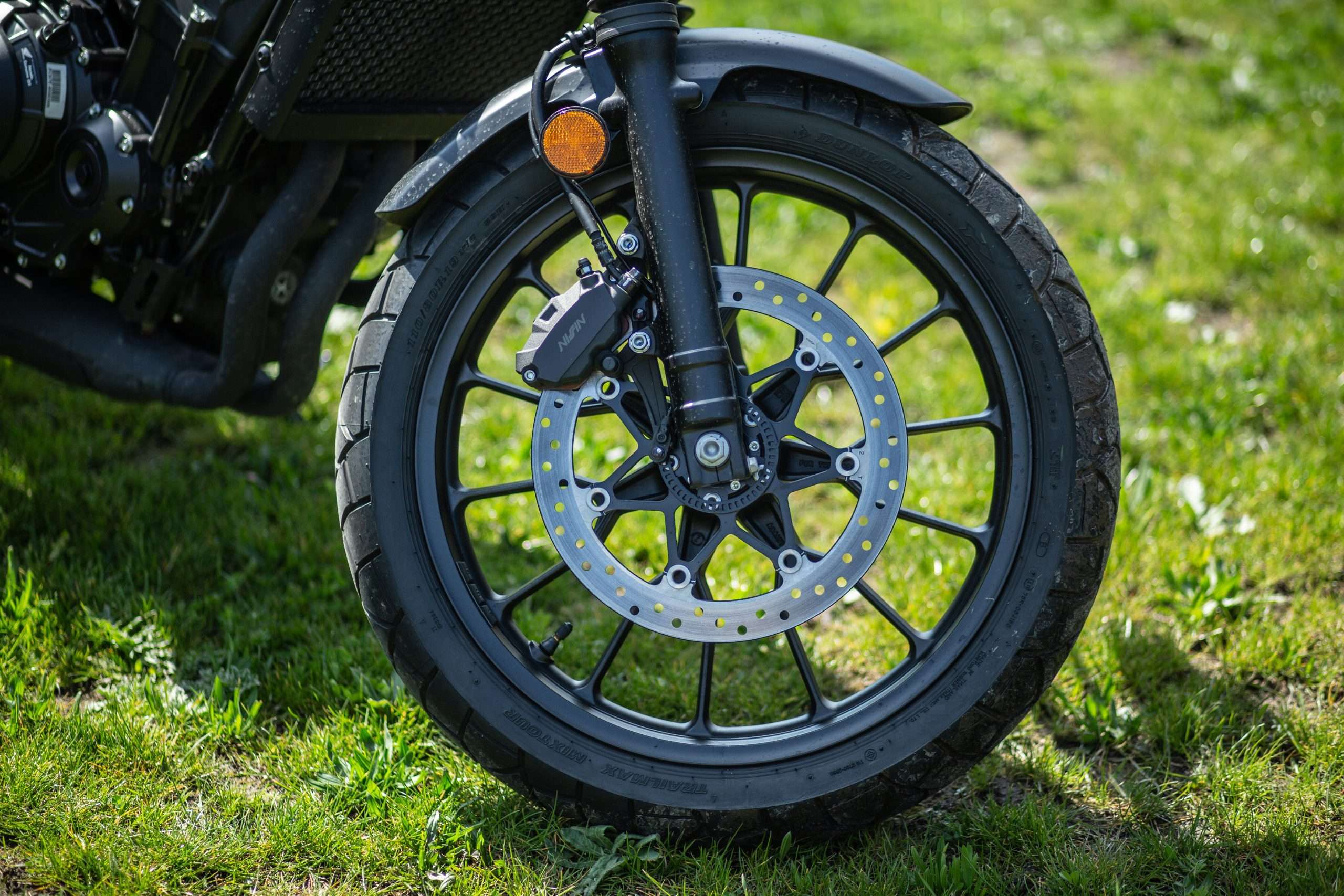 Aby Honda CL500 aj spoľahlivo zastavovala, dostala do vienka vpredu jeden plávajúci kotúč s rozmerom 310 milimetrov a dvojpiestikovým strmeňom Nissin. Reakcia je taká akurát a pre moderného Scramblera absolútne dostatočná. S pokojom Angličana sa CL-ko prebrzdí akoukoľvek situáciou. Dávkovanie a cit na brzdovej páčke je dobrý a dostatočne presný. Osobne by som však prijal väčšiu agresivitu na páčke, zvládne aj ovládanie dvoma prstami bez akýchkoľvek výhovoriek. Vzadu nájdeme 240-milimetrový kotúč s jednopiestikovým strmeňom.