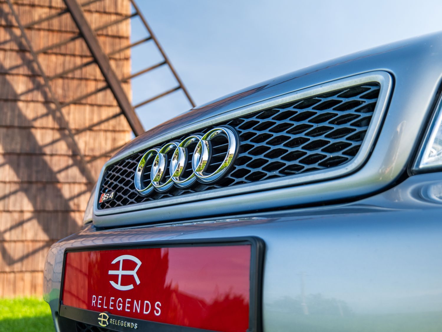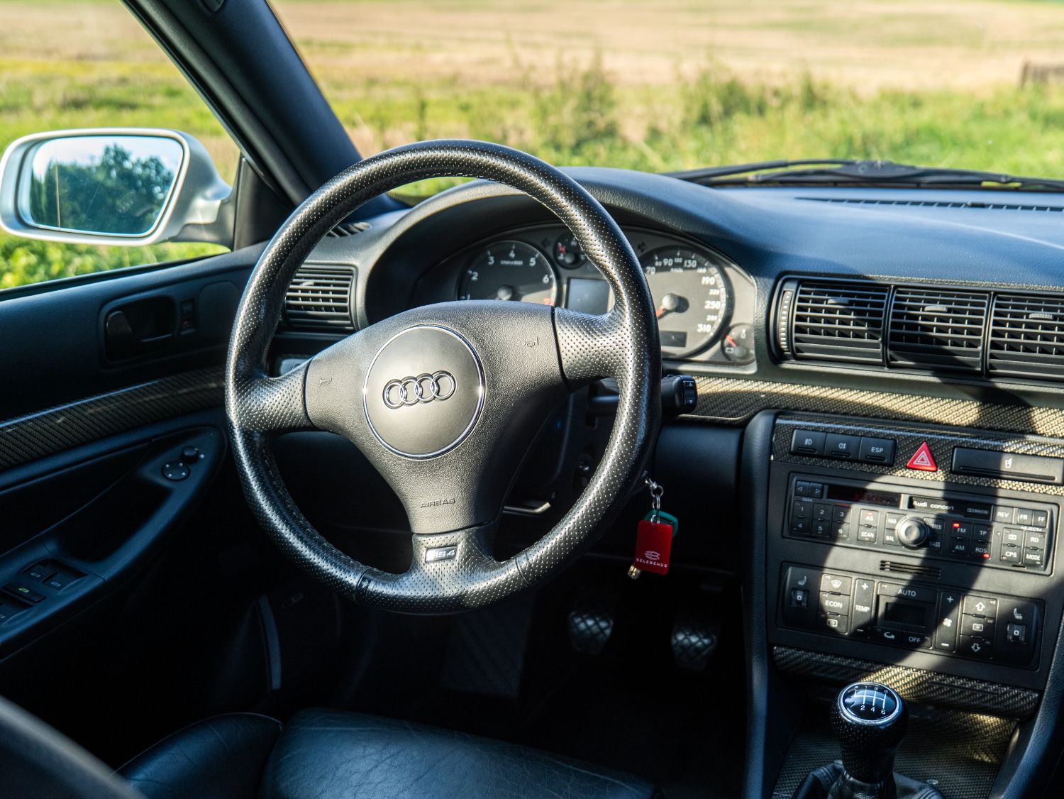 Testovaný exemplár nesie lak Avus Silver, jeden z typických odtieňov pre RS modely konca deväťdesiatych rokov. Interiér tvorí čierna koža doplnená karbónovými dekoráciami, ktoré nahradili tradičné drevené alebo hliníkové obklady. Výbava zahŕňa originálne 18-palcové disky, xenónové svetlomety, hliníkový optický paket, tempomat a audio systém BOSE spojený s rádiom Audi Concert. Tónované sklá dopĺňajú vizuálny prejav a zvýrazňujú decentný charakter auta.