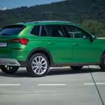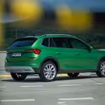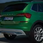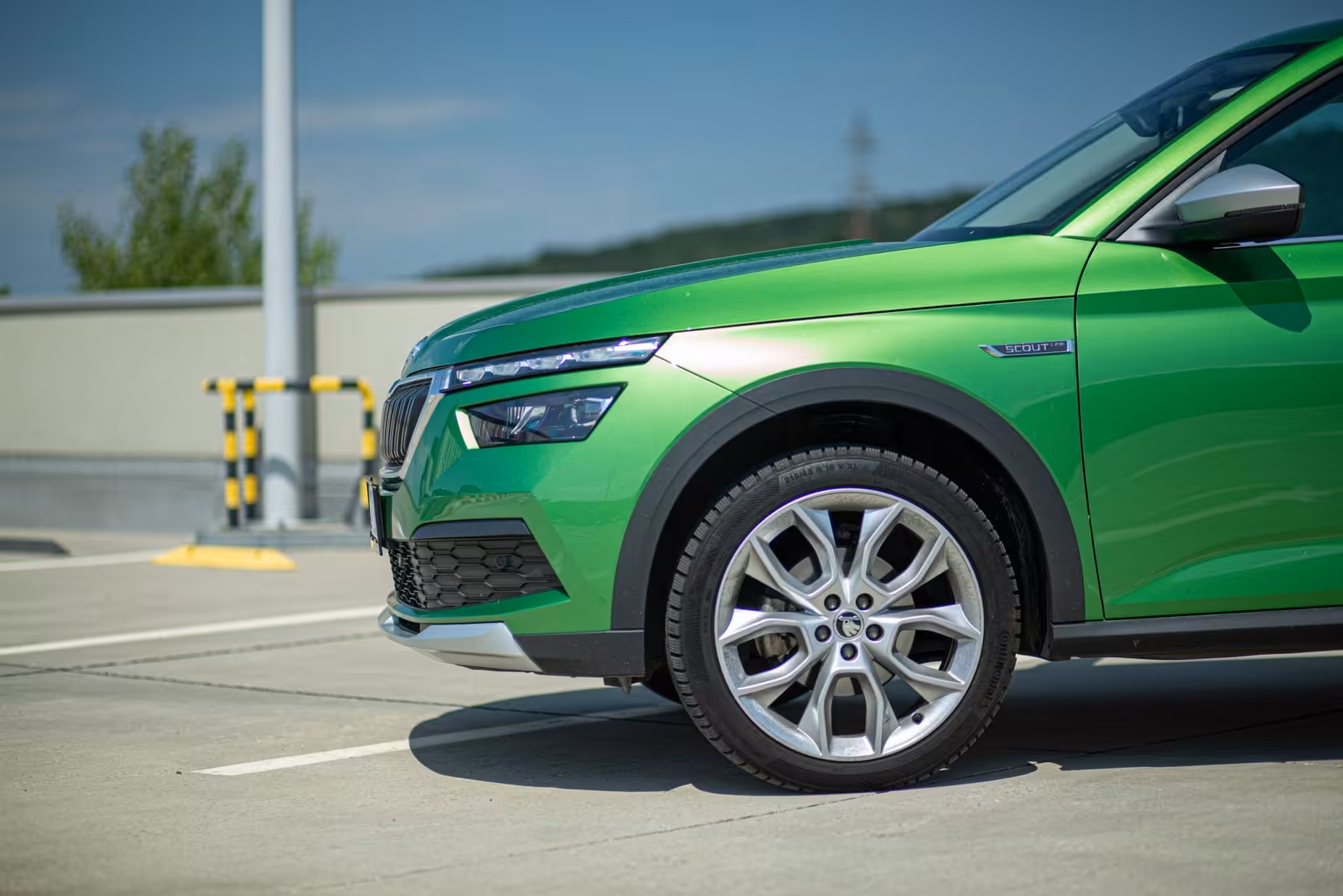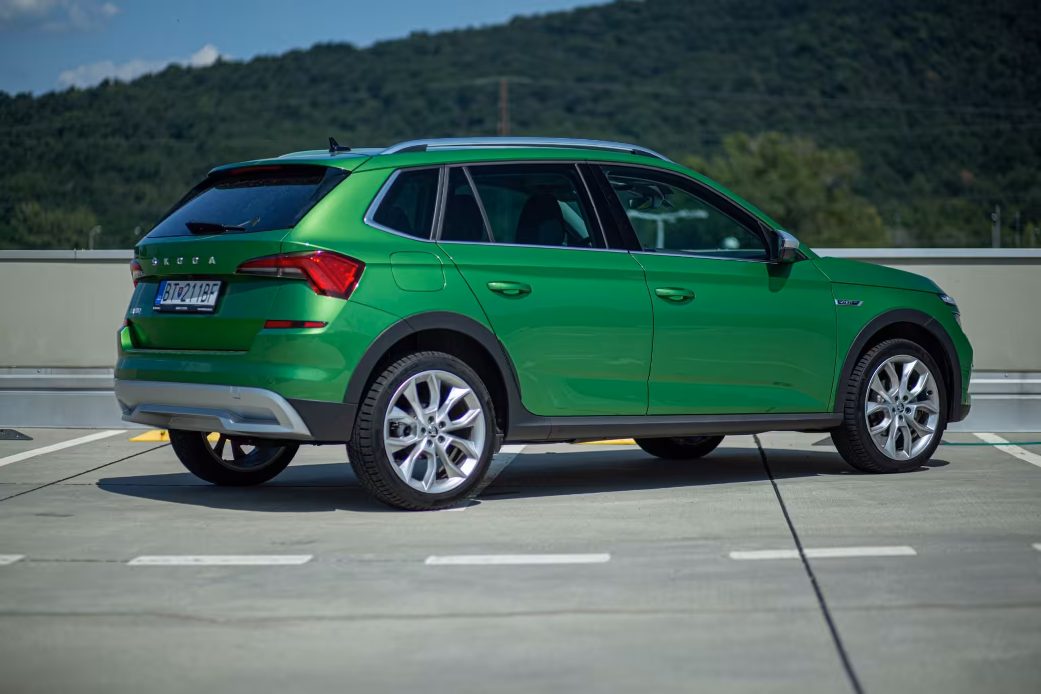 Exteriér je doplnený o plastové lemy blatníkov, ktoré sú akousi modlou výbavy Scoutline. Tie sú doplnené o strieborné nosiče, kryty spätných zrkadiel a plaketky Scoutline. Pekný dojem zanechávajú aj 18“ disky kolies, ktoré sú príplatkové, rovnako aj zelená metalíza Rallye. Osobne, keby si má vybrať Kamiq, tak rozhodne zvolím farbu, ktorá dokáže toto auto rozžiariť tak, aby nesplývala s okolím. Zelená farba má určite za mňa bonusových 100 bodov.