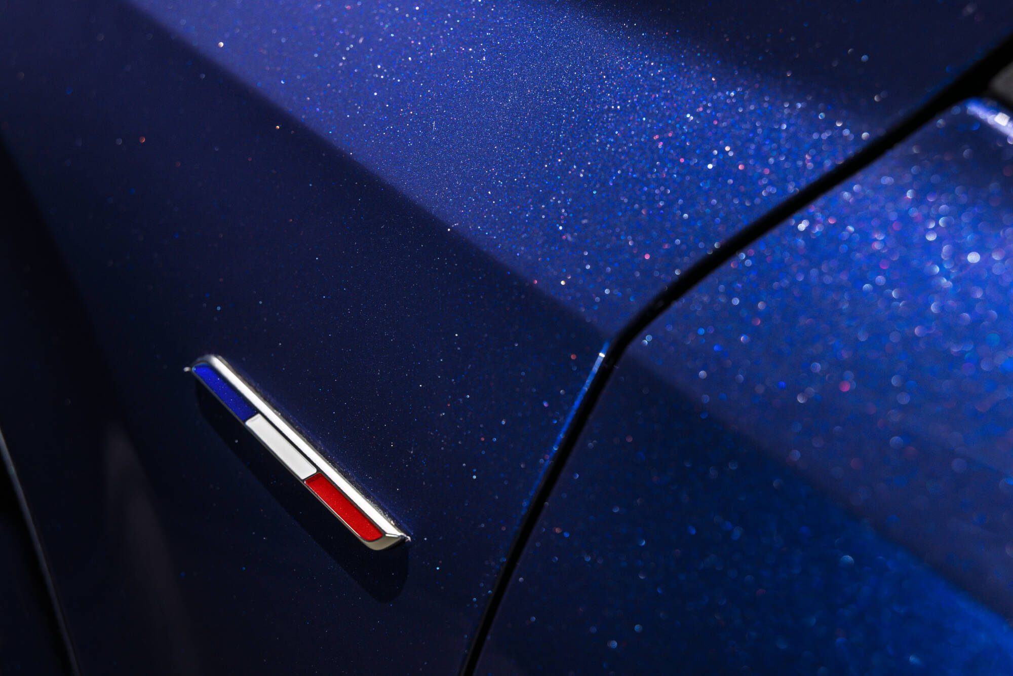 Koža pochádza z vybraných odrezkov a bola prepracovaná do špecifických odtieňov. Modré prešívanie bolo starostlivo zvolené tak, aby zodpovedalo oficiálnej farebnej škále Francúzska. Opierky hlavy zdobí jemná laserová rytina francúzskeho štátneho znaku – pelta s liktorským zväzkom prútov a ratolesťami duba a olivy. Na zadnej strane predných sedadiel sa nachádzajú diskrétne a praktické vrecká na mapy, určené na drobnosti pre pasažierov. Jednou z hlavných výziev bolo zabezpečiť vetranie zadných sedadiel. To si vyžadovalo vysokú úroveň technickej expertízy, aby sa zachoval komfort bez narušenia elegancie celkového dizajnu.