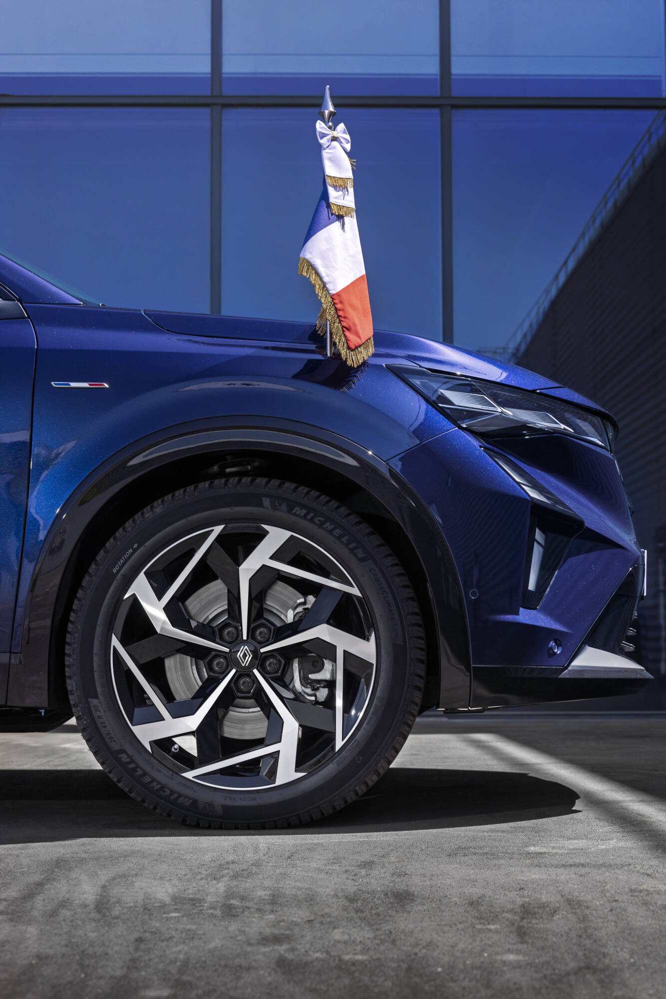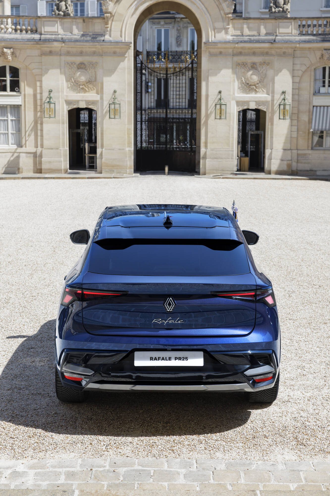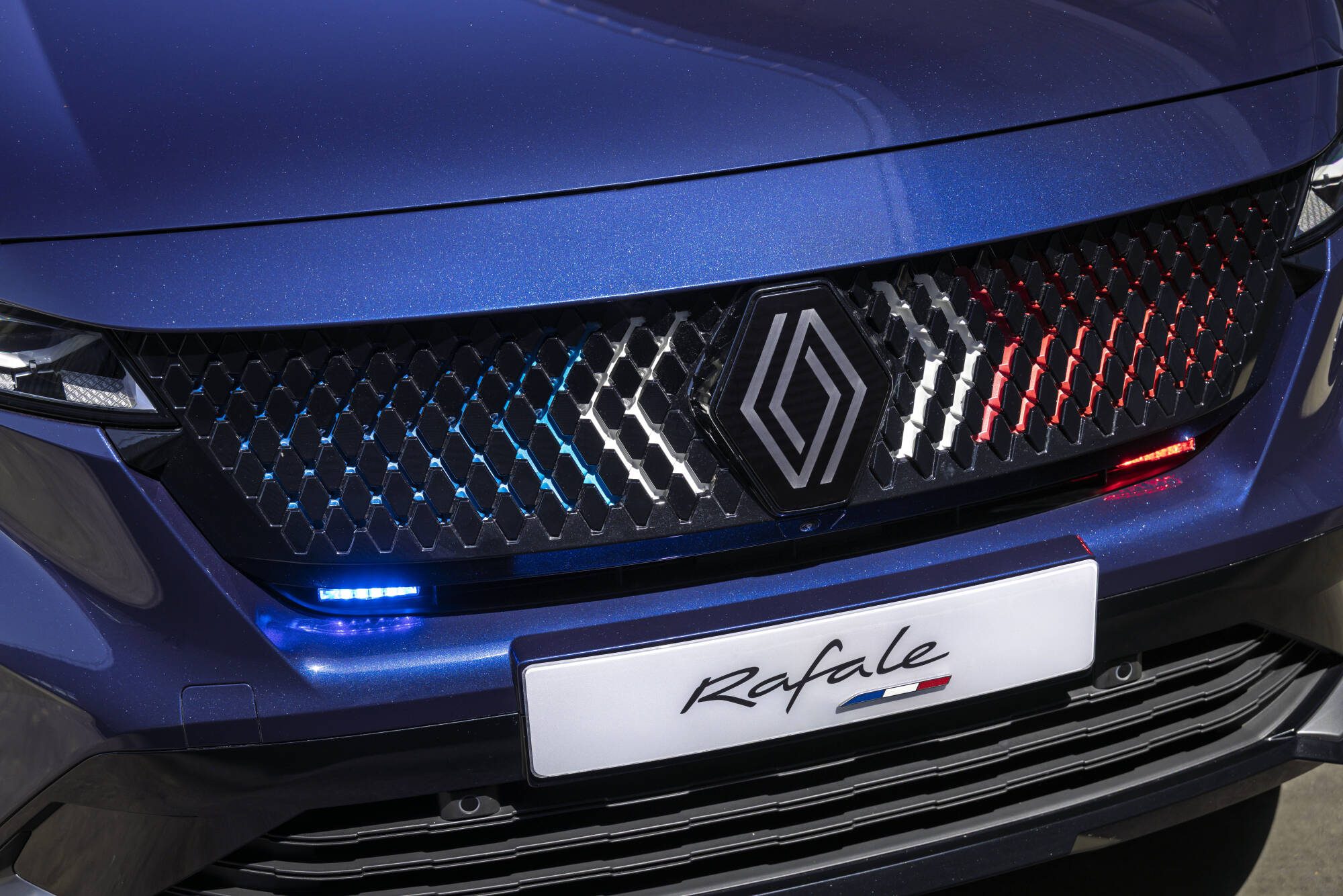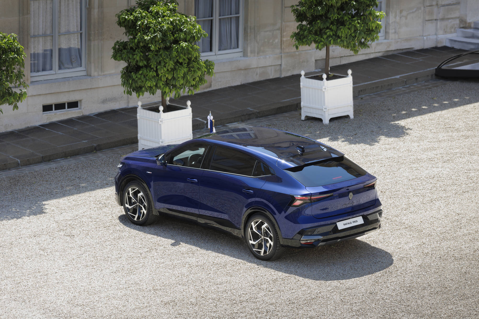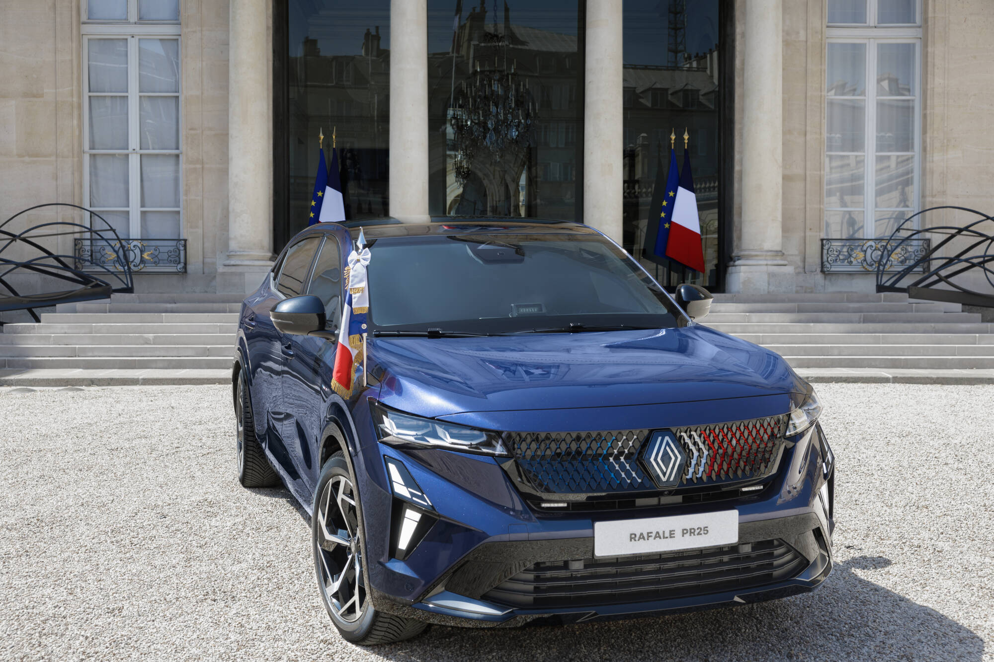 Prezidentská verzia modelu Rafale zaujme harmonickými líniami s jemne zakomponovanými výraznými prvkami, ako sú mriežka chladiča vo farbách francúzskej vlajky, odnímateľné držiaky na vlajky a modro-bielo-červené odznaky na predných dverách. Karoséria v exkluzívnom odtieni Bleu Présidence obsahuje technológiu, ktorá obmedzuje absorpciu tepla až o 10 °C, čím zvyšuje tepelný komfort v interiéri. Lak má navyše trblietavý efekt vo farbách francúzskej trikolóry, ktorý je viditeľný na slnku. Zadné dvere sú vybavené funkciou mäkkého dovierania pre tichú a plynulú prevádzku v súlade s protokolom. Držiaky na vlajky sú diskrétne ukryté za krytkami, čo zabezpečuje decentné a reprezentatívne vystupovanie počas oficiálnych ciest.