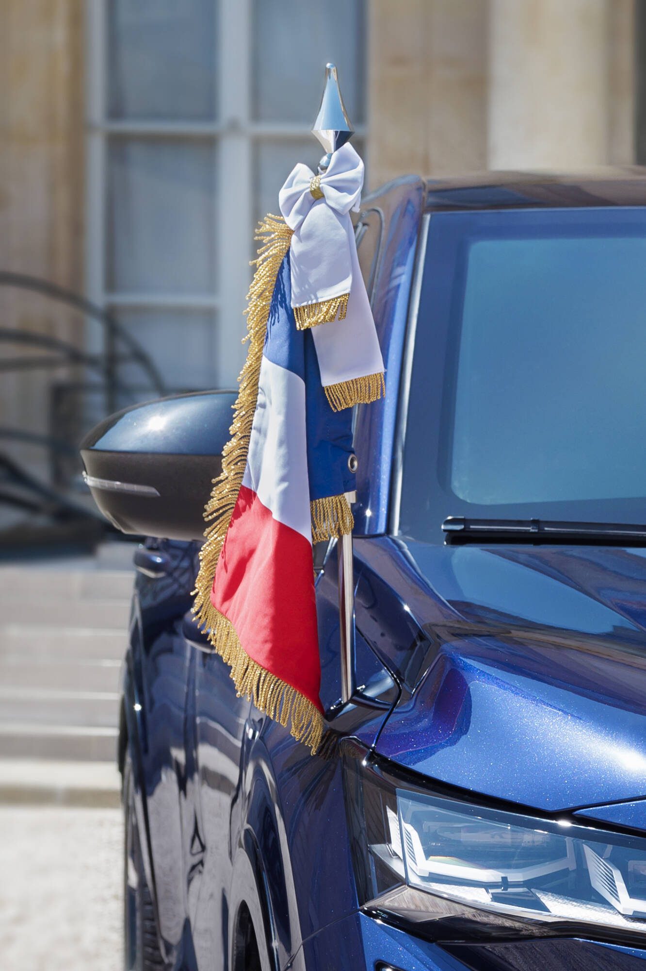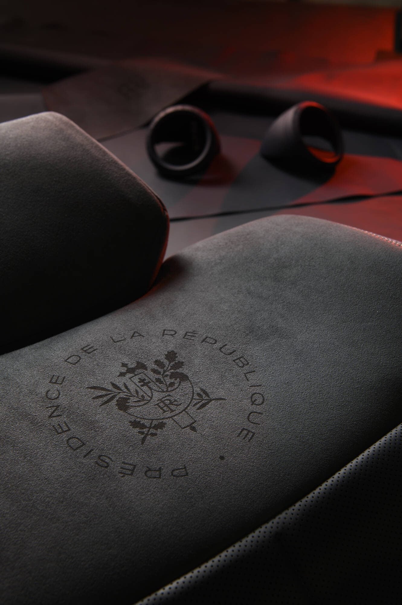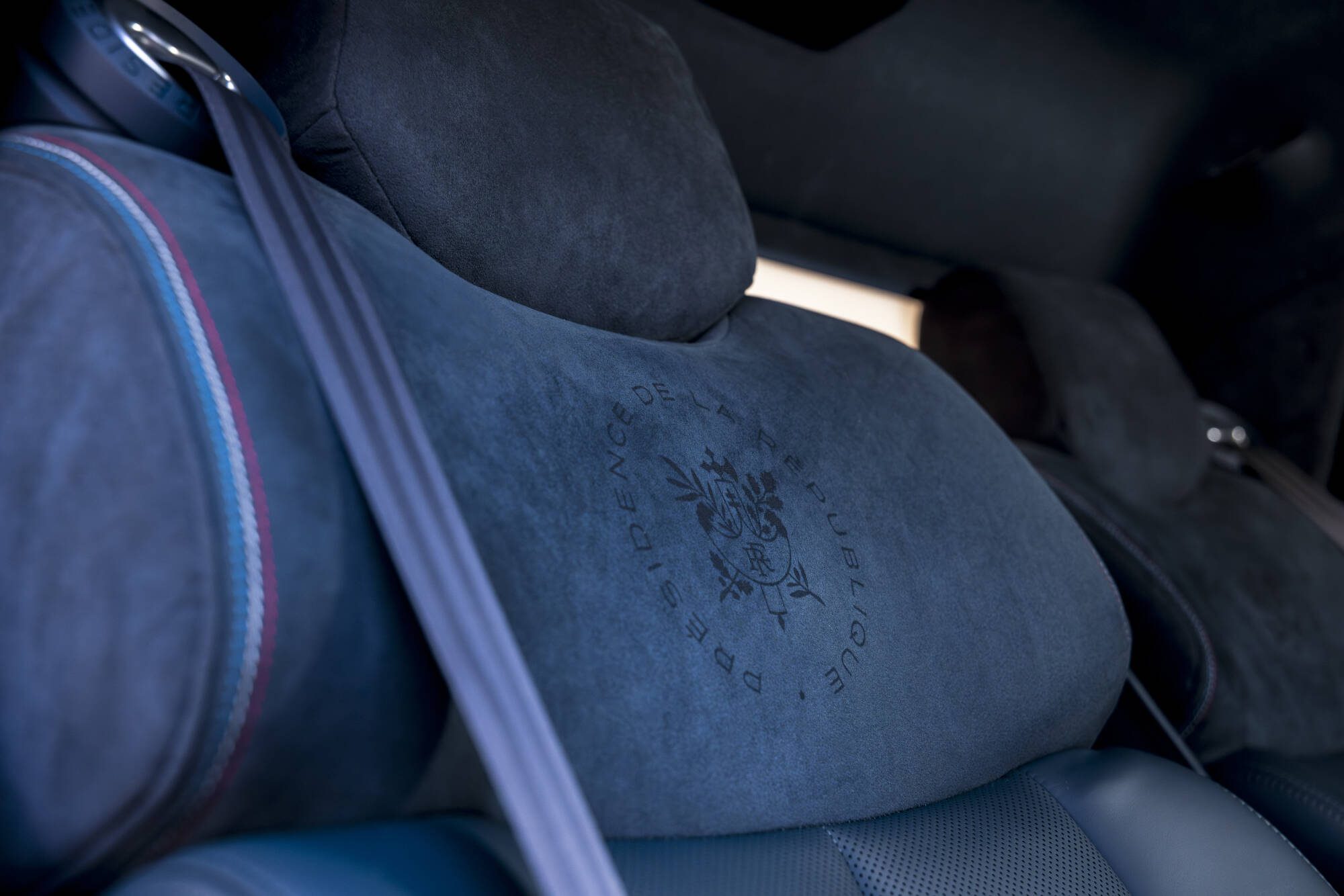 Koža pochádza z vybraných odrezkov a bola prepracovaná do špecifických odtieňov. Modré prešívanie bolo starostlivo zvolené tak, aby zodpovedalo oficiálnej farebnej škále Francúzska. Opierky hlavy zdobí jemná laserová rytina francúzskeho štátneho znaku – pelta s liktorským zväzkom prútov a ratolesťami duba a olivy. Na zadnej strane predných sedadiel sa nachádzajú diskrétne a praktické vrecká na mapy, určené na drobnosti pre pasažierov. Jednou z hlavných výziev bolo zabezpečiť vetranie zadných sedadiel. To si vyžadovalo vysokú úroveň technickej expertízy, aby sa zachoval komfort bez narušenia elegancie celkového dizajnu.