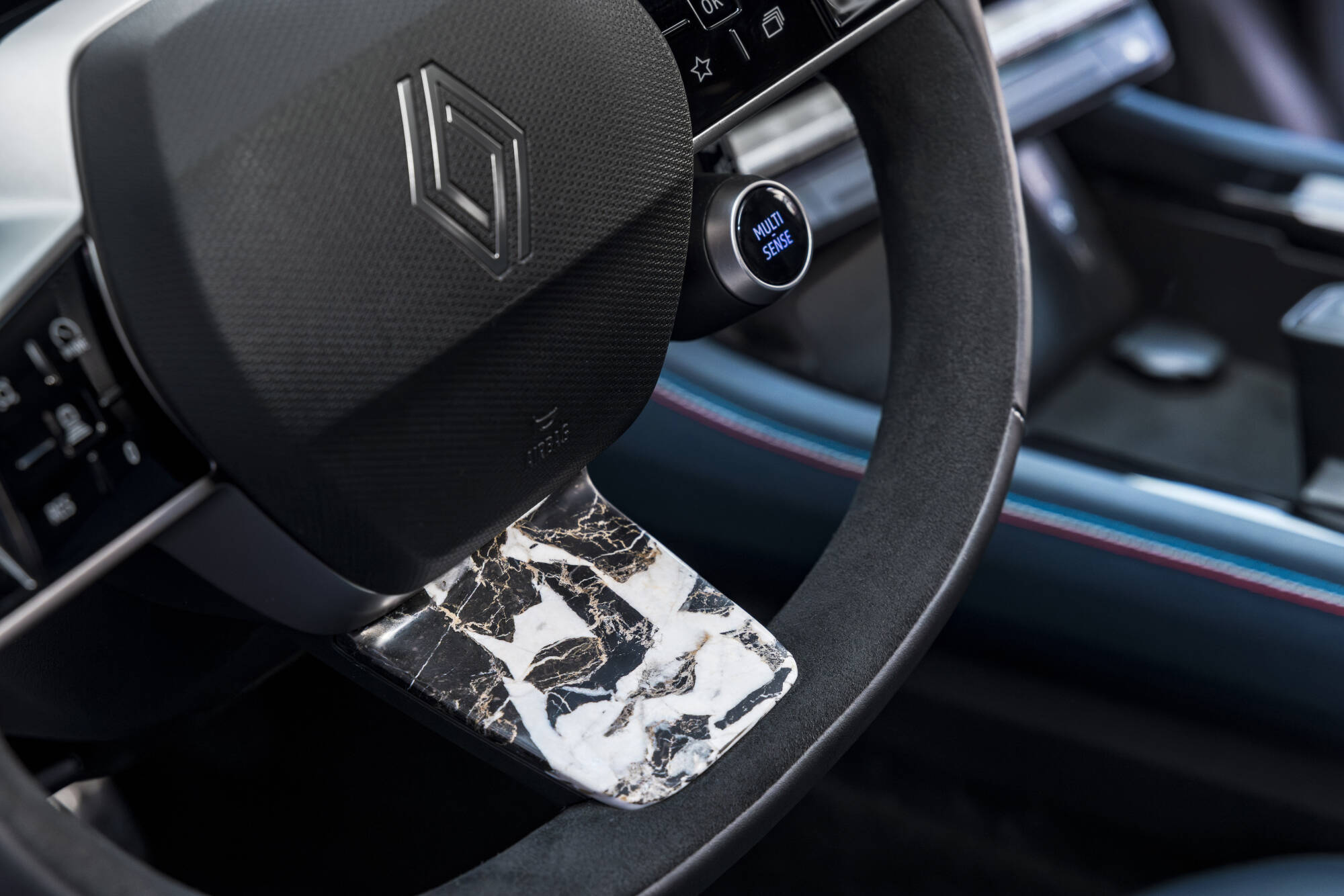 Ako súčasť starostlivého výberového procesu zvolili dizajnéri materiál, ktorý sa v automobilovom svete objavuje len zriedka. Ide o čierny mramor s bielym žilkovaním, ťažený v Pyrenejách. Tento ušľachtilý kameň je decentne zakomponovaný do zadnej stredovej konzoly, palubnej dosky a stredového ramena volantu. Celý proces od výberu mramorových blokov až po ich integráciu do interiéru zastrešila spoločnosť Mineral Expertise, popredná francúzsko-talianska firma špecializujúca sa na opracovanie kameňa. Vďaka svojmu jedinečnému know-how dokázala prispôsobiť tento exkluzívny materiál technickým požiadavkám automobilového priemyslu. Výsledkom je vysoká úroveň jemnosti, pevnosti a odolnosti v súlade so štandardmi značky Renault.