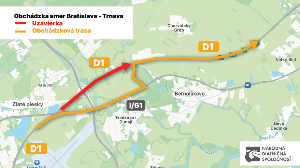 Uzávera výlučne v smere na Trnavu je plánovaná od piatka 17. apríla od 20:00 do nedele 19. apríla večer, pokiaľ nedôjde k výraznej zmene počasia. Diaľnica bude uzatvorená v úseku od Zlatých Pieskov po križovatku Bernolákovo (Triblavina). V opačnom smere, teda do Bratislavy, zostáva doprava bez zmien.