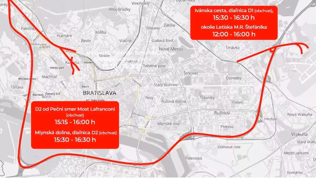 Nedeľa prinesie obmedzenia v Bratislave aj v okolí Letiska M.R.Štefánika od 12:00 do cca 16:00. Diaľnica D2 od Pečni po Most Lafranconi bude obmedzená od 15:00 do 16:00. V rovnakom čase aj nákladná doprava od hraničných priechodov Jarovce – Kittsee a Čunovo – Rajka. Následne od 15:30 do 16:30 budú obmedzenia na Ivánskej ceste, obchvate D1, D2, v Mlynskej doline, Patrónke, Brnianskej a Lesnej. Práve po tejto trase sa bude pápež presúvať.